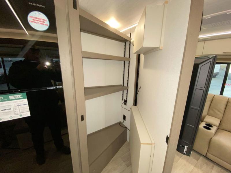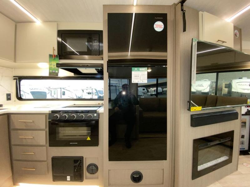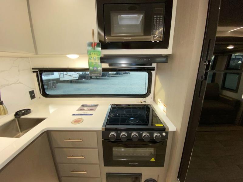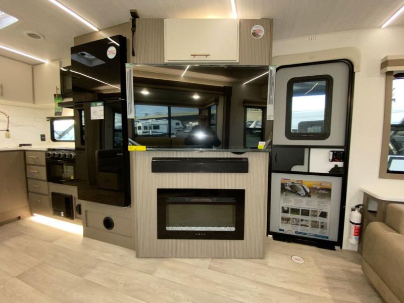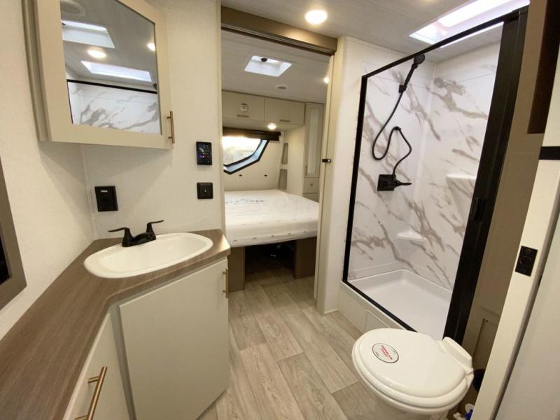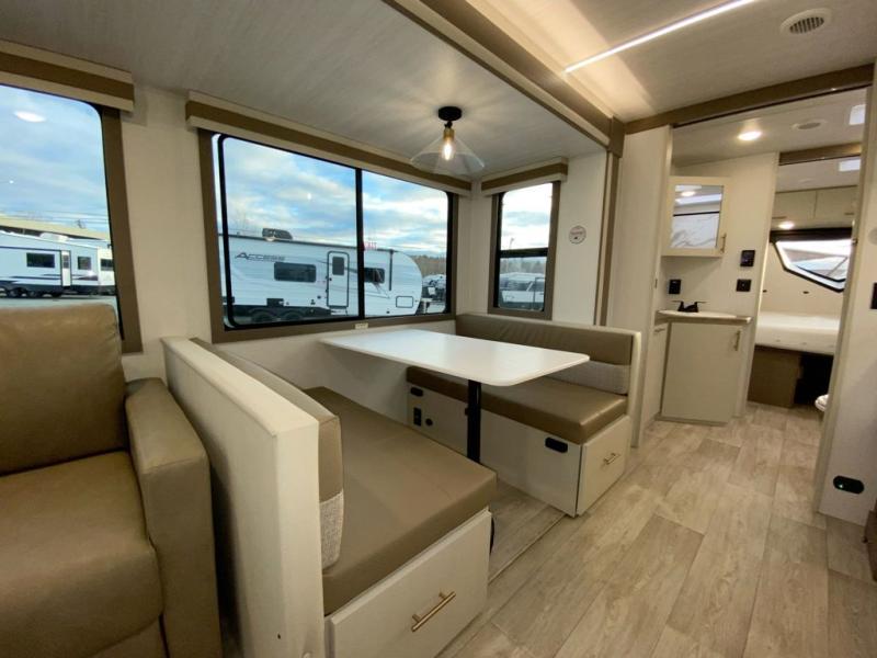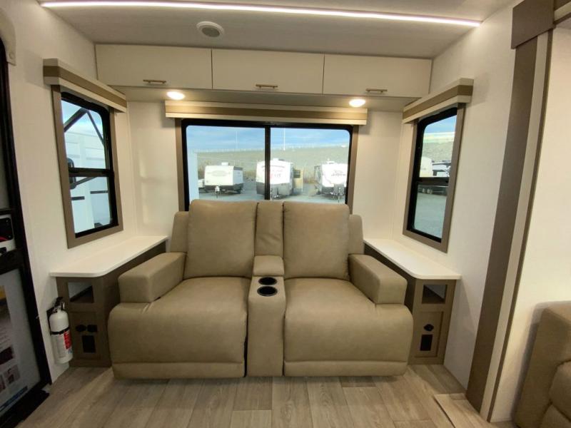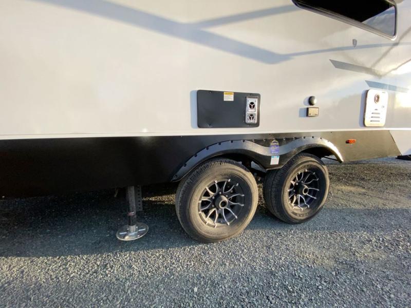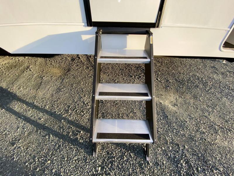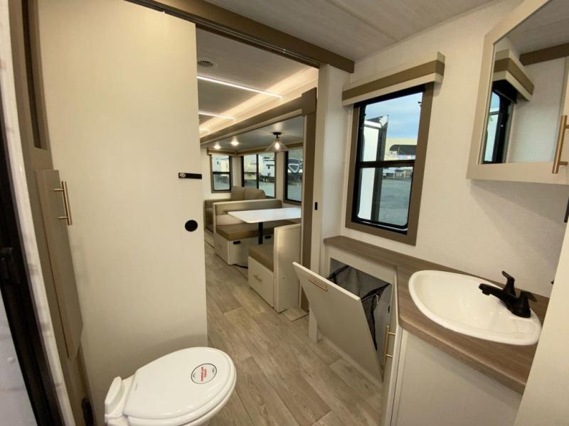 You'll feel right at home in this rear living travel trailer that includes theater seats and a front master bedroom with a king bed. The walk-through bath includes a medicine cabinet and a shower skylight to let natural light in, and the bedroom includes its own exterior entry door for convenience. When you're not relaxing outdoors under the 21' power awning with LED lights, you can play a game at the booth dinette or relax on the tri-fold sofa. This model also includes a pass-through storage for your larger camp gear and a universal docking station for easy access to your hookups.