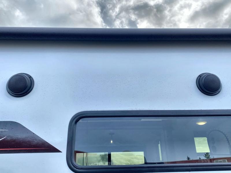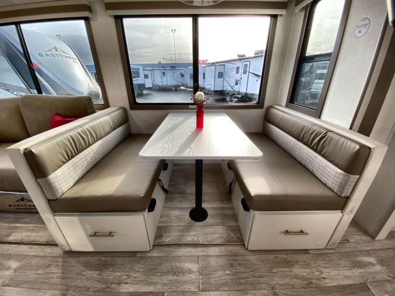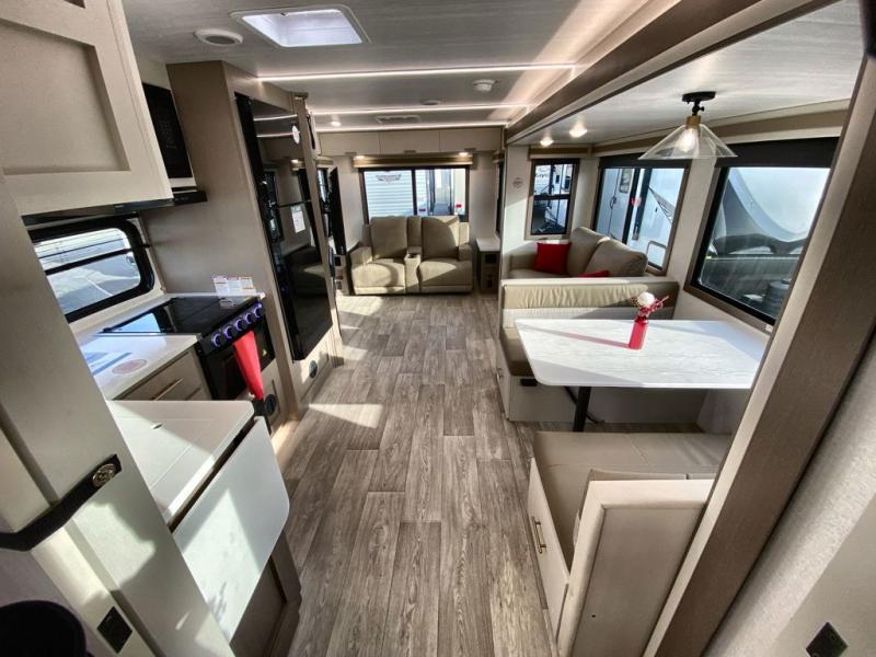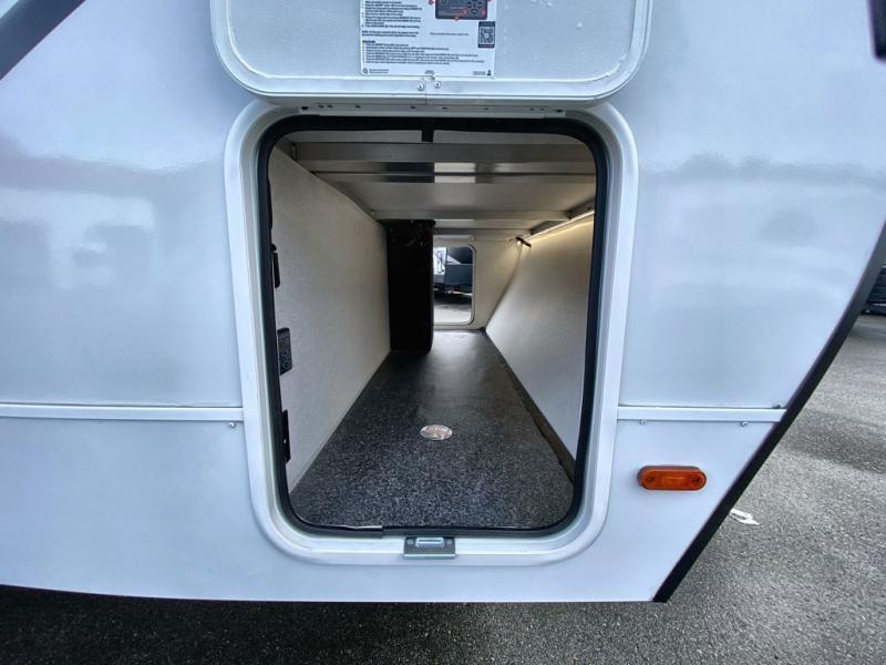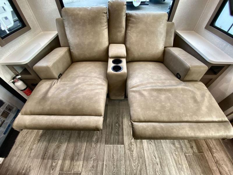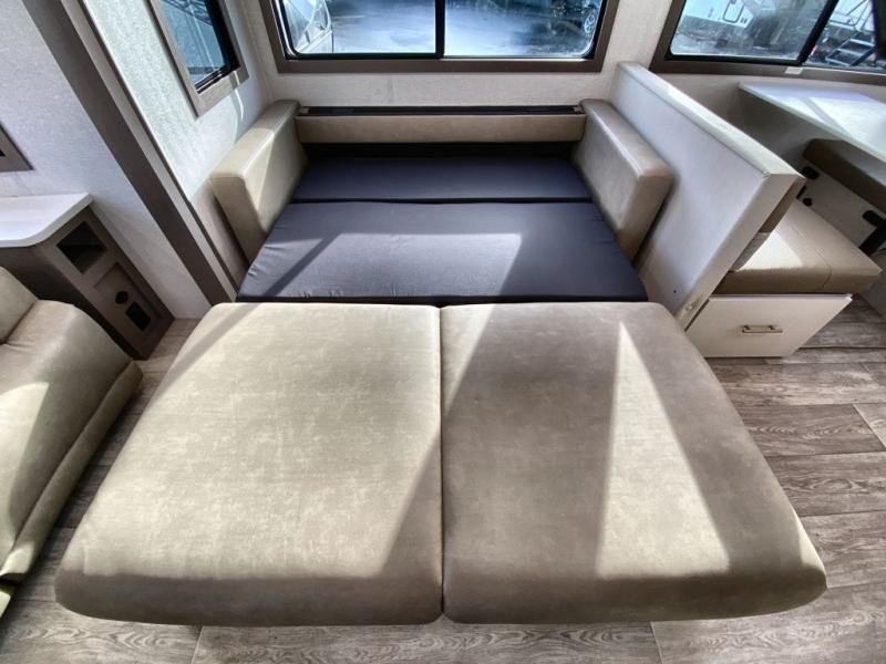 You'll feel right at home in this rear living travel trailer that includes theater seats and a front master bedroom with a king bed. The walk-through bath includes a medicine cabinet and a shower skylight to let natural light in, and the bedroom includes its own exterior entry door for convenience. When you're not relaxing outdoors under the 21' power awning with LED lights, you can play a game at the booth dinette or relax on the tri-fold sofa. This model also includes a pass-through storage for your larger camp gear and a universal docking station for easy access to your hookups.