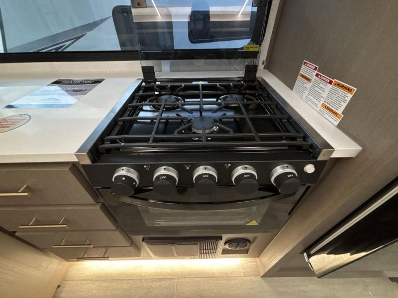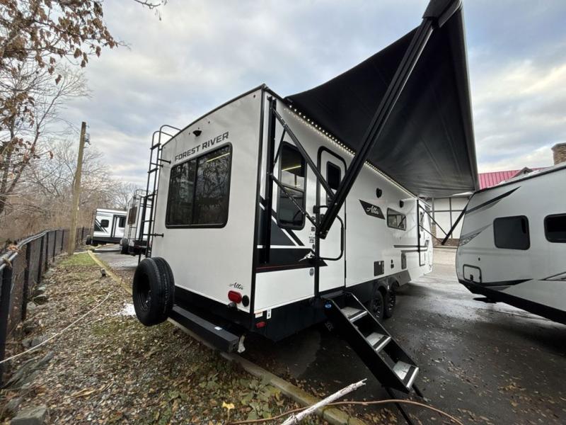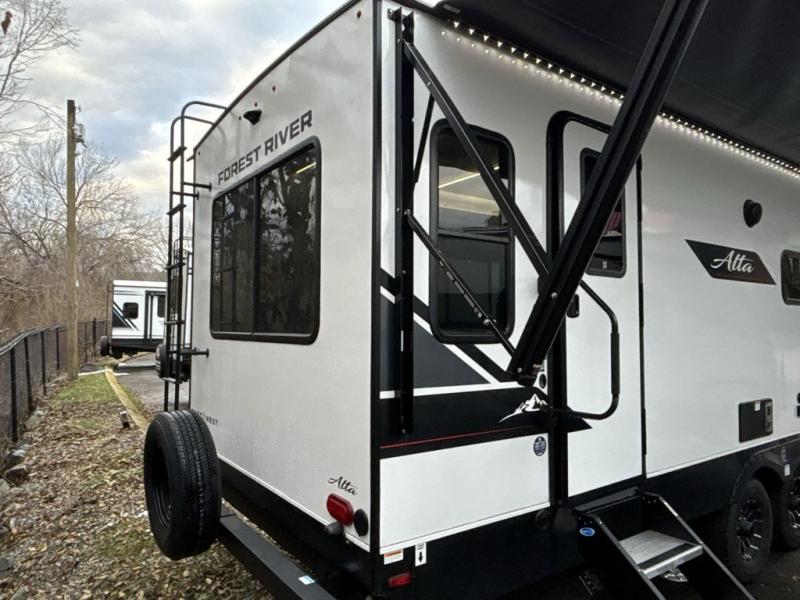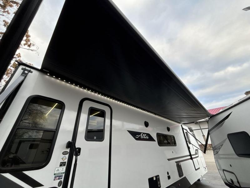 Each Alta travel trailer or toy hauler by EAST TO WEST is constructed with a 5" vacuum bonded roof, an enclosed and heated underbelly, and diamond plate front rock guard for added protection. Outside, you'll find marine-grade exterior speakers, a universal docking station, and back-up camera prep that can be added to make maneuvering in and out of campgrounds easier than ever. Inside, there are 4k interior LED lights, solid pressed membrane countertops, black roller shades, and many more interior comforts you are sure to love.