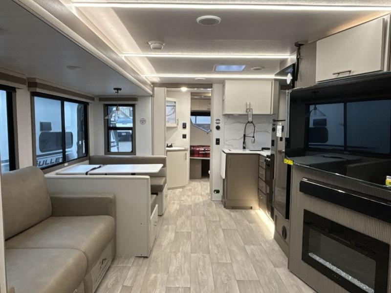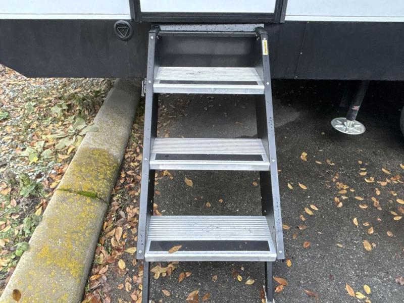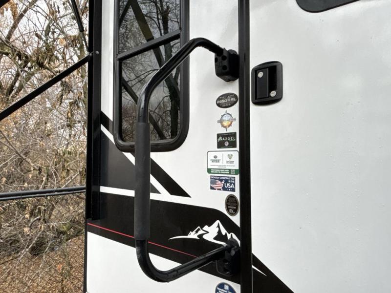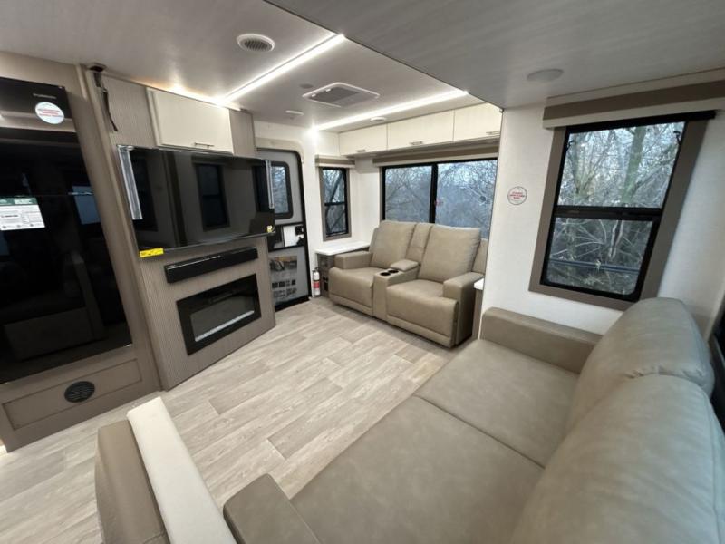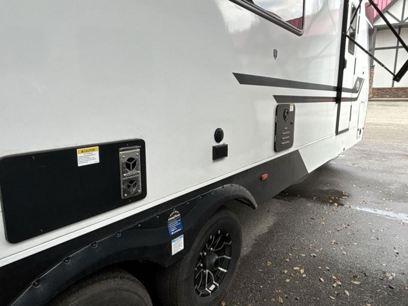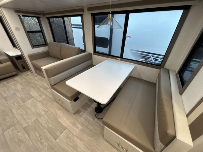 You'll feel right at home in this rear living travel trailer that includes theater seats and a front master bedroom with a king bed. The walk-through bath includes a medicine cabinet and a shower skylight to let natural light in, and the bedroom includes its own exterior entry door for convenience. When you're not relaxing outdoors under the 21' power awning with LED lights, you can play a game at the booth dinette or relax on the tri-fold sofa. This model also includes a pass-through storage for your larger camp gear and a universal docking station for easy access to your hookups.