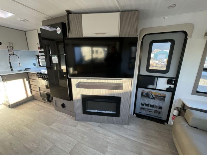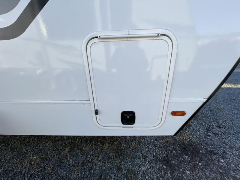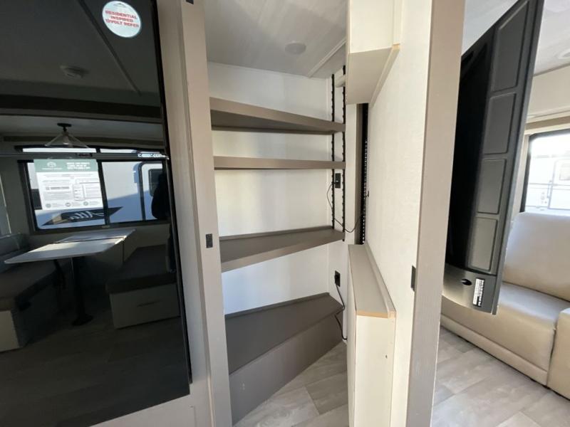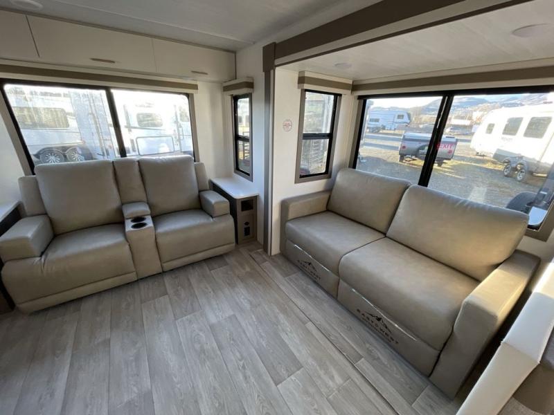 You'll feel right at home in this rear living travel trailer that includes theater seats and a front master bedroom with a king bed. The walk-through bath includes a medicine cabinet and a shower skylight to let natural light in, and the bedroom includes its own exterior entry door for convenience. When you're not relaxing outdoors under the 21' power awning with LED lights, you can play a game at the booth dinette or relax on the tri-fold sofa. This model also includes a pass-through storage for your larger camp gear and a universal docking station for easy access to your hookups.