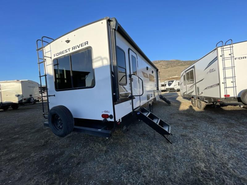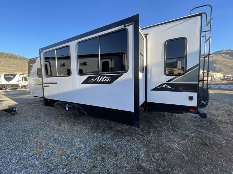 Each Alta travel trailer or toy hauler by EAST TO WEST is constructed with a 5" vacuum bonded roof, an enclosed and heated underbelly, and diamond plate front rock guard for added protection. Outside, you'll find marine-grade exterior speakers, a universal docking station, and back-up camera prep that can be added to make maneuvering in and out of campgrounds easier than ever. Inside, there are 4k interior LED lights, solid pressed membrane countertops, black roller shades, and many more interior comforts you are sure to love.