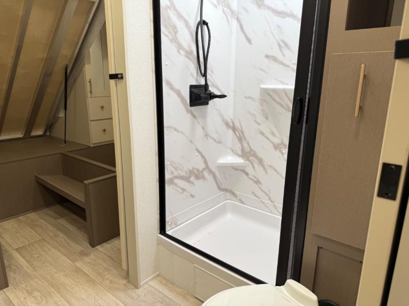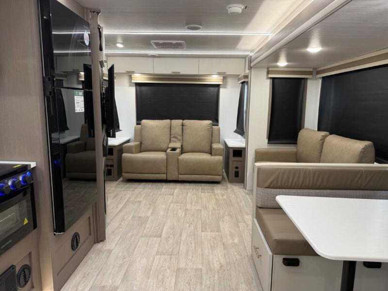 You'll feel right at home in this rear living travel trailer that includes theater seats and a front master bedroom with a king bed. The walk-through bath includes a medicine cabinet and a shower skylight to let natural light in, and the bedroom includes its own exterior entry door for convenience. When you're not relaxing outdoors under the 21' power awning with LED lights, you can play a game at the booth dinette or relax on the tri-fold sofa. This model also includes a pass-through storage for your larger camp gear and a universal docking station for easy access to your hookups.