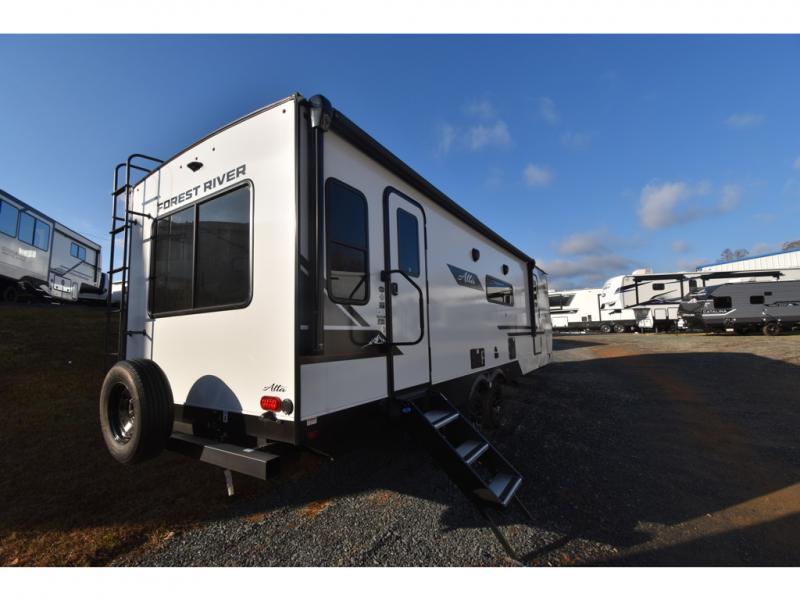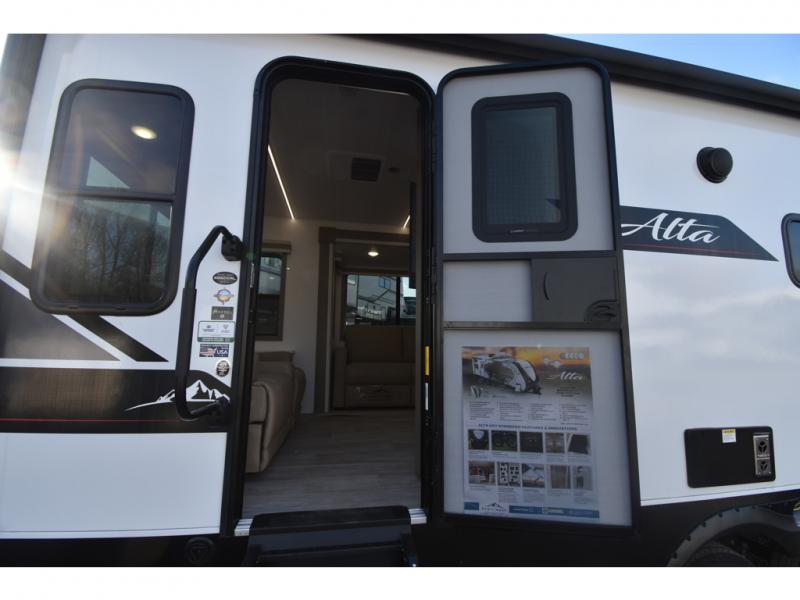 Each Alta travel trailer or toy hauler by EAST TO WEST is constructed with a 5" vacuum bonded roof, an enclosed and heated underbelly, and diamond plate front rock guard for added protection. Outside, you'll find marine-grade exterior speakers, a universal docking station, and back-up camera prep that can be added to make maneuvering in and out of campgrounds easier than ever. Inside, there are 4k interior LED lights, solid pressed membrane countertops, black roller shades, and many more interior comforts you are sure to love.