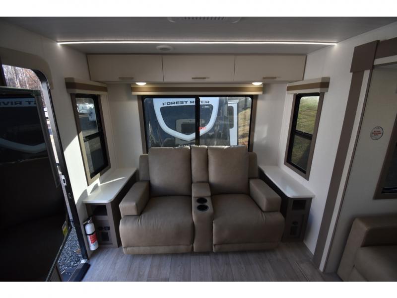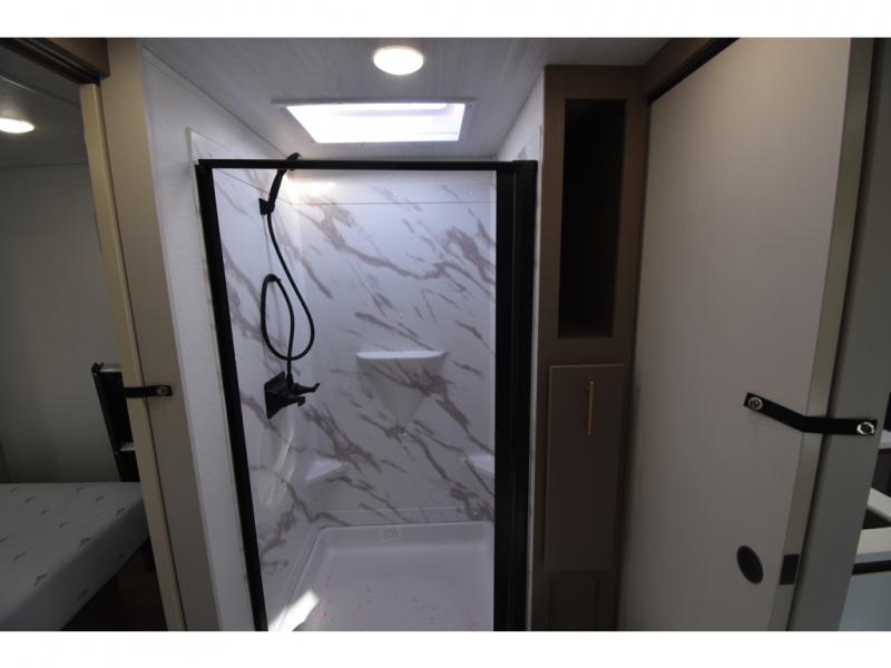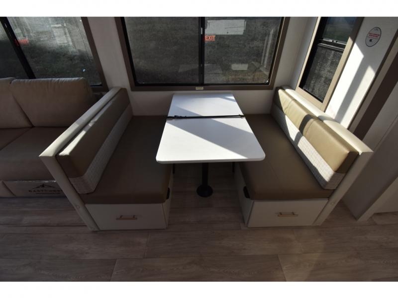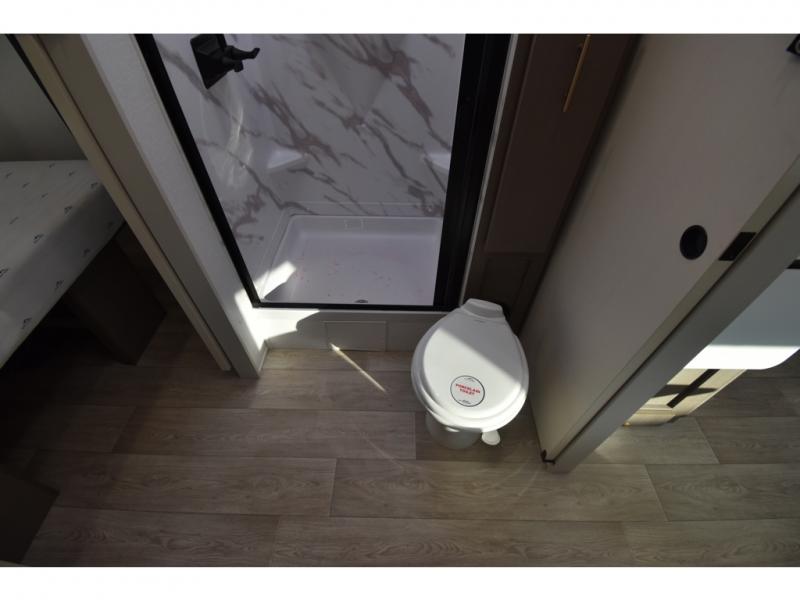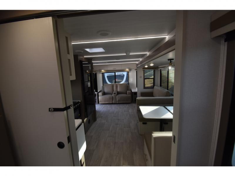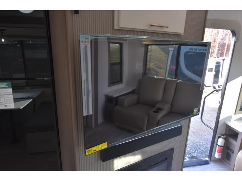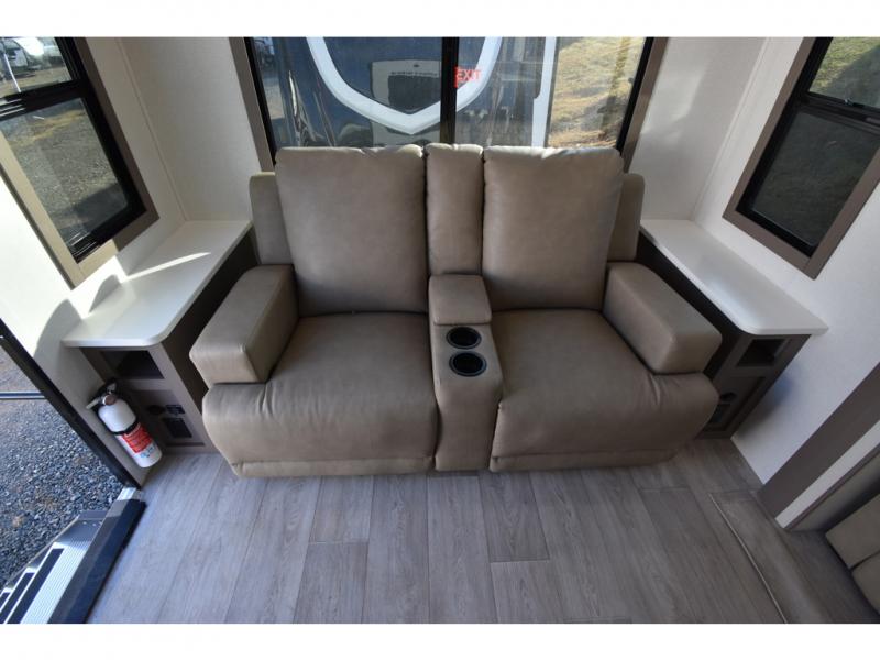 You'll feel right at home in this rear living travel trailer that includes theater seats and a front master bedroom with a king bed. The walk-through bath includes a medicine cabinet and a shower skylight to let natural light in, and the bedroom includes its own exterior entry door for convenience. When you're not relaxing outdoors under the 21' power awning with LED lights, you can play a game at the booth dinette or relax on the tri-fold sofa. This model also includes a pass-through storage for your larger camp gear and a universal docking station for easy access to your hookups.