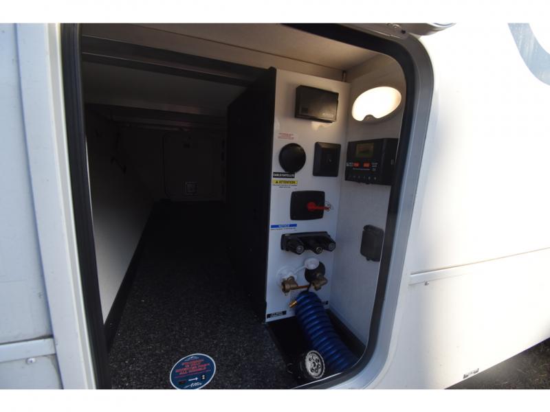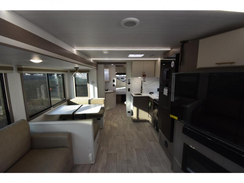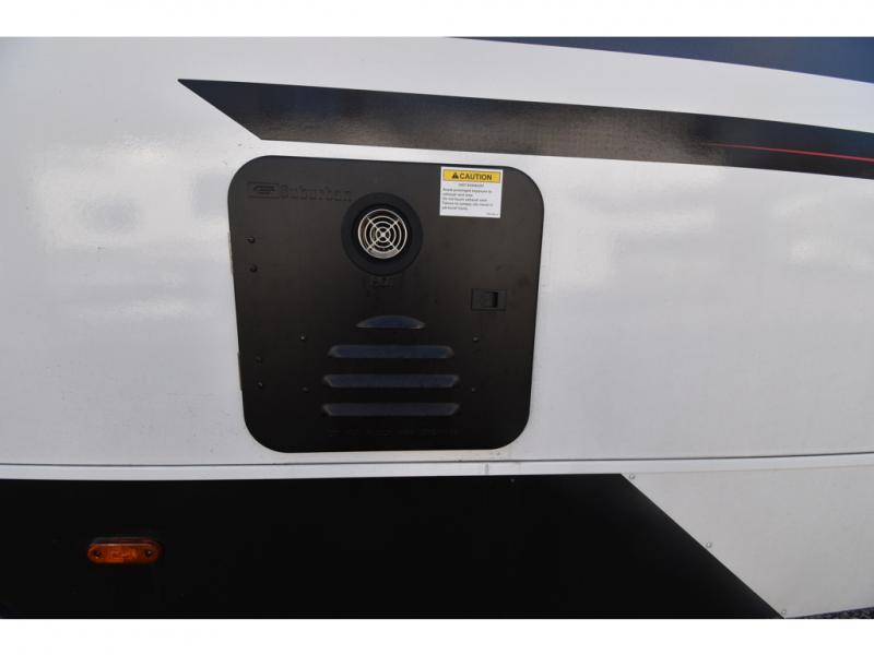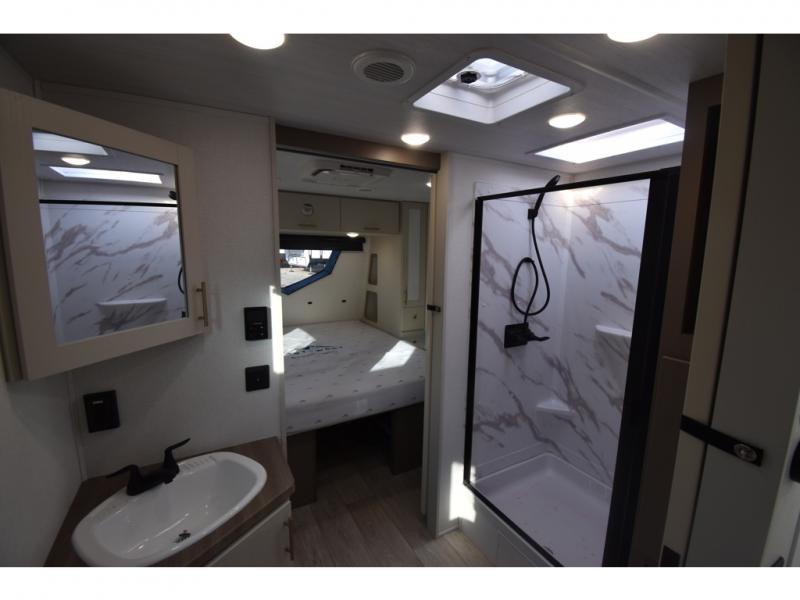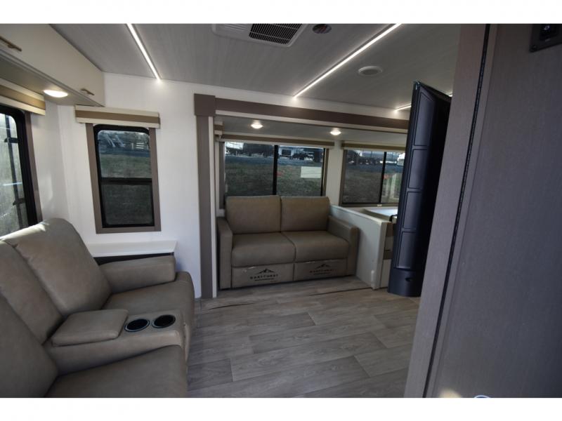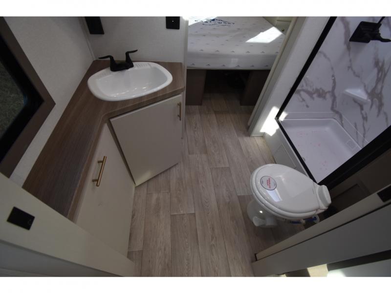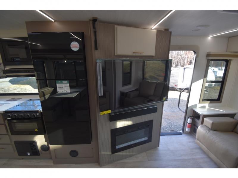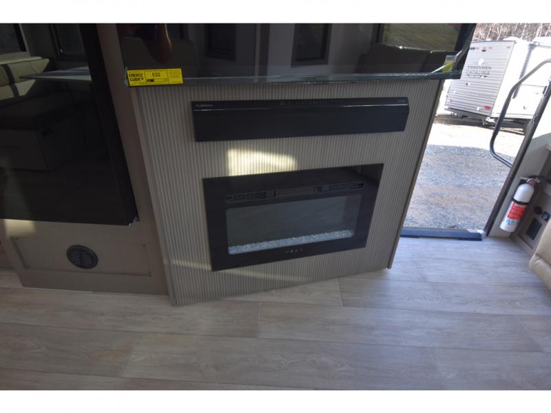 You'll feel right at home in this rear living travel trailer that includes theater seats and a front master bedroom with a king bed. The walk-through bath includes a medicine cabinet and a shower skylight to let natural light in, and the bedroom includes its own exterior entry door for convenience. When you're not relaxing outdoors under the 21' power awning with LED lights, you can play a game at the booth dinette or relax on the tri-fold sofa. This model also includes a pass-through storage for your larger camp gear and a universal docking station for easy access to your hookups.