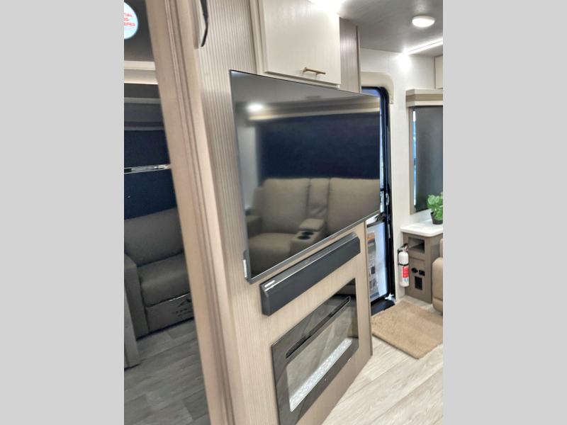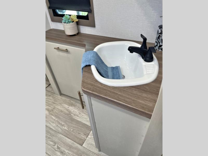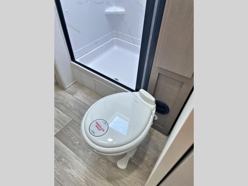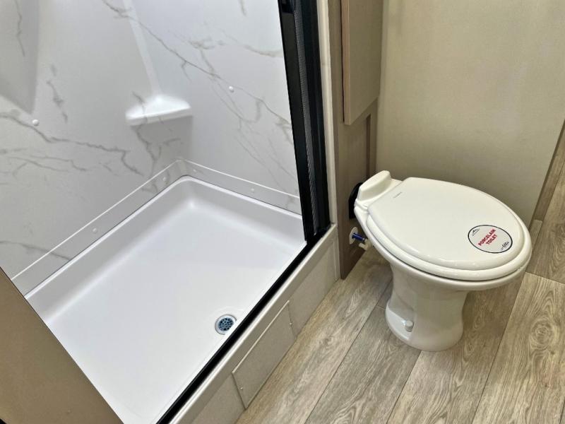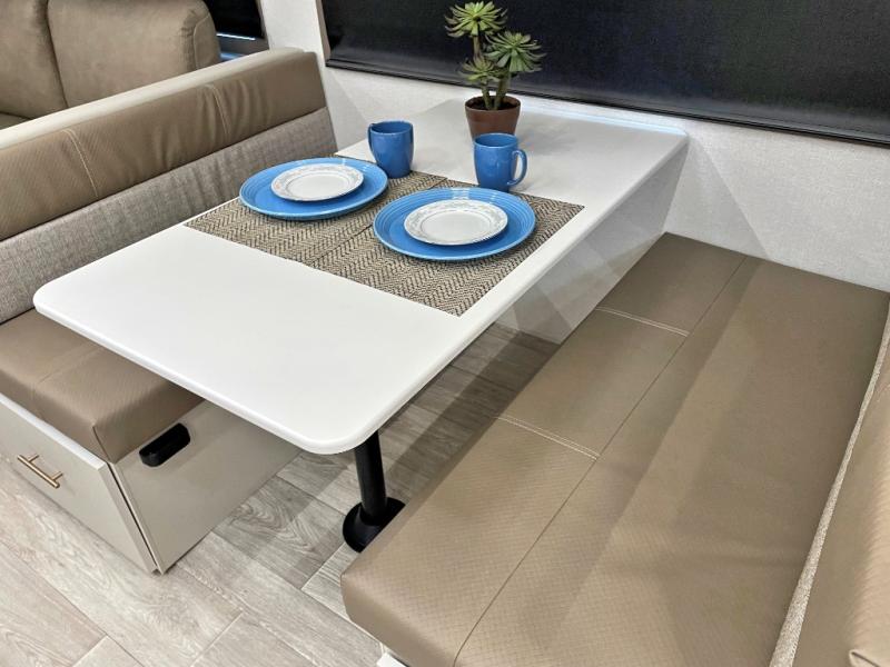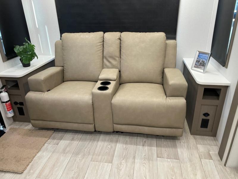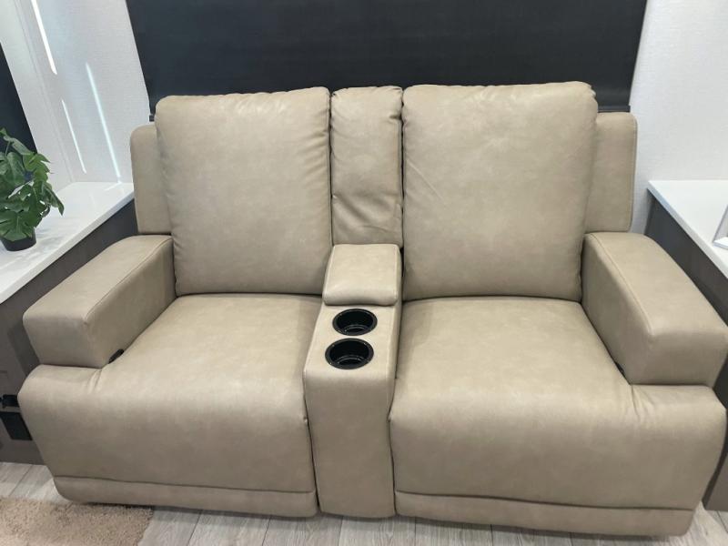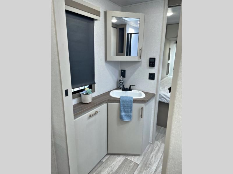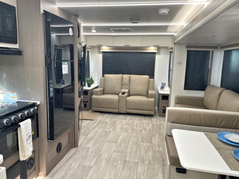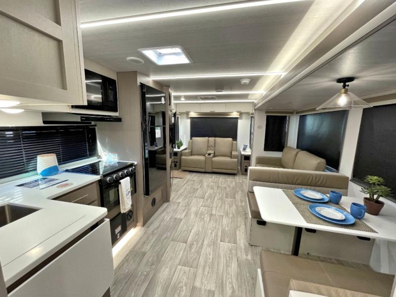 You'll feel right at home in this rear living travel trailer that includes theater seats and a front master bedroom with a king bed. The walk-through bath includes a medicine cabinet and a shower skylight to let natural light in, and the bedroom includes its own exterior entry door for convenience. When you're not relaxing outdoors under the 21' power awning with LED lights, you can play a game at the booth dinette or relax on the tri-fold sofa. This model also includes a pass-through storage for your larger camp gear and a universal docking station for easy access to your hookups.