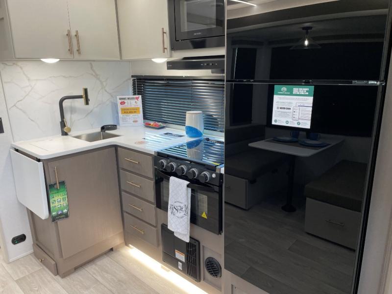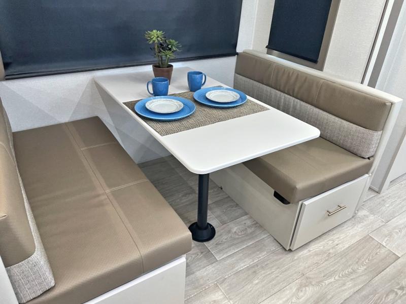 Each Alta travel trailer or toy hauler by EAST TO WEST is constructed with a 5" vacuum bonded roof, an enclosed and heated underbelly, and diamond plate front rock guard for added protection. Outside, you'll find exterior LED lights, a universal docking station, and back-up camera prep that can be added to make maneuvering in and out of campgrounds easier than ever. Inside, there are upgraded residential-inspired linoleum flooring, solid pressed membrane countertops, black roller shades, and many more interior comforts you are sure to love.