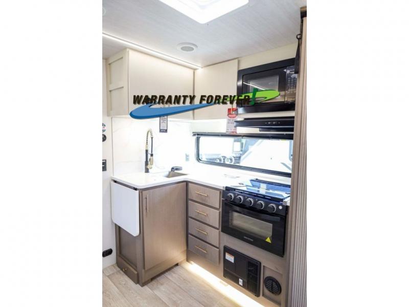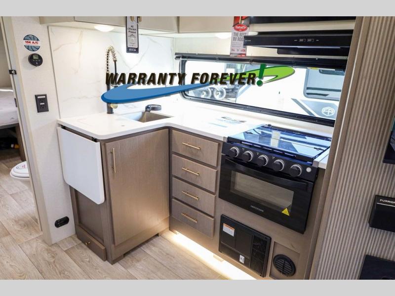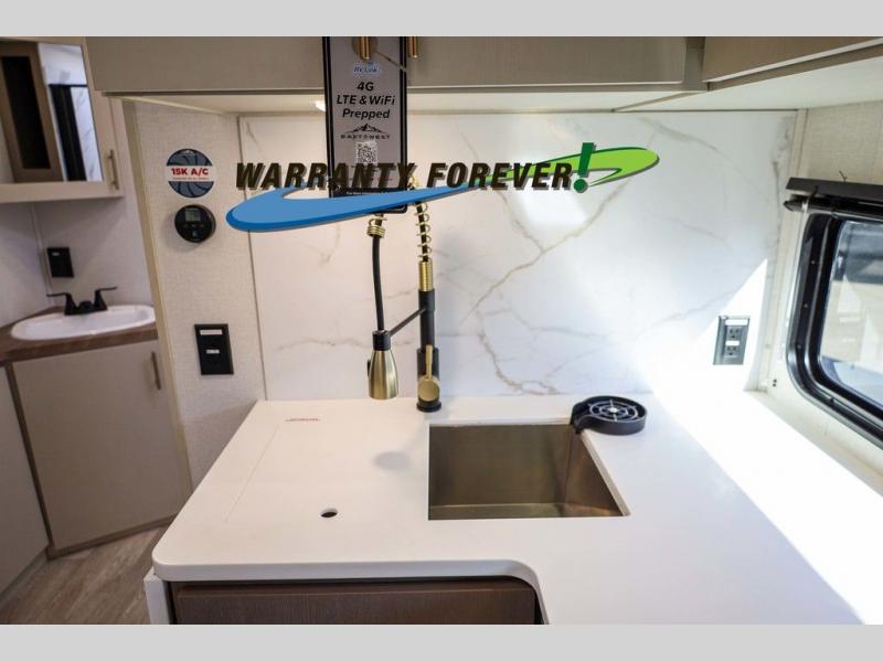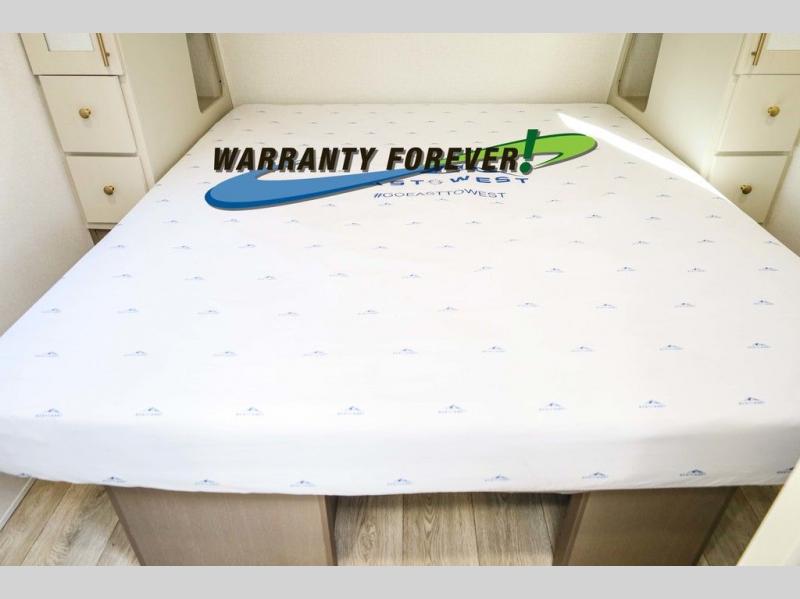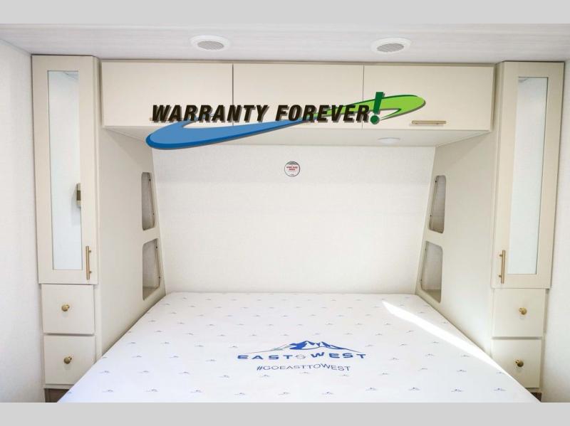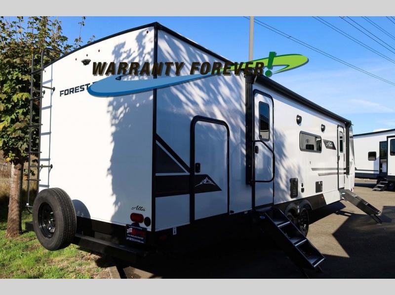 Each Alta travel trailer or toy hauler by EAST TO WEST is constructed with a 5" vacuum bonded roof, an enclosed and heated underbelly, and diamond plate front rock guard for added protection. Outside, you'll find marine-grade exterior speakers, a universal docking station, and back-up camera prep that can be added to make maneuvering in and out of campgrounds easier than ever. Inside, there are 4k interior LED lights, solid pressed membrane countertops, black roller shades, and many more interior comforts you are sure to love.