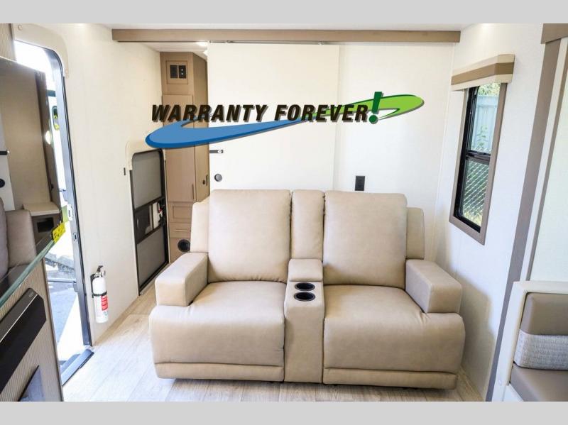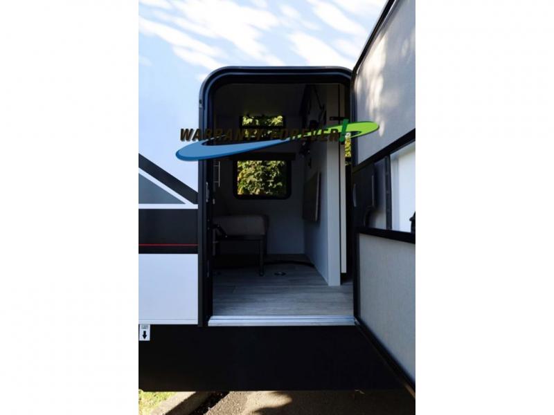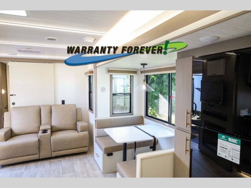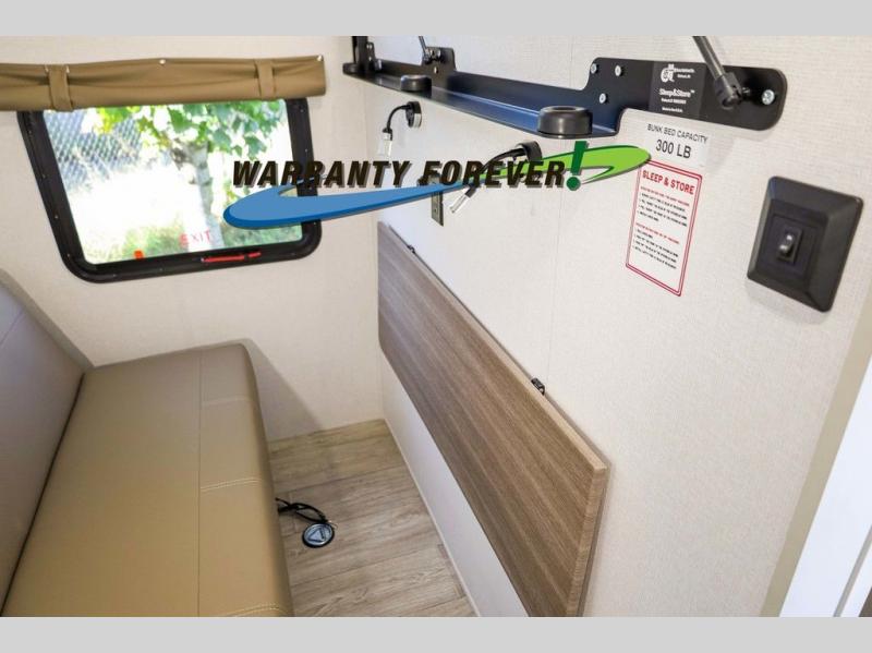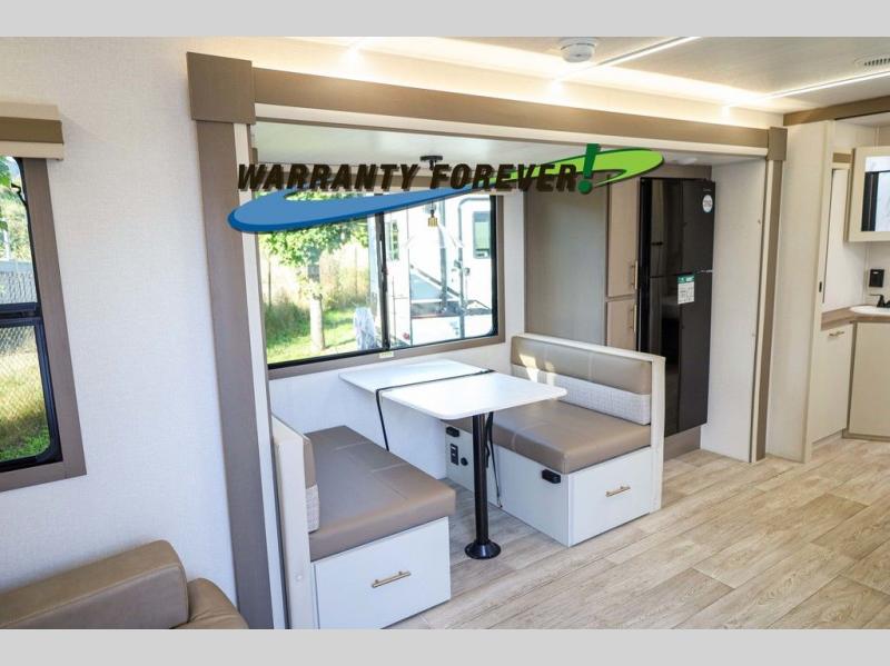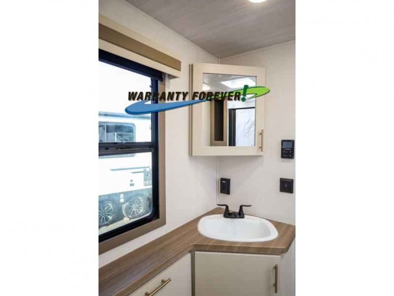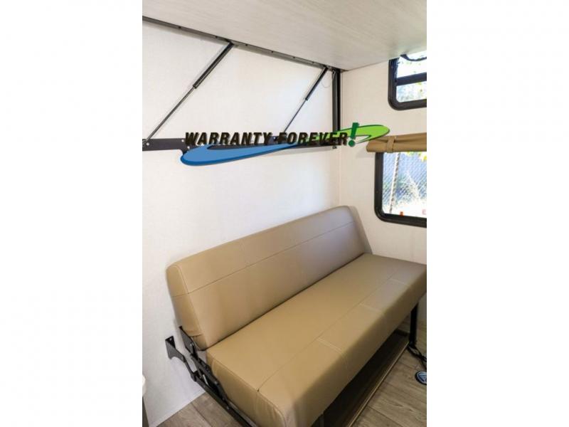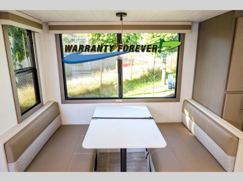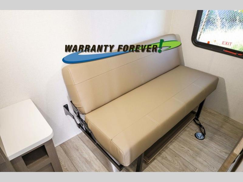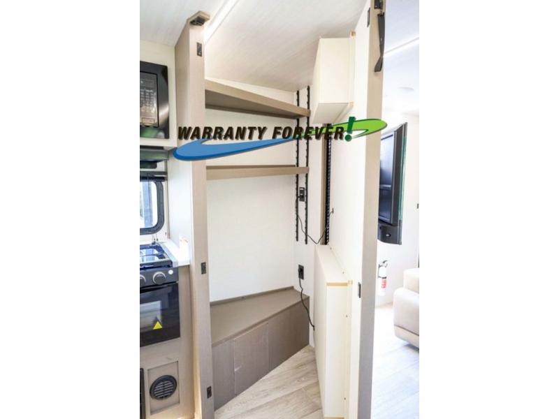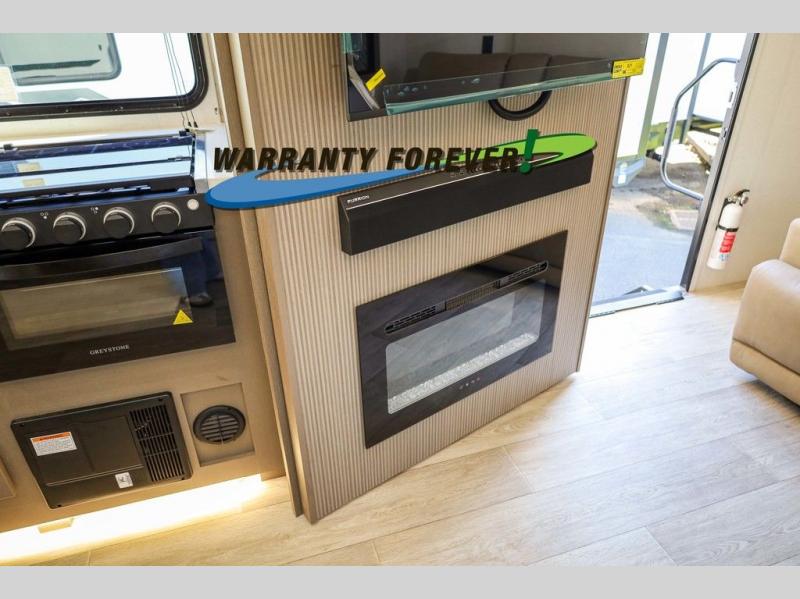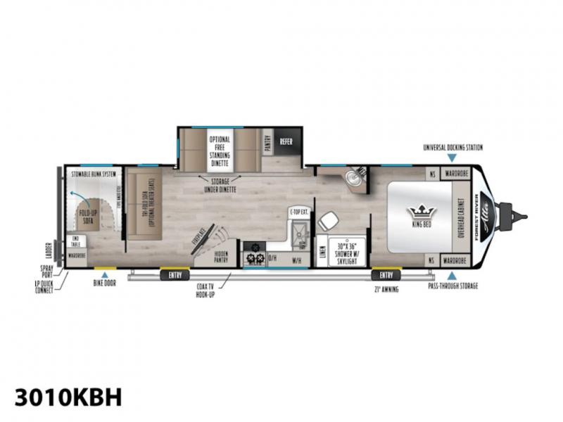 You can comfortably sleep seven to eight in this travel trailer thanks to the rear private bunkhouse with a stowable bunk system. There is also a bike door here so you can easily pack in gear. The combined living area and kitchen includes a large slide for more space, a booth dinette with an optional free-standing dinette, plus a tri-fold sofa with an optional theater seat if you're not needing additional sleeping space. There is also a fireplace with a hidden pantry behind to keep snacks stocked. A walk-thru bath will create a front master bedroom you are sure to enjoy. Here, you'll find a king bed with dual wardrobes and nightstands, overhead cabinetry, and one of the dual entry doors to the unit!