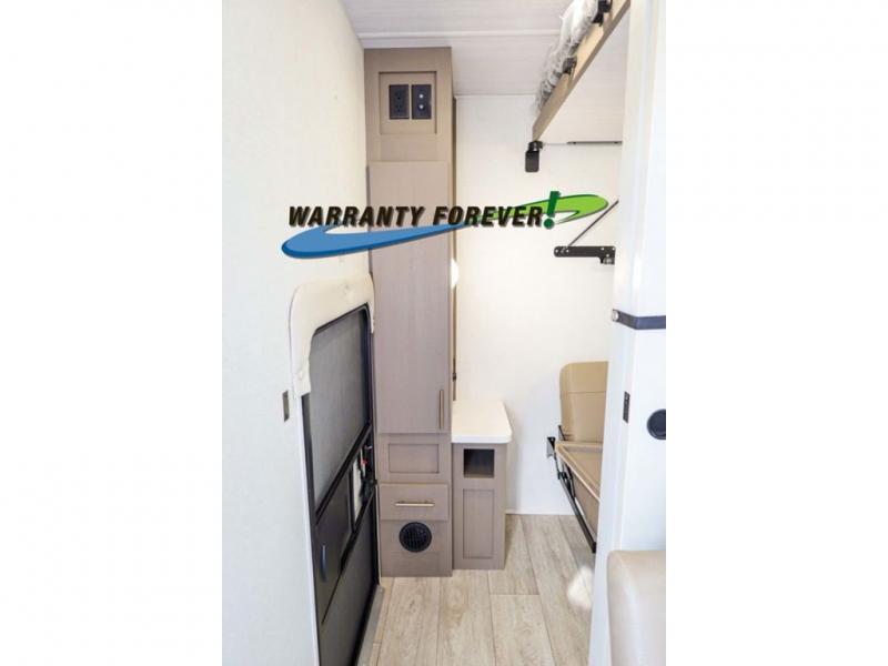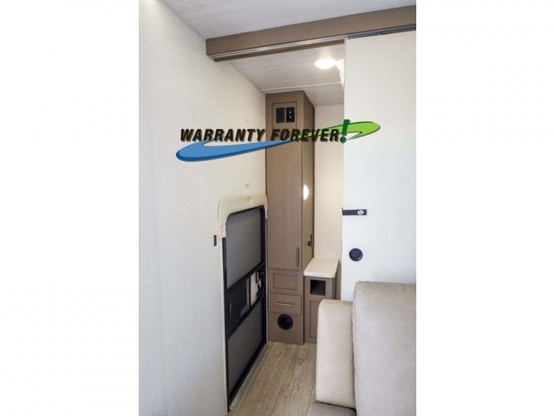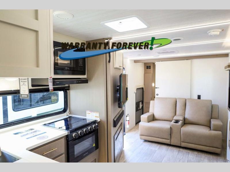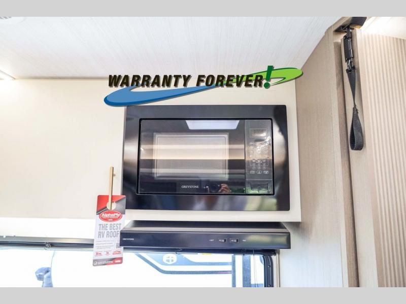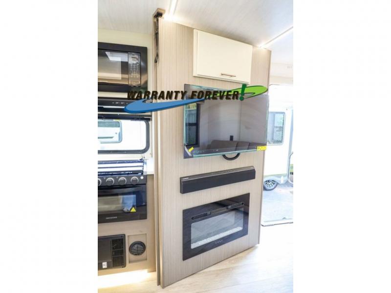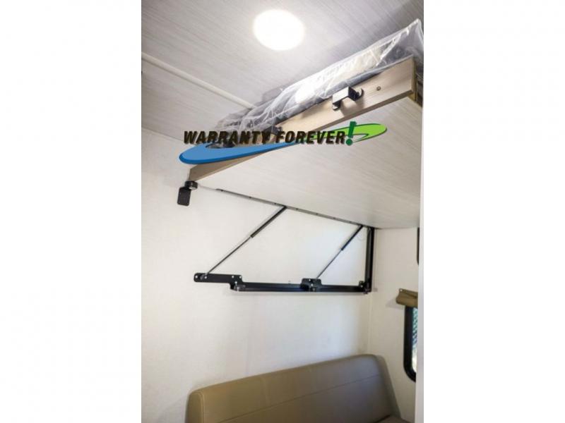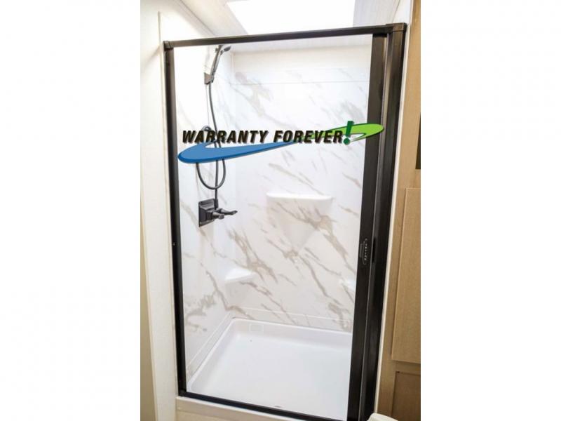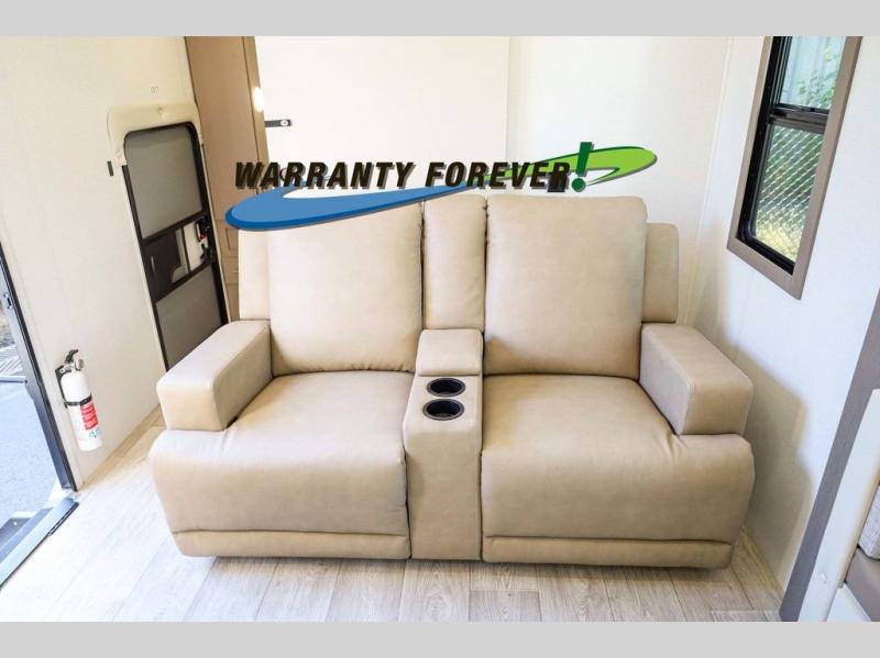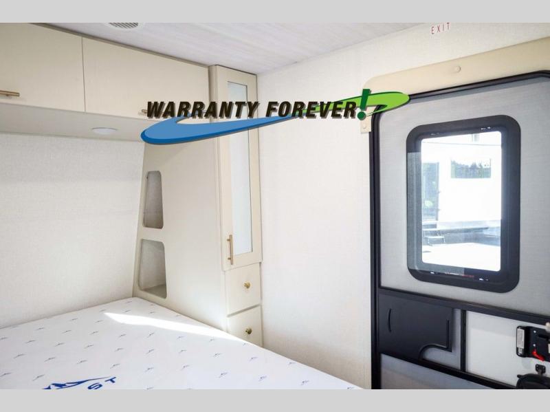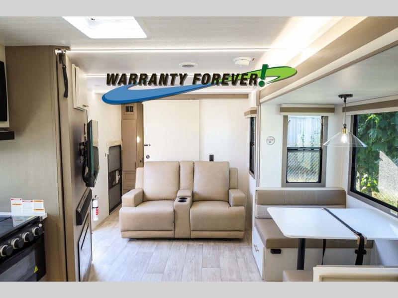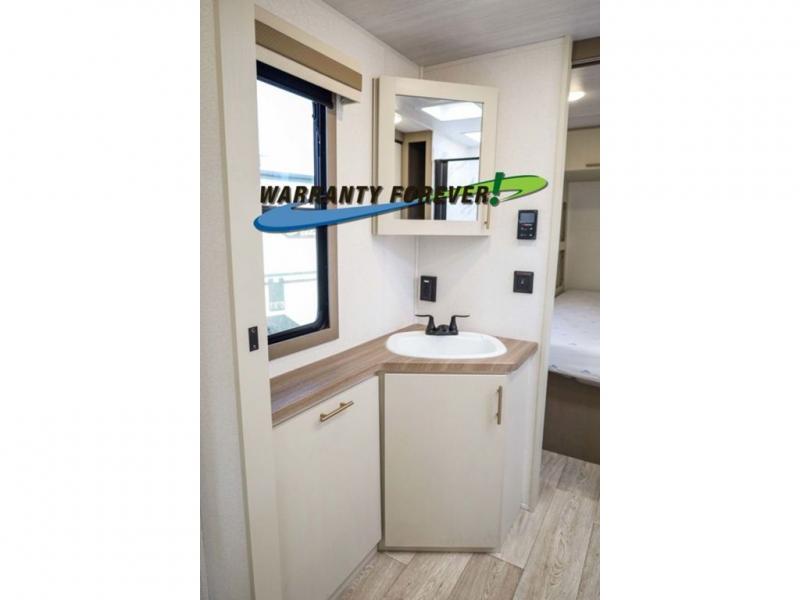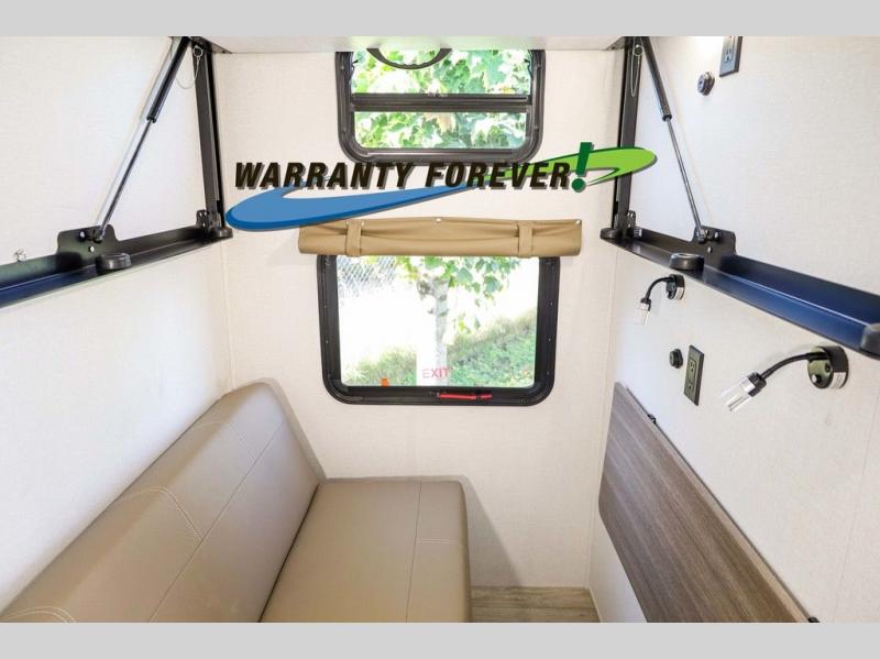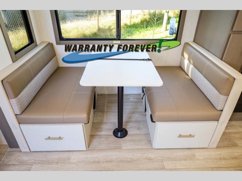 You can comfortably sleep seven to eight in this travel trailer thanks to the rear private bunkhouse with a stowable bunk system. There is also a bike door here so you can easily pack in gear. The combined living area and kitchen includes a large slide for more space, a booth dinette with an optional free-standing dinette, plus a tri-fold sofa with an optional theater seat if you're not needing additional sleeping space. There is also a fireplace with a hidden pantry behind to keep snacks stocked. A walk-thru bath will create a front master bedroom you are sure to enjoy. Here, you'll find a king bed with dual wardrobes and nightstands, overhead cabinetry, and one of the dual entry doors to the unit!