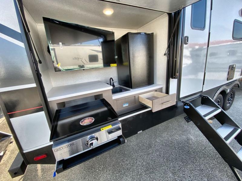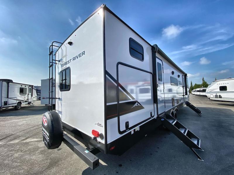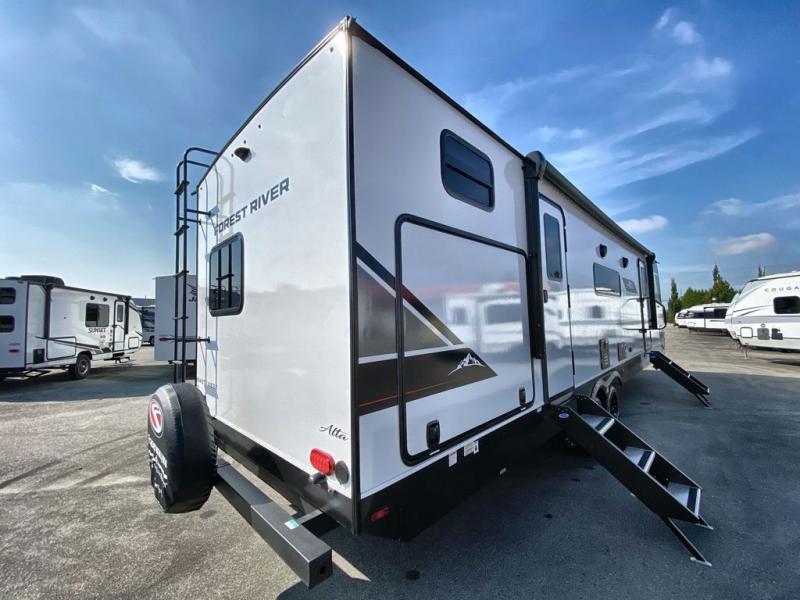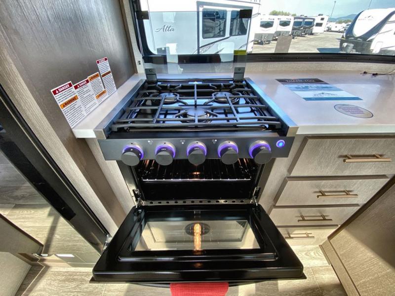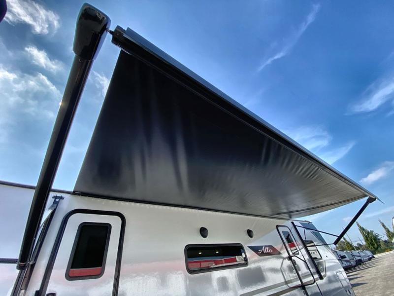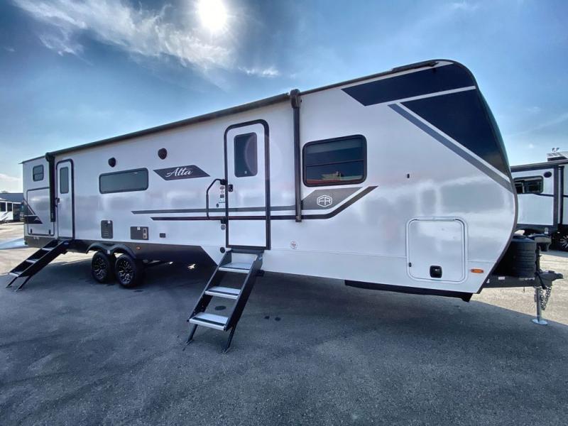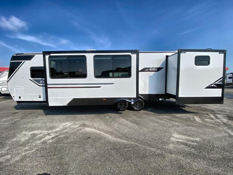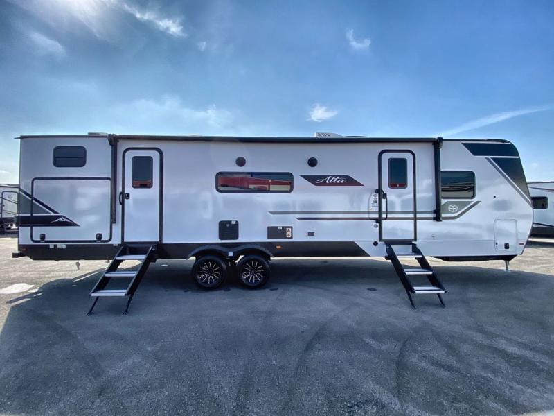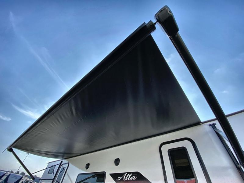If you're looking for a travel trailer to take tailgating, this Alta model is the one! After you've unloaded the pass-through storage and set up the 21' power awning, start lunch on the outside kitchen! Since there are dual entry doors you can enter in through the main living area, or the full bath for convenience. The little ones are sure to spend most of their time in the rear bunkhouse that includes a flip-up bunk under the sofa, plus a second bunk across the room. The adults can visit at the booth dinette or on the tri-fold sofa, and check out the front private bedroom with sliding doors and a king bed for all-around comfort!