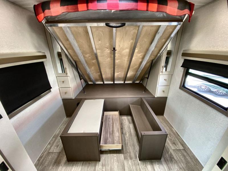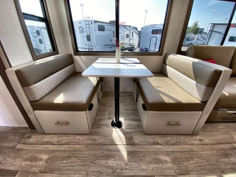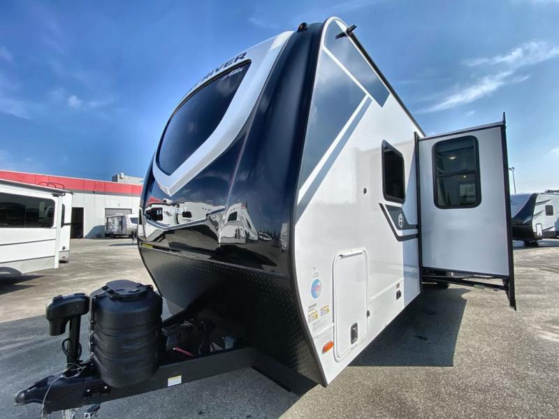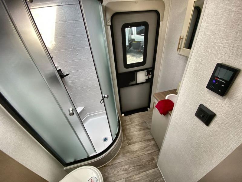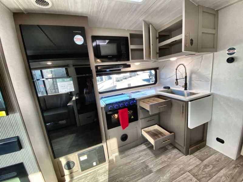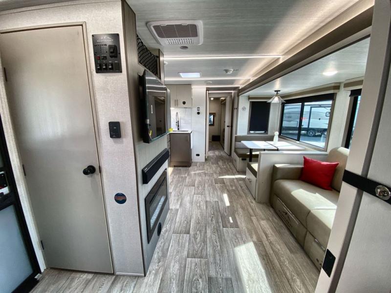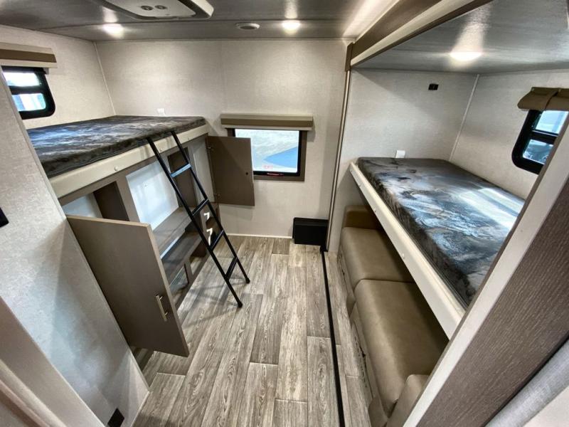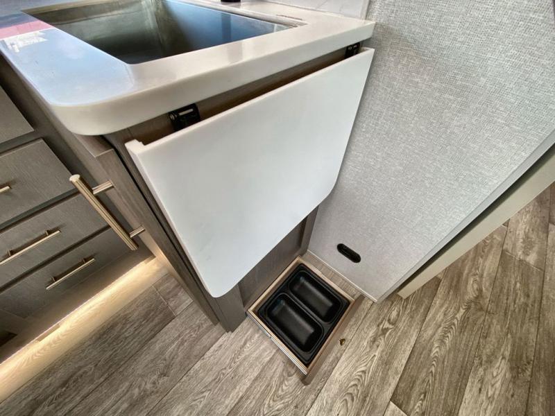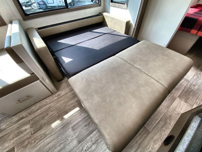 If you're looking for a travel trailer to take tailgating, this Alta model is the one! After you've unloaded the pass-through storage and set up the 21' power awning, start lunch on the outside kitchen! Since there are dual entry doors you can enter in through the main living area, or the full bath for convenience. The little ones are sure to spend most of their time in the rear bunkhouse that includes a flip-up bunk under the sofa, plus a second bunk across the room. The adults can visit at the booth dinette or on the tri-fold sofa, and check out the front private bedroom with sliding doors and a king bed for all-around comfort!