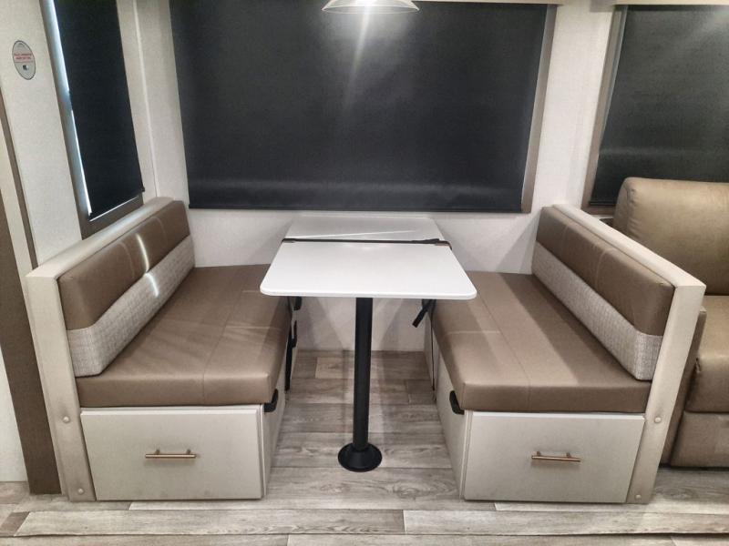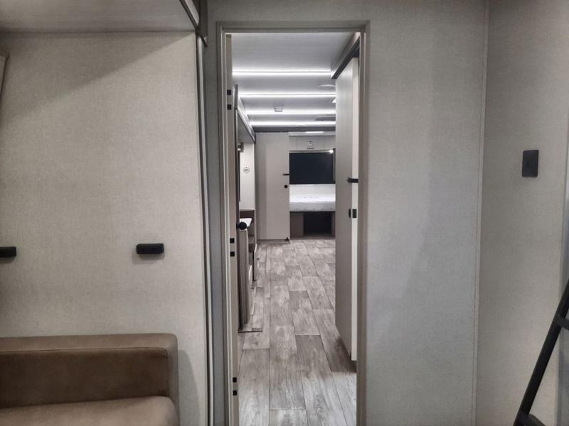 If you're looking for a travel trailer to take tailgating, this Alta model is the one! After you've unloaded the pass-through storage and set up the 21' power awning, start lunch on the outside kitchen! Since there are dual entry doors you can enter in through the main living area, or the full bath for convenience. The little ones are sure to spend most of their time in the rear bunkhouse that includes a flip-up bunk under the sofa, plus a second bunk across the room. The adults can visit at the booth dinette or on the tri-fold sofa, and check out the front private bedroom with sliding doors and a king bed for all-around comfort!