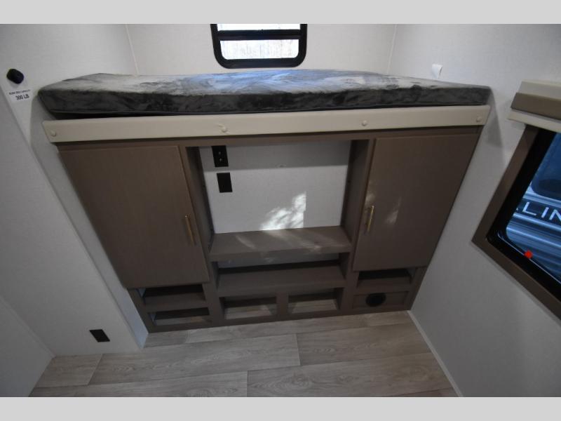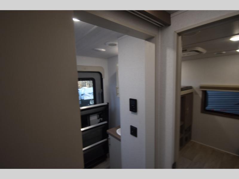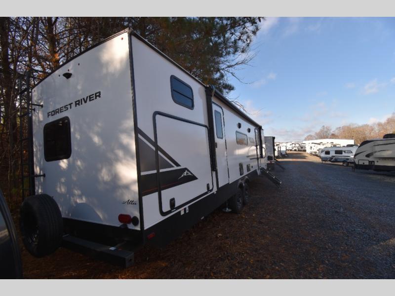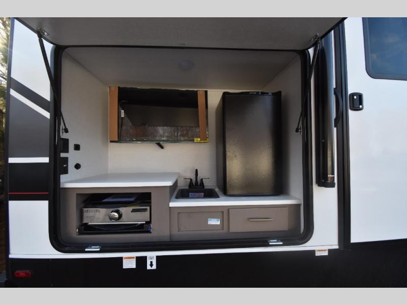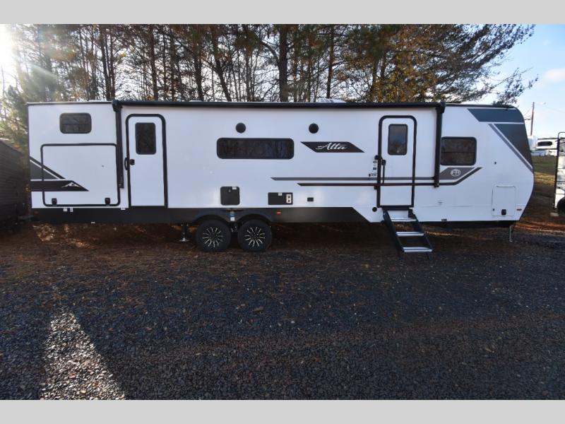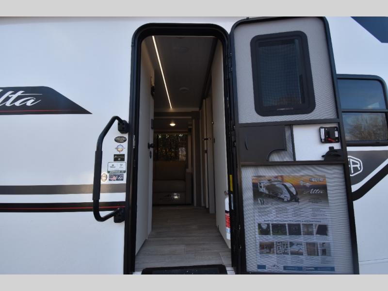 If you're looking for a travel trailer to take tailgating, this Alta model is the one! After you've unloaded the pass-through storage and set up the 21' power awning, start lunch on the outside kitchen! Since there are dual entry doors you can enter in through the main living area, or the full bath for convenience. The little ones are sure to spend most of their time in the rear bunkhouse that includes a flip-up bunk under the sofa, plus a second bunk across the room. The adults can visit at the booth dinette or on the tri-fold sofa, and check out the front private bedroom with sliding doors and a king bed for all-around comfort!