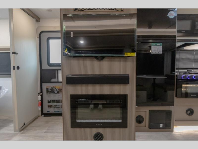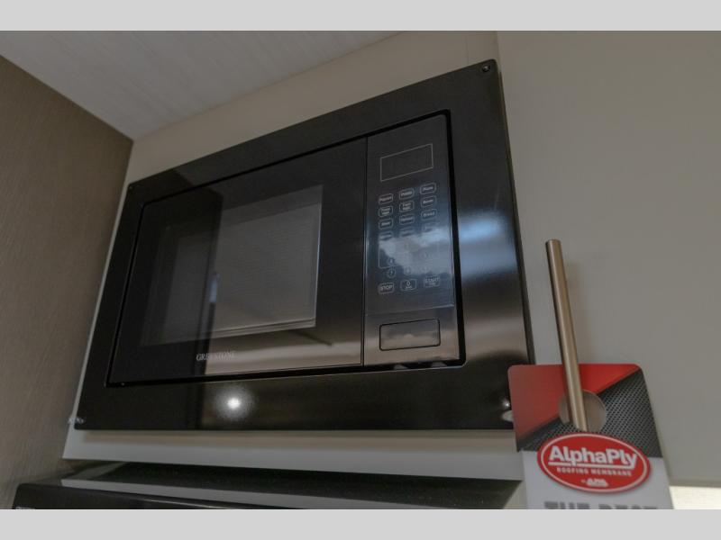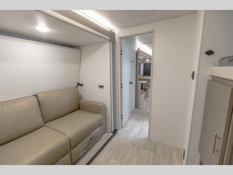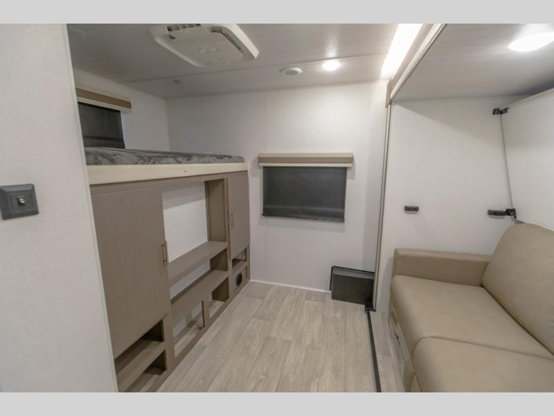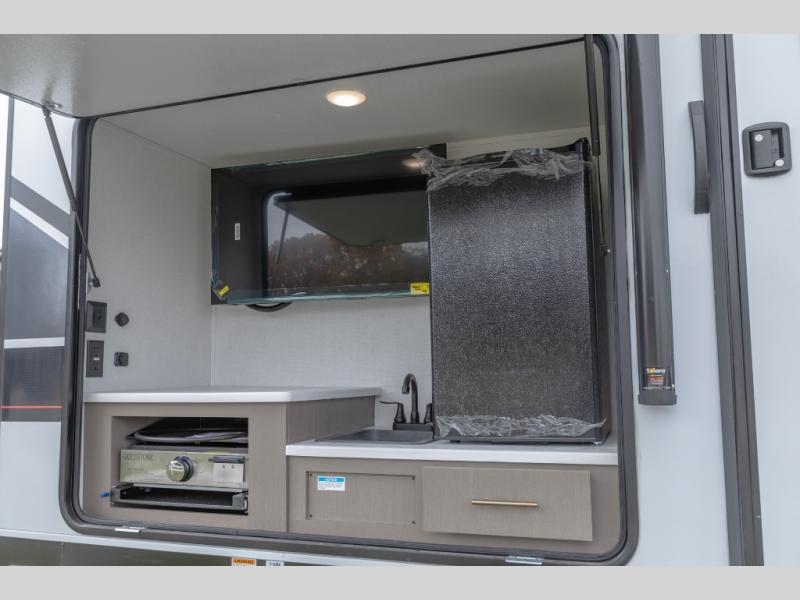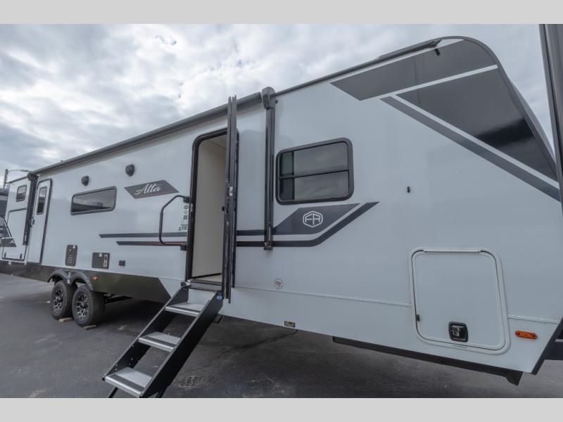 If you're looking for a travel trailer to take tailgating, this Alta model is the one! After you've unloaded the pass-through storage and set up the 21' power awning, start lunch on the outside kitchen! Since there are dual entry doors you can enter in through the main living area, or the full bath for convenience. The little ones are sure to spend most of their time in the rear bunkhouse that includes a flip-up bunk under the sofa, plus a second bunk across the room. The adults can visit at the booth dinette or on the tri-fold sofa, and check out the front private bedroom with sliding doors and a king bed for all-around comfort!