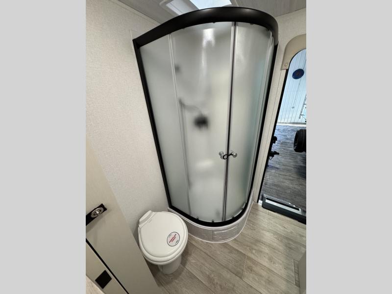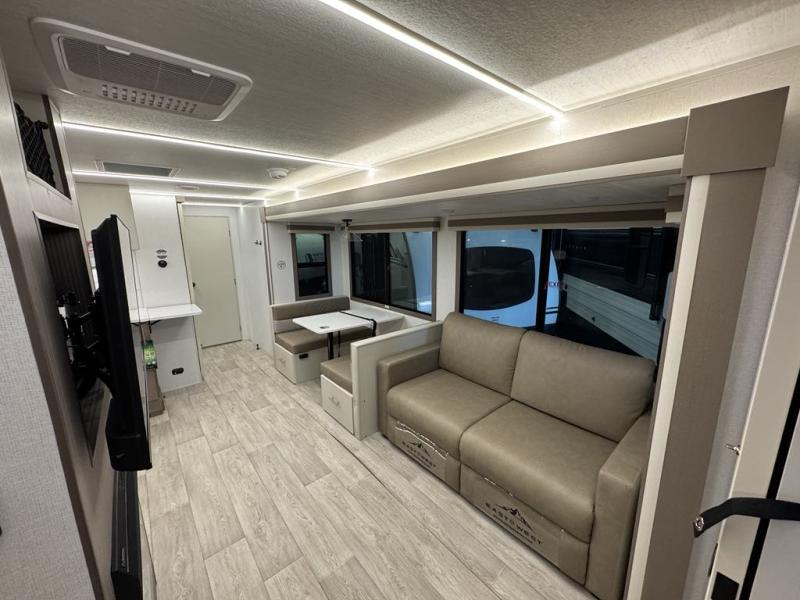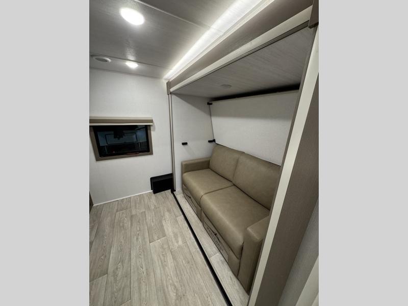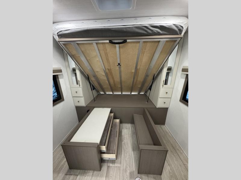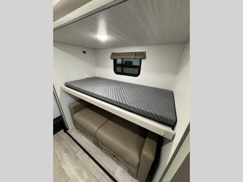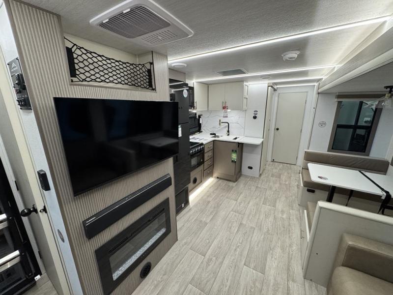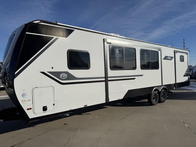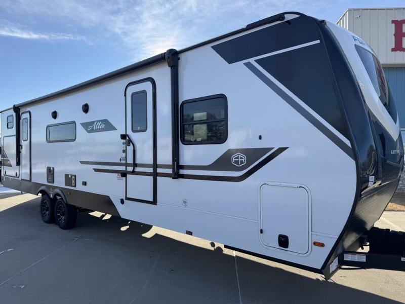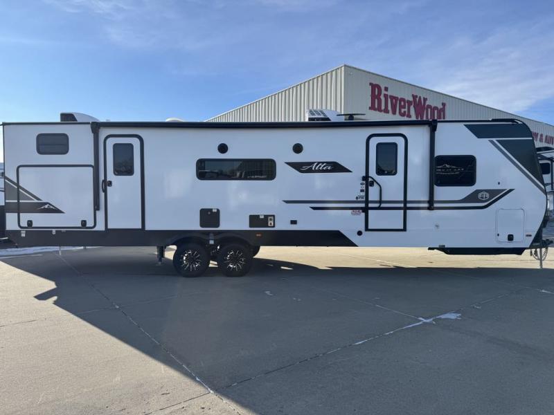 If you're looking for a travel trailer to take tailgating, this Alta model is the one! After you've unloaded the pass-through storage and set up the 21' power awning, start lunch on the outside kitchen! Since there are dual entry doors you can enter in through the main living area, or the full bath for convenience. The little ones are sure to spend most of their time in the rear bunkhouse that includes a flip-up bunk under the sofa, plus a second bunk across the room. The adults can visit at the booth dinette or on the tri-fold sofa, and check out the front private bedroom with sliding doors and a king bed for all-around comfort!