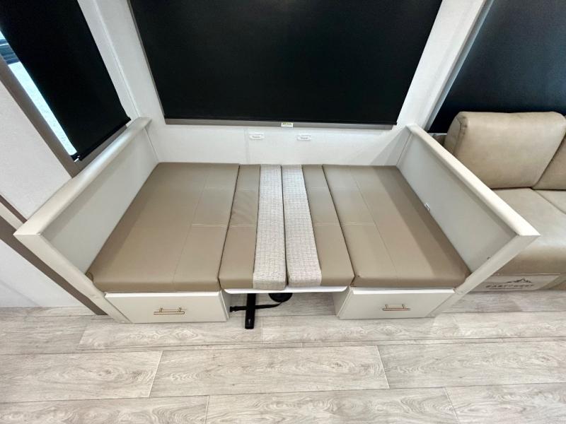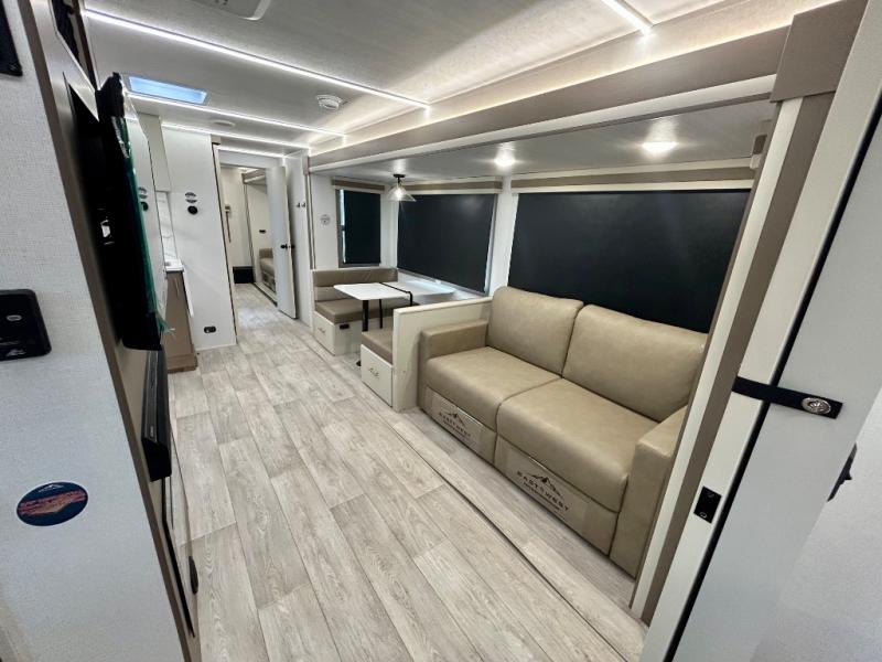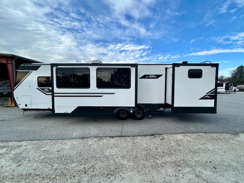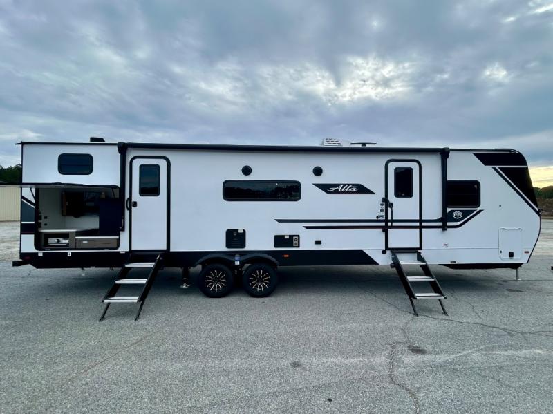 If you're looking for a travel trailer to take tailgating, this Alta model is the one! After you've unloaded the pass-through storage and set up the 21' power awning, start lunch on the outside kitchen! Since there are dual entry doors you can enter in through the main living area, or the full bath for convenience. The little ones are sure to spend most of their time in the rear bunkhouse that includes a flip-up bunk under the sofa, plus a second bunk across the room. The adults can visit at the booth dinette or on the tri-fold sofa, and check out the front private bedroom with sliding doors and a king bed for all-around comfort!