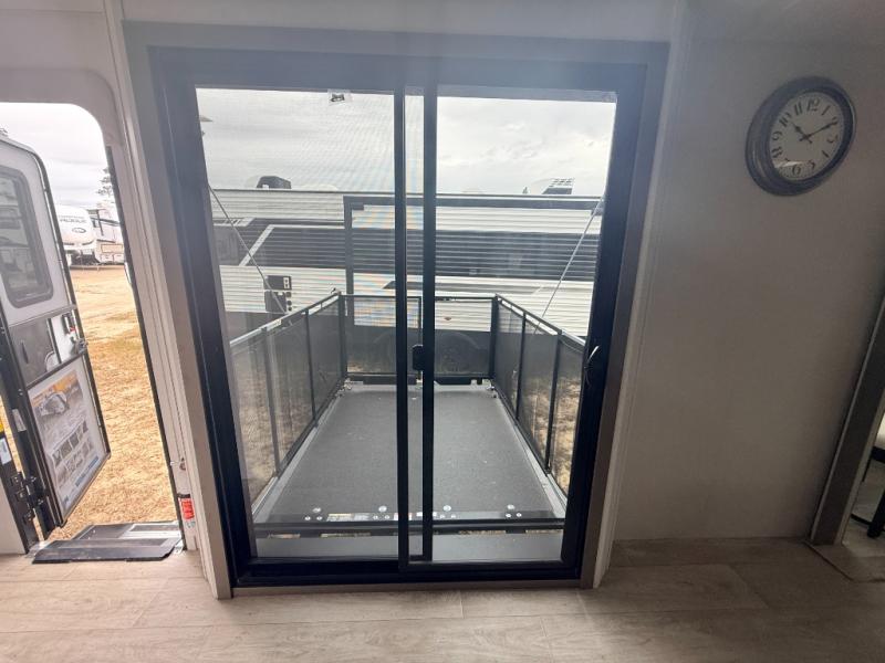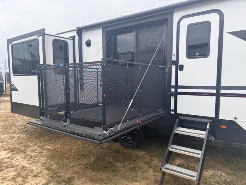 Experience a luxurious ride in this travel trailer. The rear kitchen is equipped with everything you need to whip up a culinary masterpiece. Enjoy ample storage in the pantry, a 12V refrigerator for keeping your favorite drinks and snacks chilled, a three-burner cooktop for cooking up a storm, and a microwave for quick reheating. The sink provides a convenient spot for washing up, and the spacious countertops offer plenty of room for food preparation. Relax and unwind in the heart of the trailer, a comfortable living area features a tri-fold sofa and a sofa with recliners. Gather around the fireplace on chilly evenings, or enjoy your favorite shows on the TV. Further, the full bathroom is equipped with everything you need for a comfortable stay, and the front bedroom boasts a queen-sized bed, large wardrobe, dresser, and overhead cabinets. Finally, take your living space outdoors with the fold-down patio, perfect for alfresco dining or simply enjoying the fresh air.