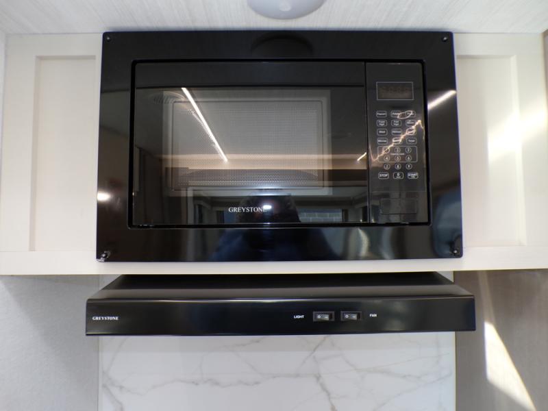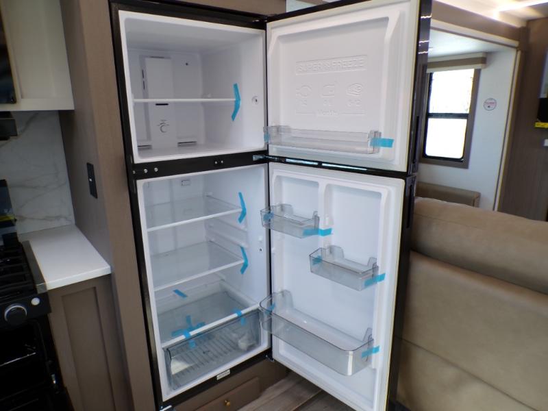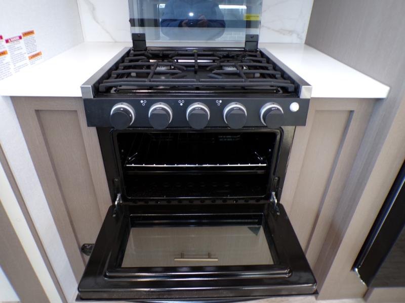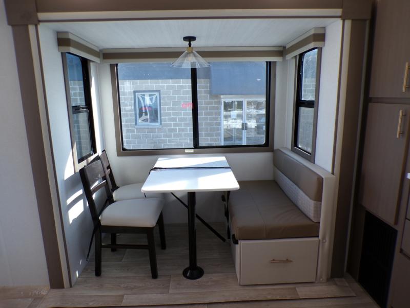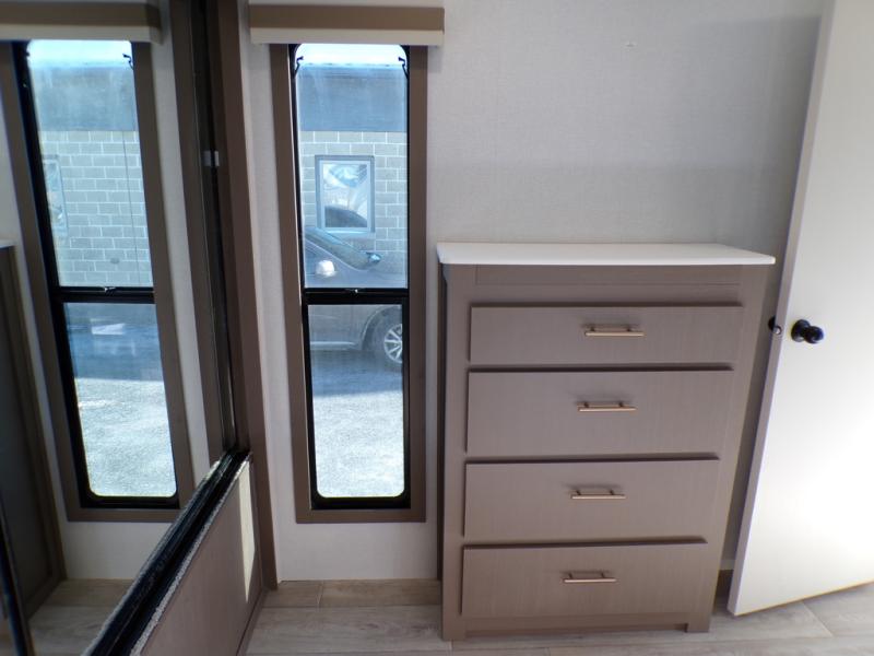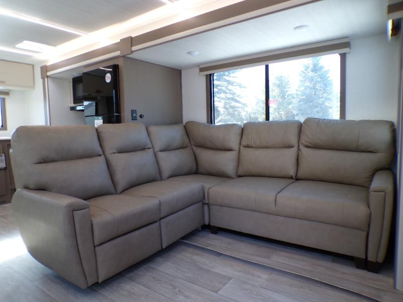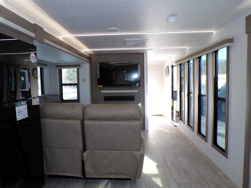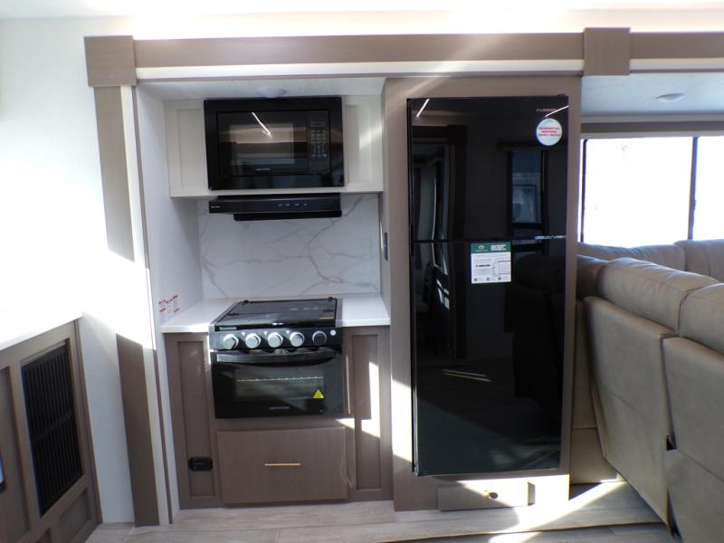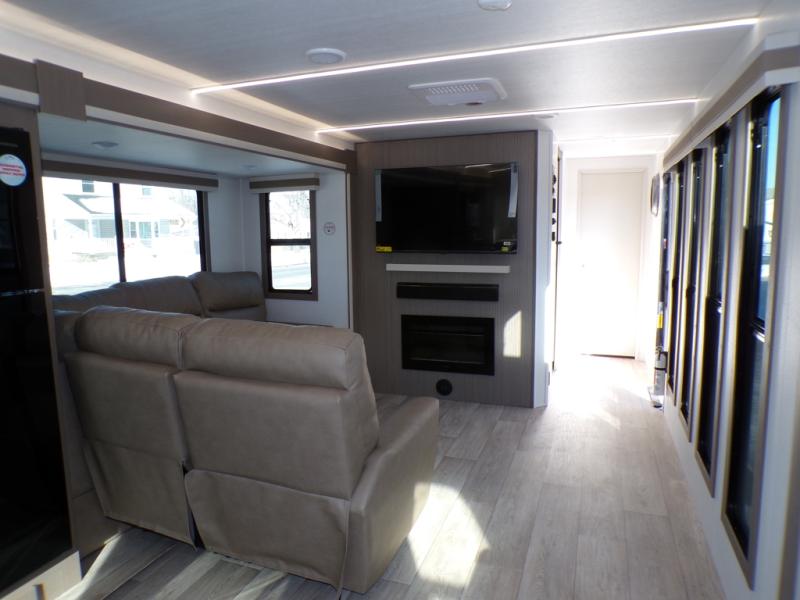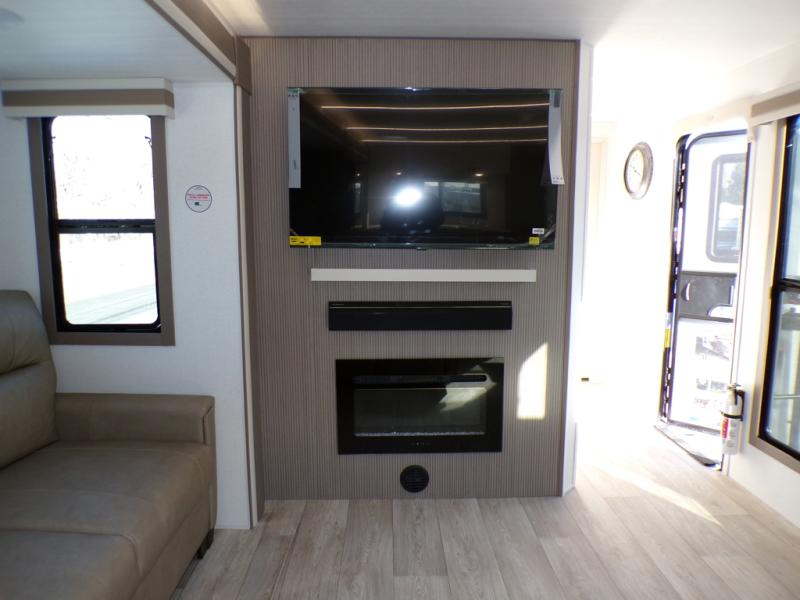 Experience a luxurious ride in this travel trailer. The rear kitchen is equipped with everything you need to whip up a culinary masterpiece. Enjoy ample storage in the pantry, a 12V refrigerator for keeping your favorite drinks and snacks chilled, a three-burner cooktop for cooking up a storm, and a microwave for quick reheating. The sink provides a convenient spot for washing up, and the spacious countertops offer plenty of room for food preparation. Relax and unwind in the heart of the trailer, a comfortable living area features a tri-fold sofa and a sofa with recliners and gather around the fireplace on chilly evenings. Further, the full bathroom is equipped with everything you need for a comfortable stay, and the front bedroom boasts a queen-sized bed, large wardrobe, dresser, and overhead cabinets. Finally, take your living space outdoors with the optional fold-down patio, perfect for alfresco dining or simply enjoying the fresh air.
