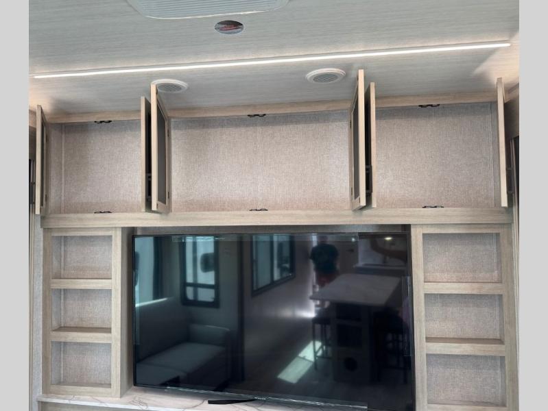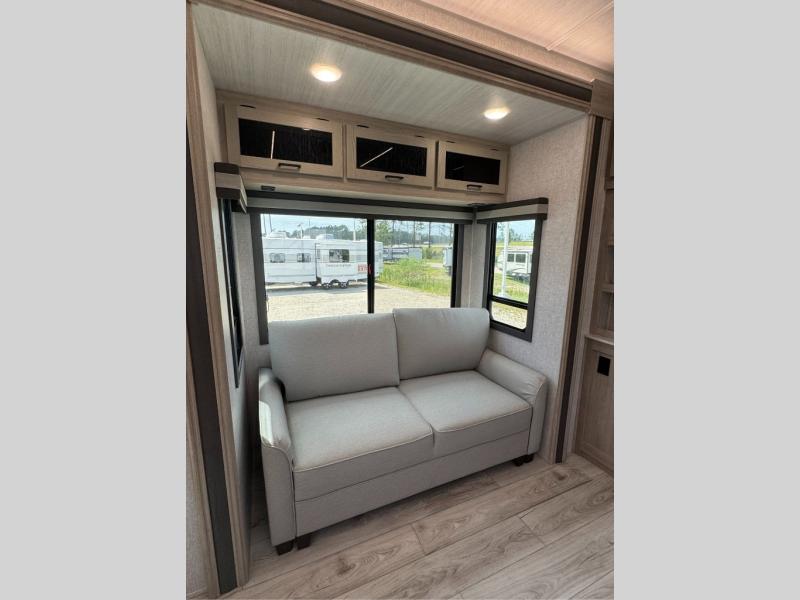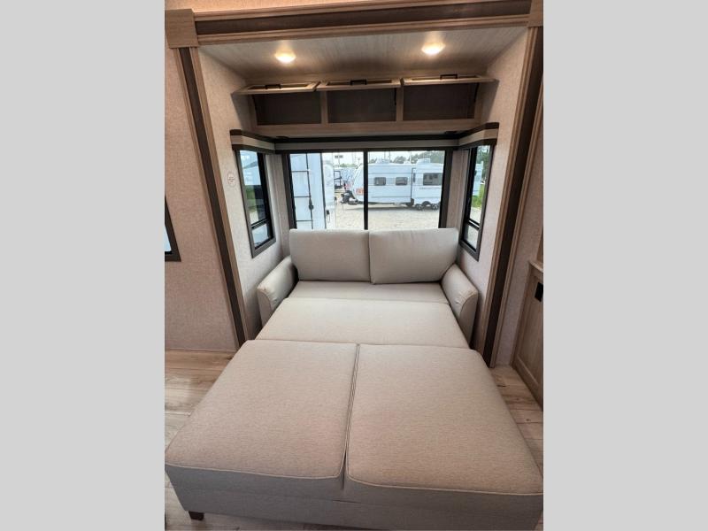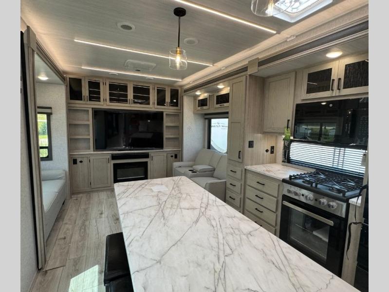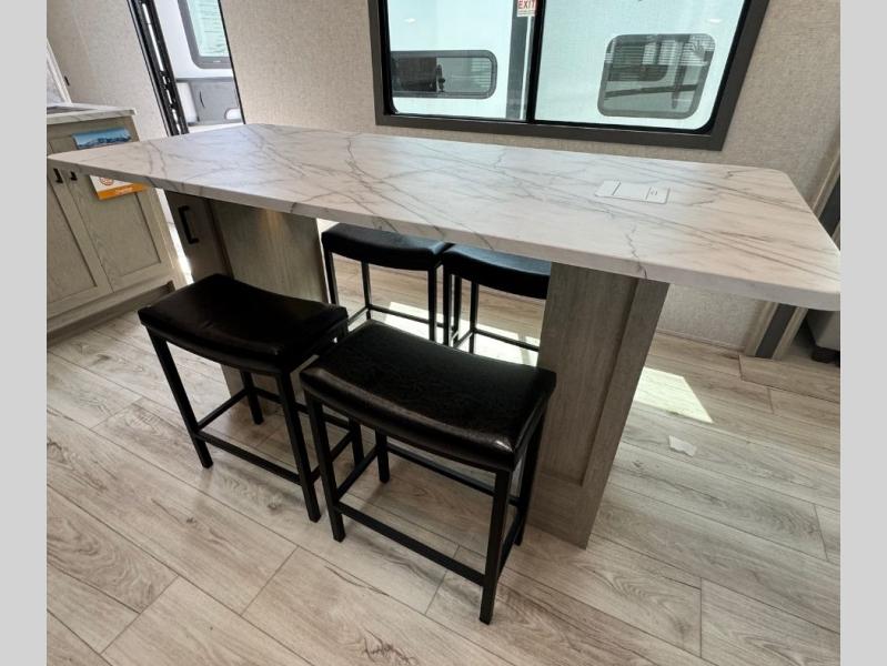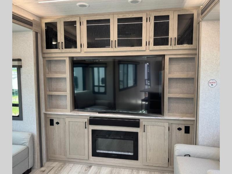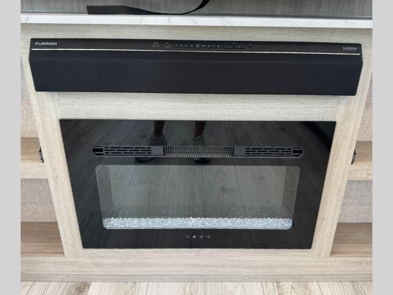 You will feel right at home in this travel trailer! After you've unloaded the pass-through storage and set up the 21' power awning, start preparing lunch will all of the countertop space next to the kitchen sink. You can get a good night's rest on the king bed slide in the front private bedroom and store your clothes in the large front wardrobe. There is even a sliding door washer and dryer prep here if you want the option to add these appliances. The adjustable free standing table offers a comfortable place to enjoy your meals and play card games. Inside the rear living area, you will find opposing slides with a tri-fold sofa and theater seats, as well as a second set of theater seats directly across from the rear entertainment center and fireplace!