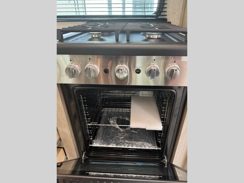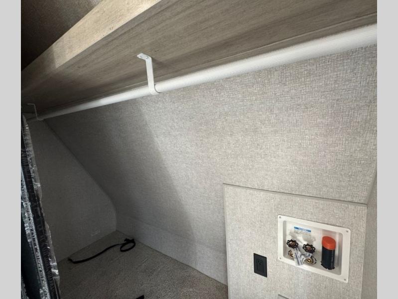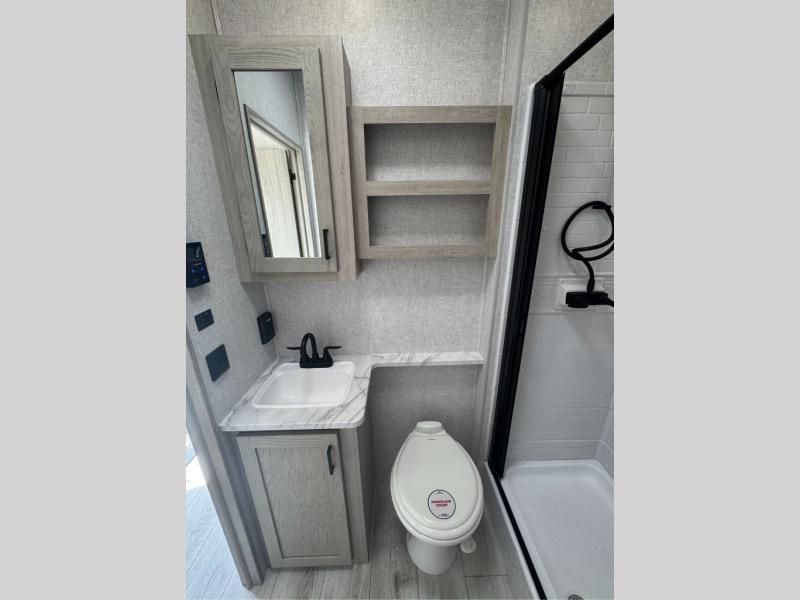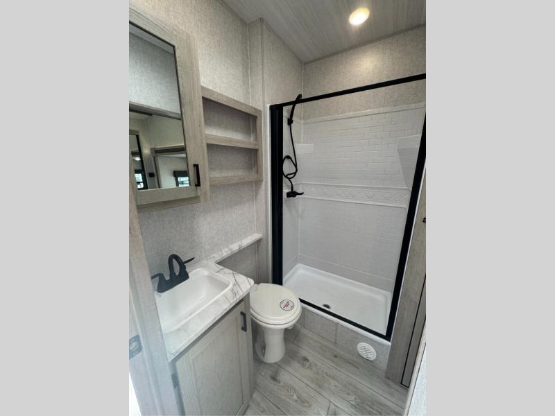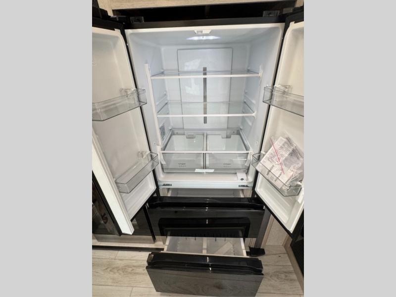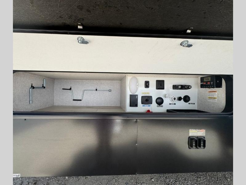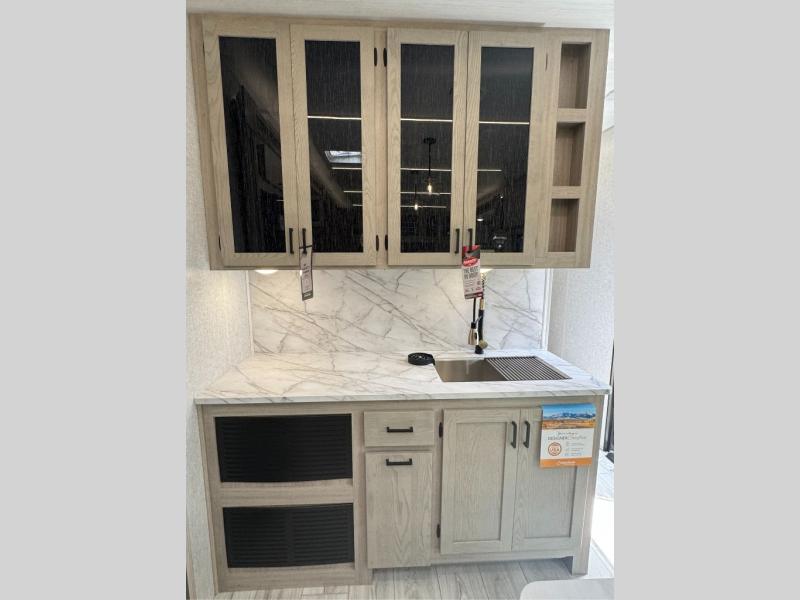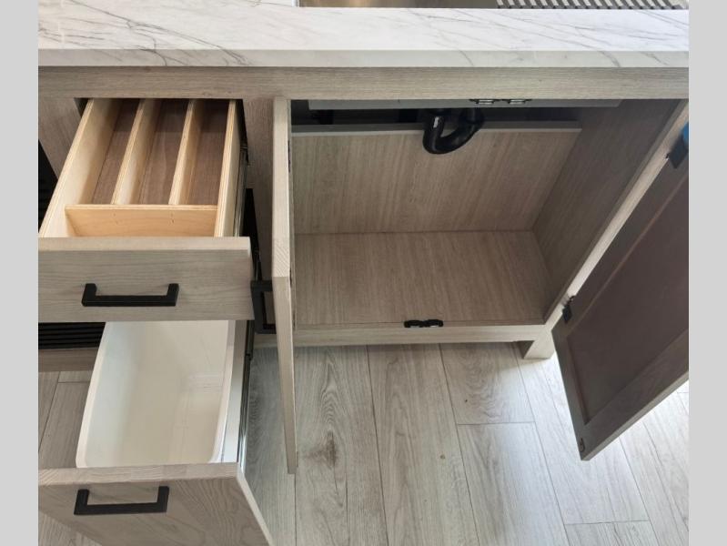 You will feel right at home in this travel trailer! After you've unloaded the pass-through storage and set up the 21' power awning, start preparing lunch will all of the countertop space next to the kitchen sink. You can get a good night's rest on the king bed slide in the front private bedroom and store your clothes in the large front wardrobe. There is even a sliding door washer and dryer prep here if you want the option to add these appliances. The adjustable free standing table offers a comfortable place to enjoy your meals and play card games. Inside the rear living area, you will find opposing slides with a tri-fold sofa and theater seats, as well as a second set of theater seats directly across from the rear entertainment center and fireplace!