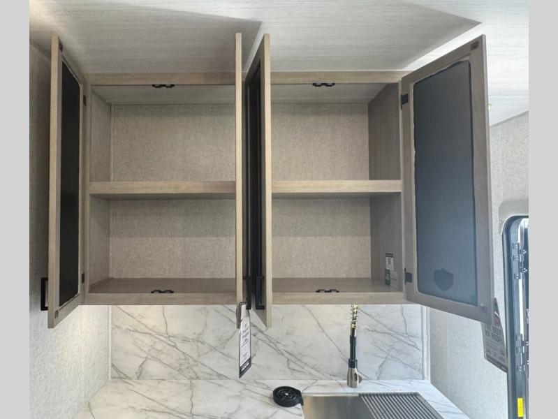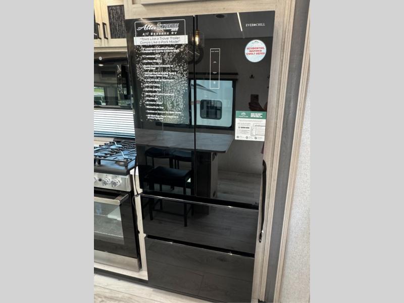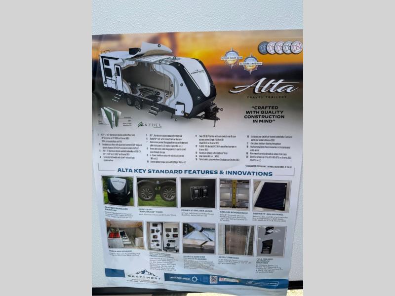 Each Alta travel trailer or toy hauler by EAST TO WEST is constructed with a 5" vacuum bonded roof, an enclosed and heated underbelly, and diamond plate front rock guard for added protection. Outside, you'll find marine-grade exterior speakers, a universal docking station, and back-up camera prep that can be added to make maneuvering in and out of campgrounds easier than ever. Inside, there are 4k interior LED lights, solid pressed membrane countertops, black roller shades, and many more interior comforts you are sure to love.