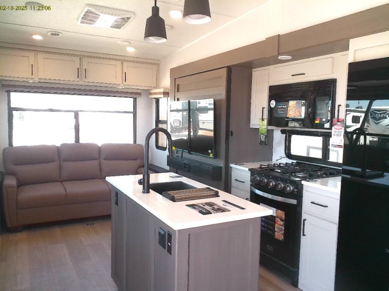This Blackhorn fifth wheel offers a spacious and well-thought-out layout designed for comfort and convenience. At the front, you'll find a fully equipped bedroom with a king-size bed for a restful night's sleep, along with both a wardrobe and dresser to store all your clothes and essentials. There's also washer and dryer prep included. Just steps away is a full-size bathroom, allowing easy access between the bedroom and the main living area. At the rear, the large living space is enhanced by dual opposing slides, one side includes cozy theater seating and a free-standing dinette perfect for meals or relaxing in the evening. Opposite that, a kitchen island sits in the middle, and the other slide has the entertainment center and fireplace, with a hidden pantry tucked behind for extra storage. The kitchen is chef-ready with a 4-burner range and a spacious 16-cubic-foot refrigerator. At the rear is a hide-a-bed sofa along the back wall, which pulls out into a queen-size bed for additional sleeping space!