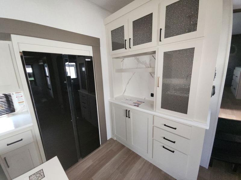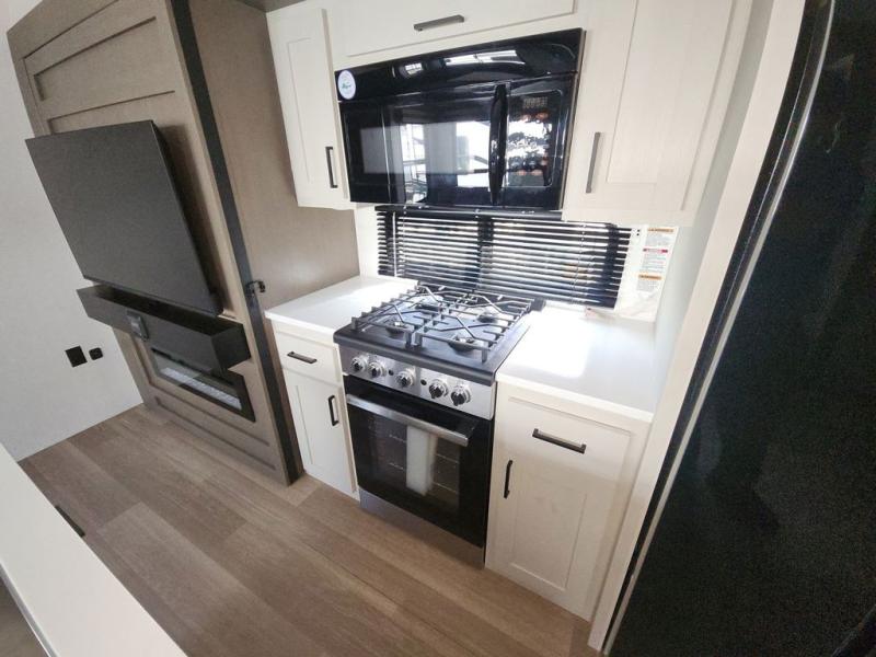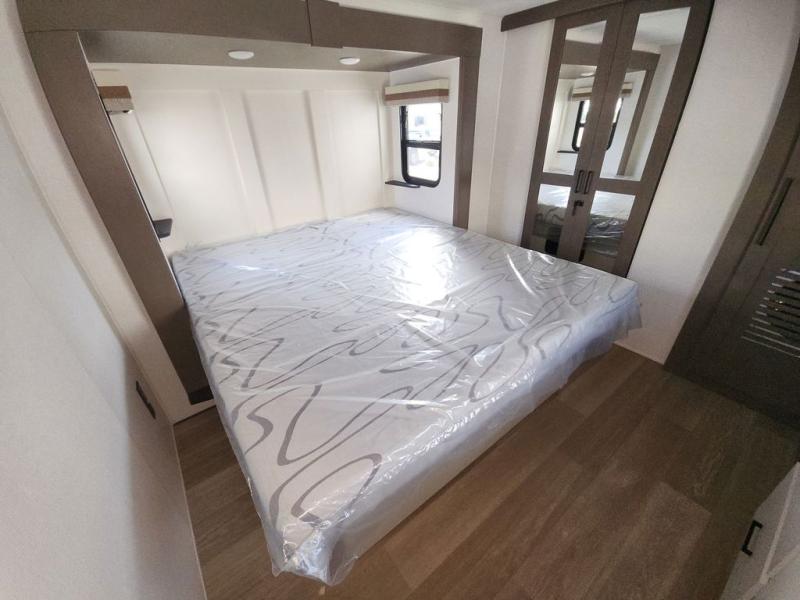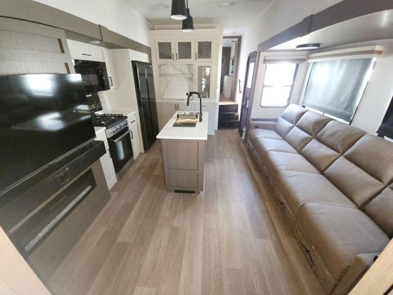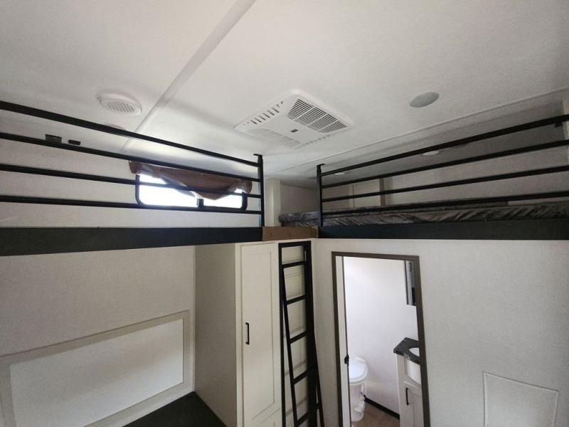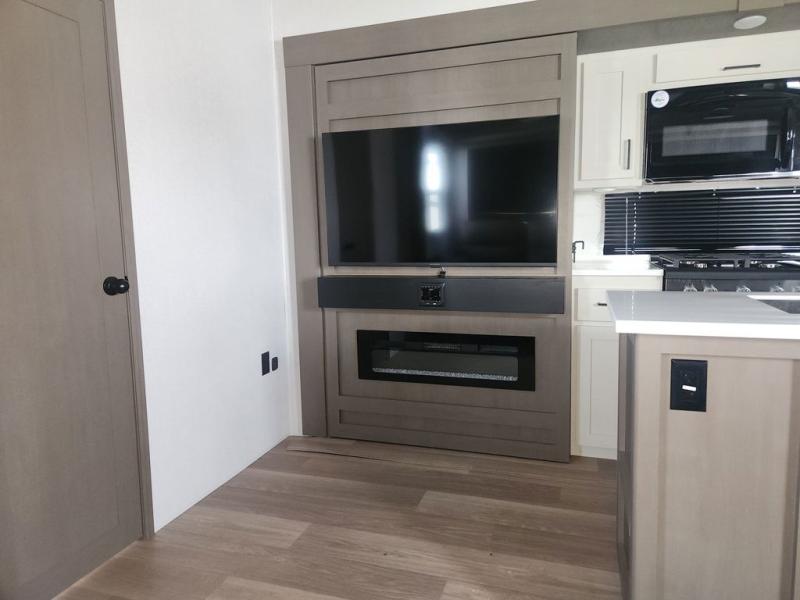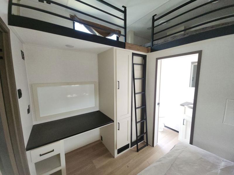 At the front of this fifth wheel, you'll find one of the two bedrooms, featuring a spacious king bed with convenient storage underneath, perfect for extra bedding or travel gear. This room also includes a dresser and a full wardrobe, providing plenty of space for clothes. Just next to the bedroom is one of the two full bathrooms, equipped with a shower, toilet, and a linen closet to keep all your essentials. The center has the main living area opens up with dual opposing slide-outs, creating a roomy and inviting space to relax or entertain. One slide has the comfortable theater seating and a free-standing dinette, ideal for dining or game nights. Across from this, we have the island, an entertainment center with a fireplace and 50-inch TV, plus a hidden pantry for added storage. The kitchen is fully equipped with a 4-burner range and a 16 cubic ft. refrigerator. At the rear is the second bedroom, with a power tilt queen bed, a built-in desk perfect for remote work or study, and an overhead loft area offering additional sleeping or storage space. This bedroom also includes its own private full bathroom and a separate entry door, providing both convenience and privacy.