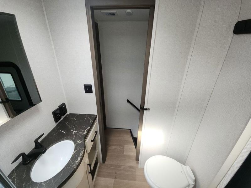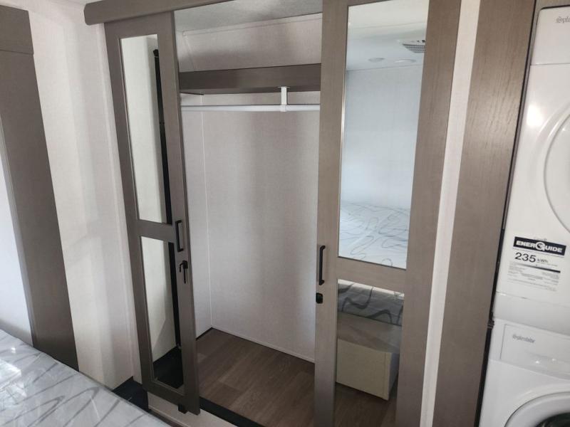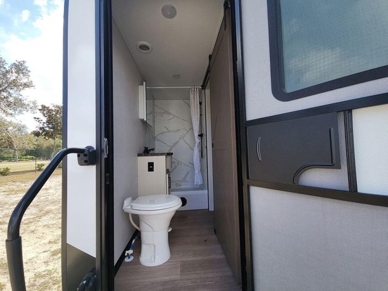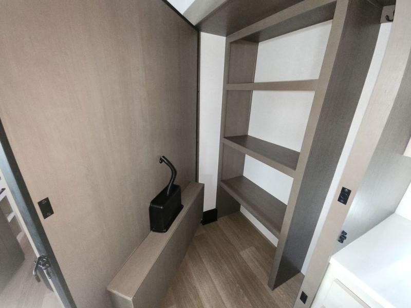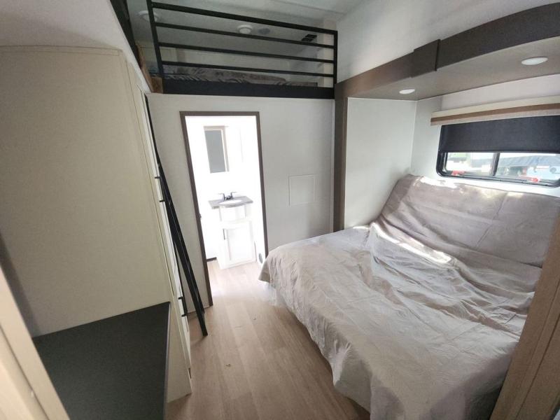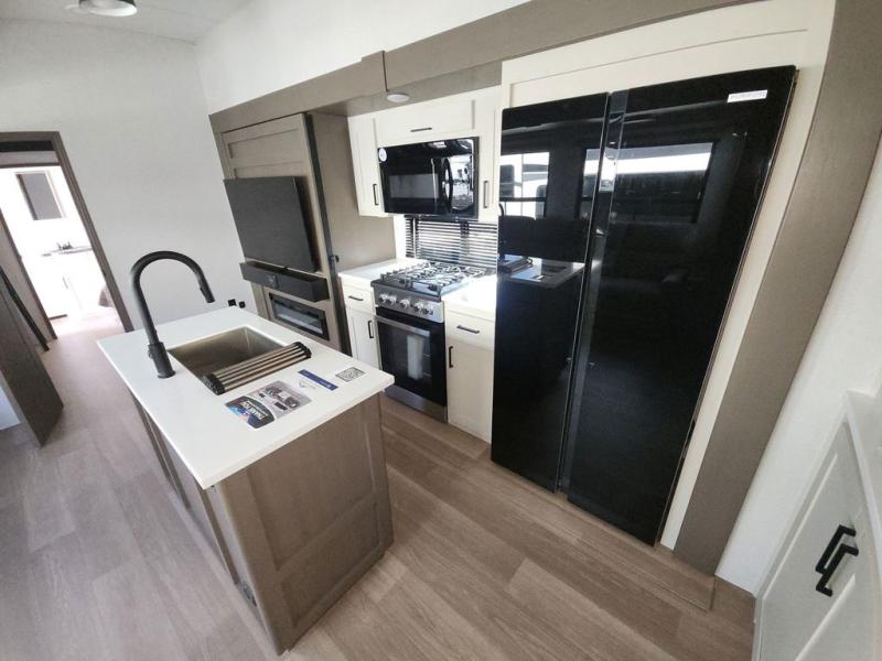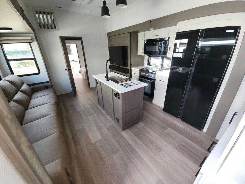 At the front of this fifth wheel, you'll find one of the two bedrooms, featuring a spacious king bed with convenient storage underneath, perfect for extra bedding or travel gear. This room also includes a dresser and a full wardrobe, providing plenty of space for clothes. Just next to the bedroom is one of the two full bathrooms, equipped with a shower, toilet, and a linen closet to keep all your essentials. The center has the main living area opens up with dual opposing slide-outs, creating a roomy and inviting space to relax or entertain. One slide has the comfortable theater seating and a free-standing dinette, ideal for dining or game nights. Across from this, we have the island, an entertainment center with a fireplace and 50-inch TV, plus a hidden pantry for added storage. The kitchen is fully equipped with a 4-burner range and a 16 cubic ft. refrigerator. At the rear is the second bedroom, with a power tilt queen bed, a built-in desk perfect for remote work or study, and an overhead loft area offering additional sleeping or storage space. This bedroom also includes its own private full bathroom and a separate entry door, providing both convenience and privacy.