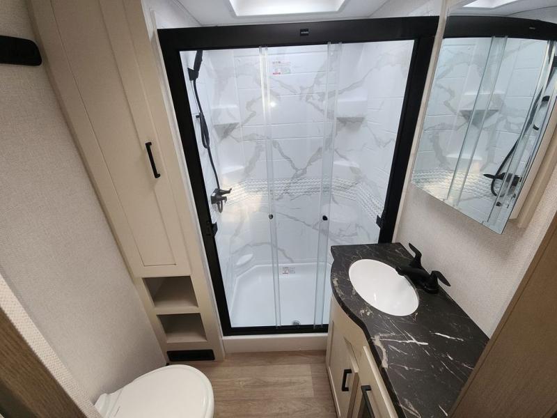 Each East to West Blackthorn Model is thoughtfully designed with both comfort and style in mind. The climate package features include an electric fireplace for cozy evenings, a high-capacity 35,000 BTU furnace, and a heated, enclosed underbelly with circulating heat to the dump valves for added protection and functionality. The Interior Luxury Package enhances the living space with solid surface kitchen countertops, Slow Rise roller shades for a sleek look and light control, and built-in CPAP shelves in the bed base for added convenience. On the outside, the Exterior Package delivers practical upgrades like solid entry steps with an extended grab handle, an oversized wide entrance door for easier access, and dual power awnings with LED lighting, perfect for enjoying your outdoor space day or night.