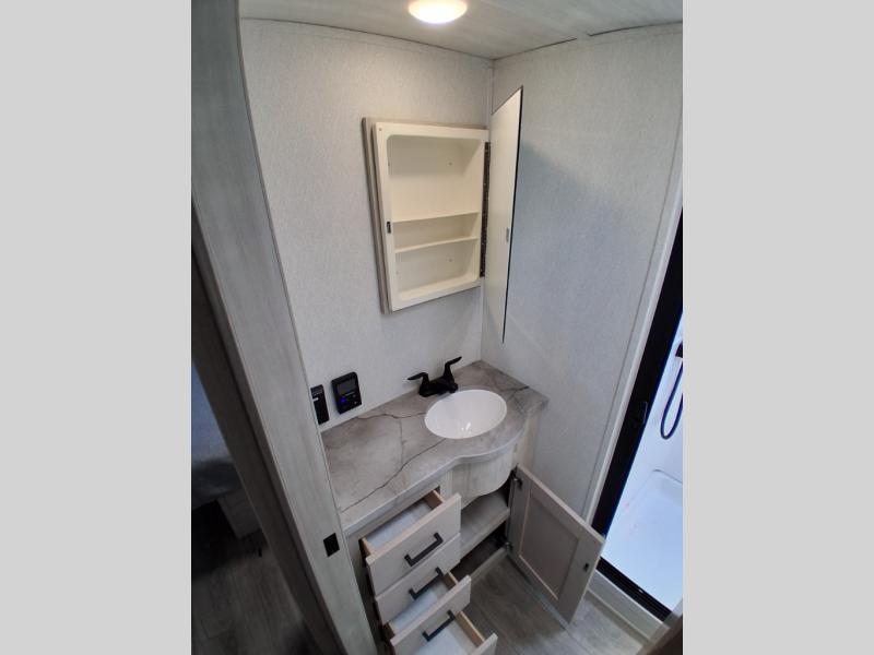 The Blackthorn Half-Ton fifth wheels by EAST TO WEST have floorplans starting under 7,500 lbs. and hitch weights below 1,400 lbs., so you can easily tow them with your half-ton truck! Durable construction includes Alphaply TPO roofing, Crane Max gel coated fiberglass exterior, and double-welded sidewalls, windows, and floors for maximum durability. The Blackthorn 4 Seasons Package comes with a 35,000 BTU furnace, 12V heat pads on all holding tanks, formaldehyde free fiberglass insulation, and more features that will extend your camping season or allow you to go full-time! You will appreciate having an on-demand tankless water heater, a Winegard Air 360+ TV antenna with Wi-Fi prep, and a universal all-in-one docking station for your units functions. Once inside, you'll enjoy how easy it will be to keep the vinyl flooring clean, and there are solid wood shaker-style cabinet doors, bedside nightstands, and the industry's first locking latch for glass shower doors.