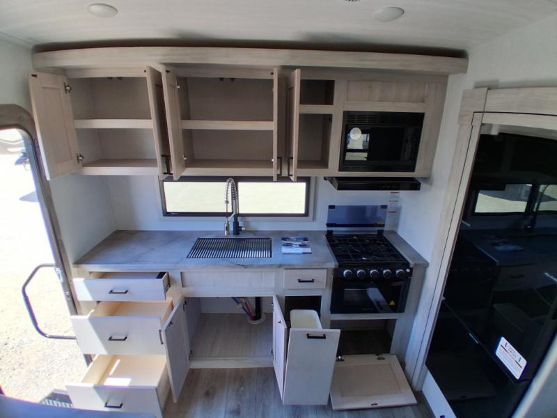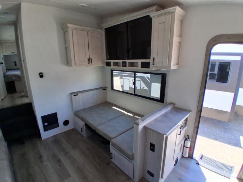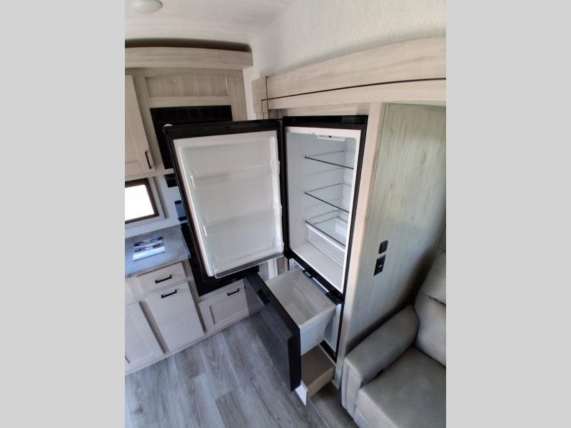 Hitch up this single slide out fifth wheel and head to your local state park! The rear kitchen includes plenty of counter space to prep meals and the booth dinette provides a place to dine at. You'll also find theater seating across from the 50" LED TV on swing arm. After you've spent the day outdoors, you can freshen up in the spacious full bath that includes a shower with a skylight for more standing room and natural light. When you're ready for some shut-eye, the king bed in the front private bedroom will provide a great night's rest!