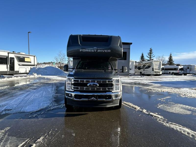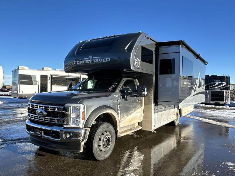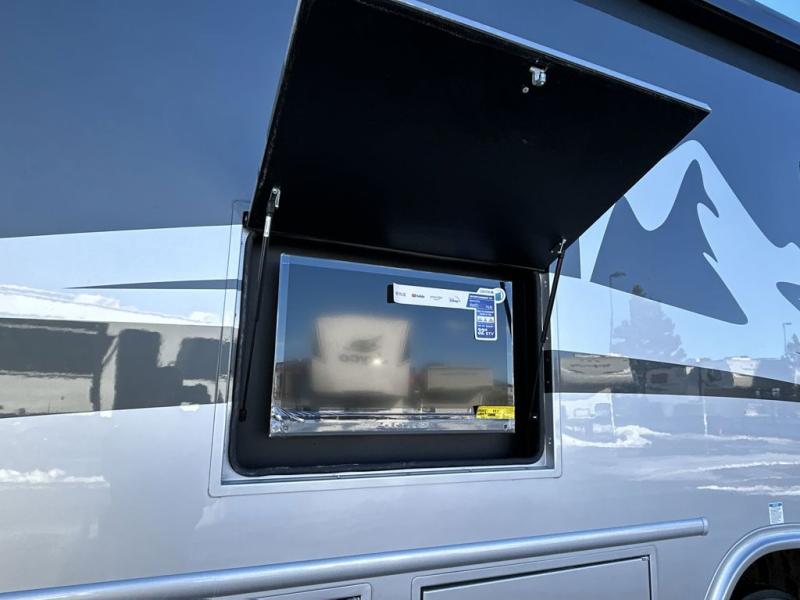 The Bravado Super C diesel motorhome by EAST TO WEST is packed with amenities that will let you travel boldly and confidently. There is a Ford F600 4x4 chassis, 6.7L PowerStroke V8 engine, and 10 speed SelectShift automatic transmission for the ultimate driving experience. You'll stay comfortable with the 15K main A/C and 13.5K second A/C, plus there is an 8,000W diesel generator and (2) 200W solar panels to meet your power needs. Some of the interior comforts you will enjoy are the solid surface countertops, hardwood cabinet doors and drawer fronts, tankless water heater, and cross ventilation side windows for the cab bunk!