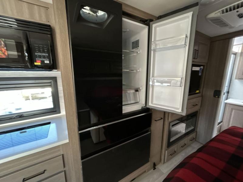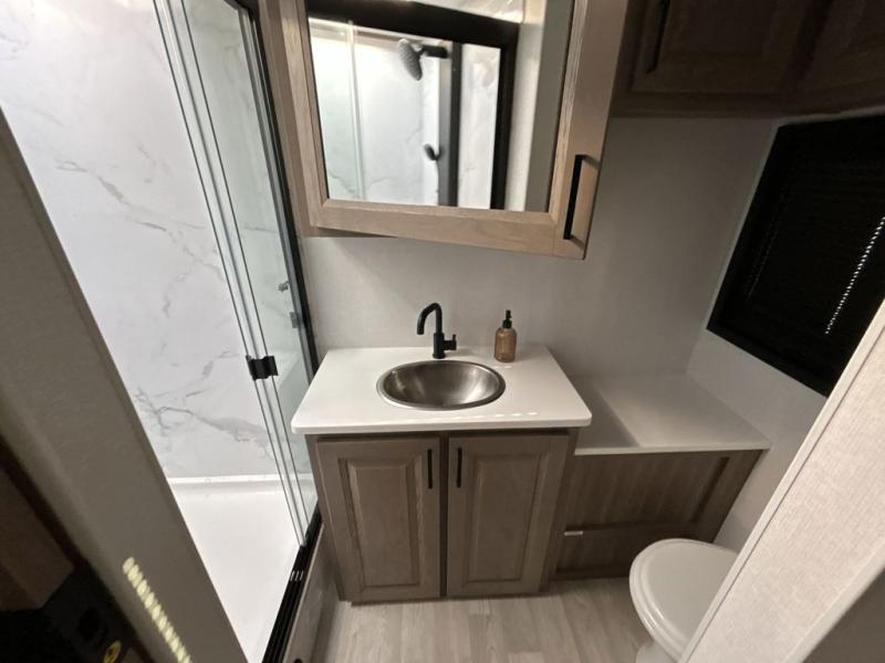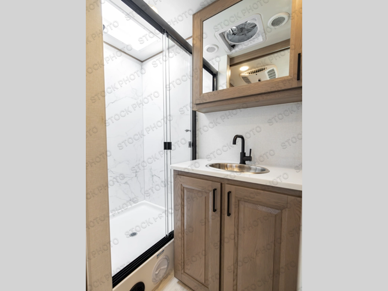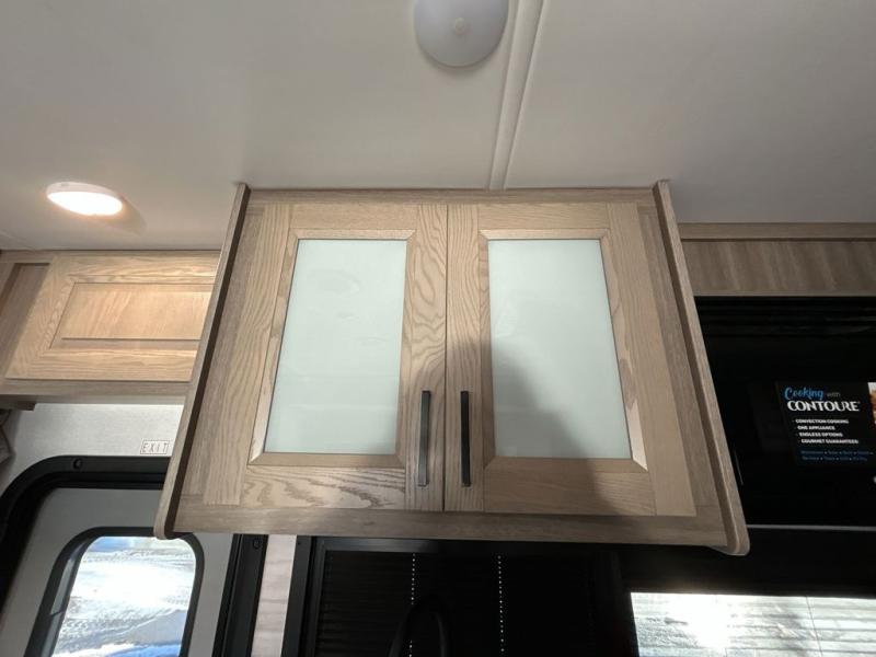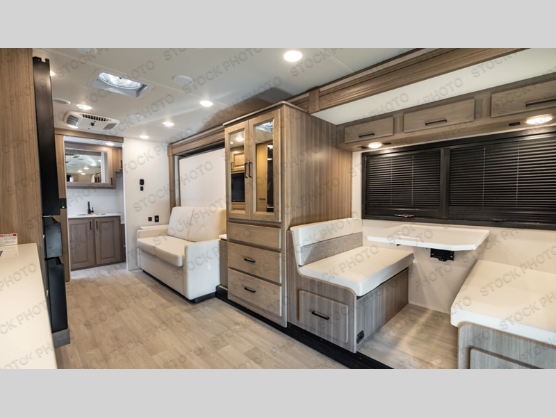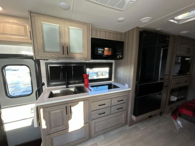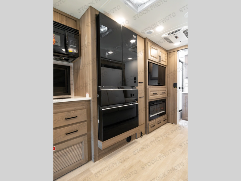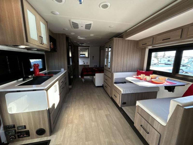 You'll love the amount of space you have in this coach with a full-wall slide! Here, you can dine at the booth dinette, relax and sleep on the sofa and powered Murphy bed, and keep clean clothes in the spacious wardrobe. There is also a 40" TV and a fireplace across from the sofa/bed for added comfort. A two-burner cooktop and convection microwave will let you make your best meals, and you'll appreciate the 12V refrigerator and pantry for food storage. Don't overlook the full rear bath, complete with a shower, toilet and sink with counter space!