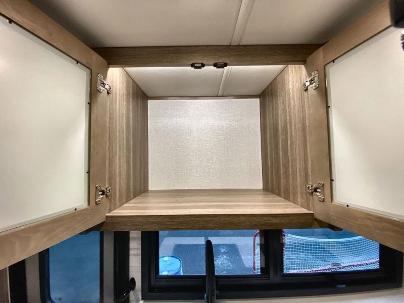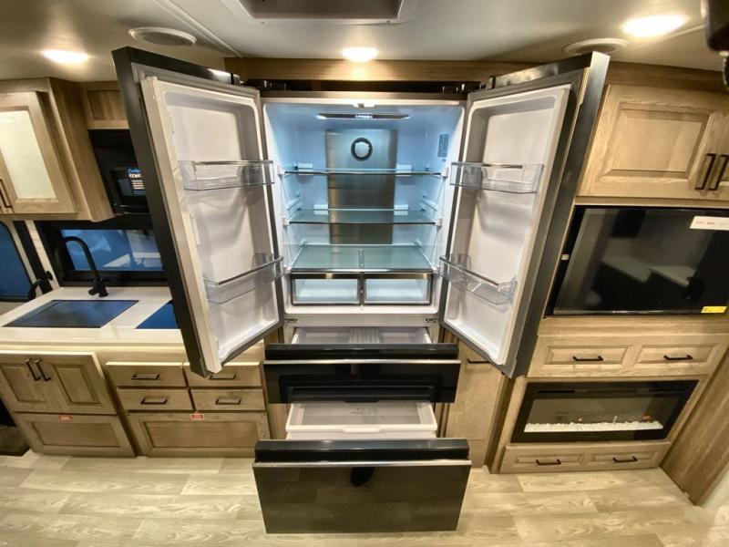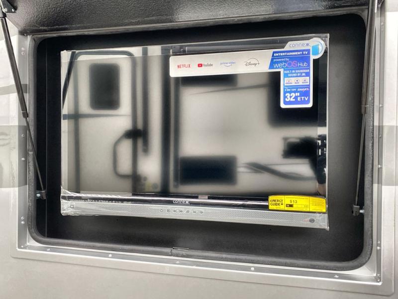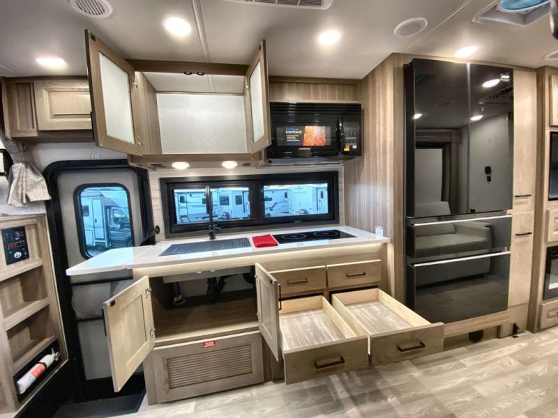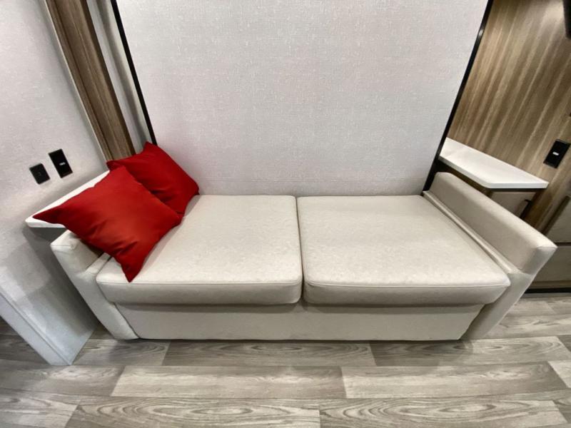 You'll love the amount of space you have in this coach with a full-wall slide! Here, you can dine at the booth dinette, relax and sleep on the sofa and powered Murphy bed, and keep clean clothes in the spacious wardrobe. There is also a 40" TV and a fireplace across from the sofa/bed for added comfort. A two-burner cooktop and convection microwave will let you make your best meals, and you'll appreciate the 12V refrigerator and pantry for food storage. Don't overlook the full rear bath, complete with a shower, toilet and sink with counter space!