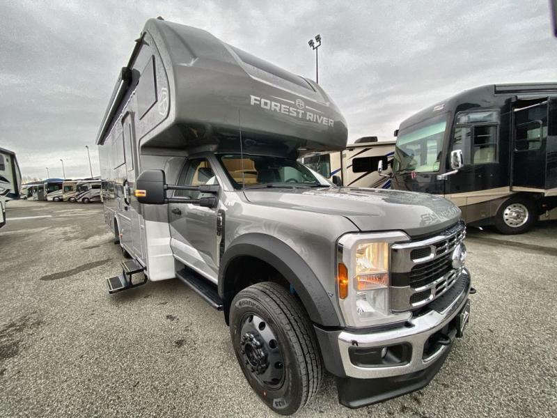 The Bravado Super C diesel motorhome by EAST TO WEST is packed with amenities that will let you travel boldly and confidently. There is a Ford F600 4x4 chassis, 6.7L PowerStroke V8 engine, and 10 speed SelectShift automatic transmission for the ultimate driving experience. You'll stay comfortable with the 15K main A/C and 13.5K second A/C, plus there is an 8,000W diesel generator and (2) 200W solar panels to meet your power needs. Some of the interior comforts you will enjoy are the solid surface countertops, hardwood cabinet doors and drawer fronts, tankless water heater, and cross ventilation side windows for the cab bunk!