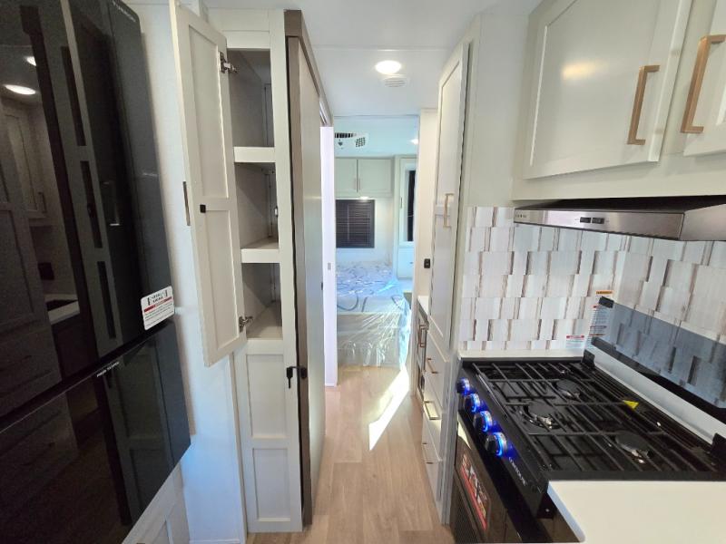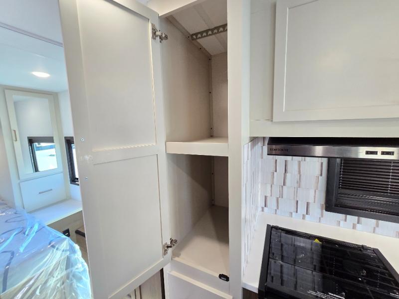Toward the back, the rear private bedroom creates a quiet retreat where you can rest comfortably at the end of the day. In the main living area, a 62" sofa offers a welcoming place to sit back and relax, while the nearby dinette provides a convenient space for meals, games, or planning your next destination. Just steps away, the kitchen pantry keeps food and essentials neatly stored and within easy reach, helping the space stay tidy and functional throughout your travels.