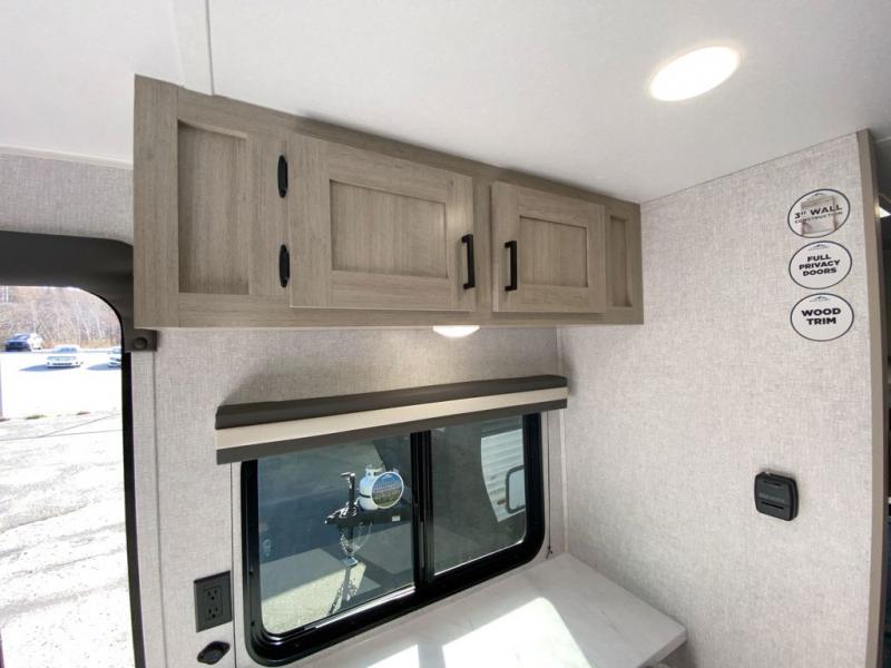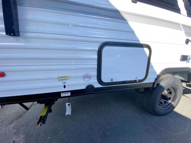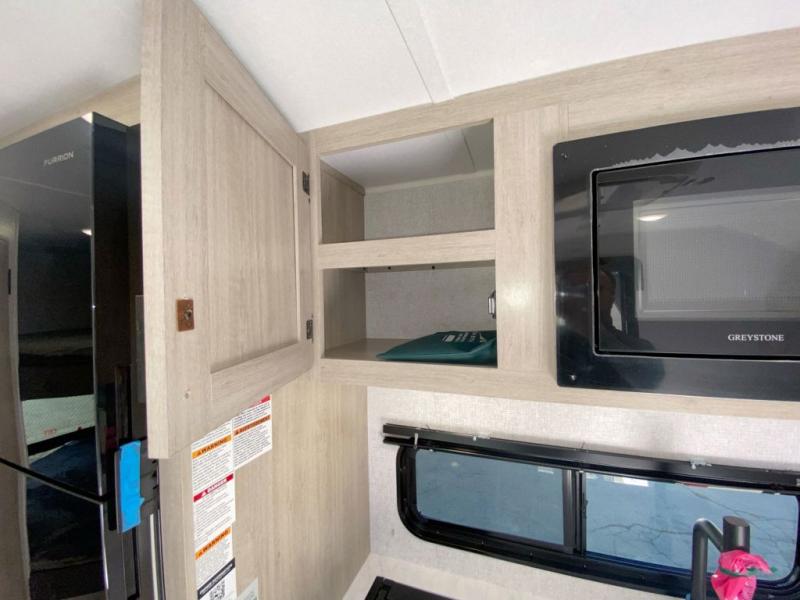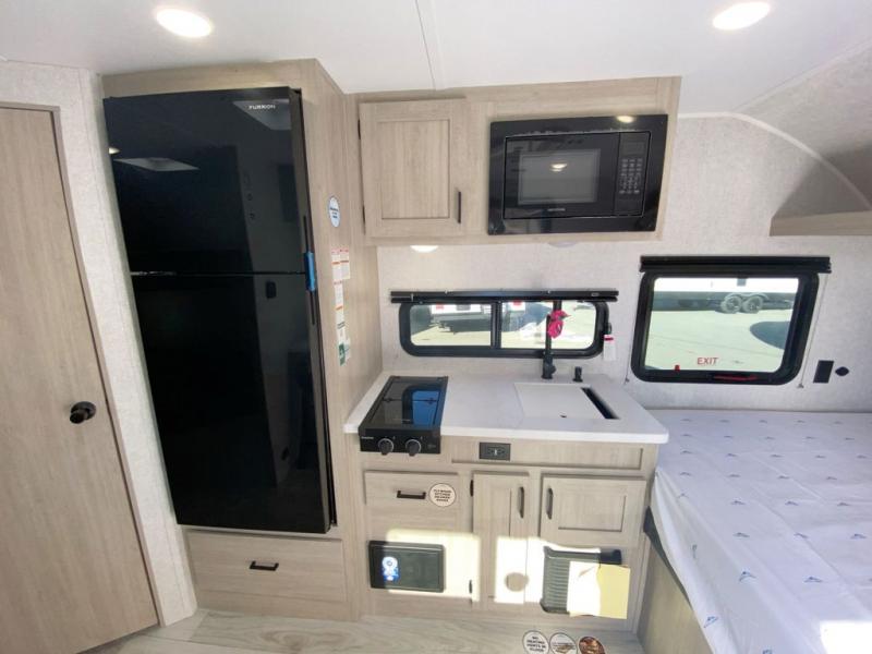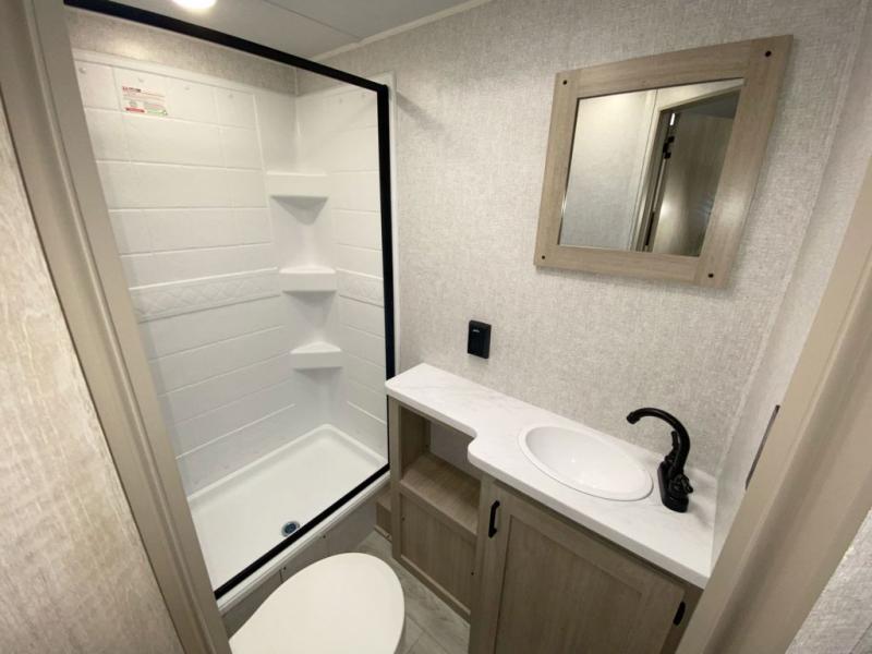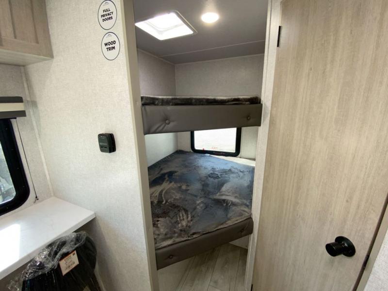 This is the perfect bunk travel trailer for your growing family. You will love the double-size bunks in back for the children or your guests, while you take the front queen bed. You can easily cook using the two burner range and microwave oven when you aren't cooking hotdogs and burgers over an open fire outside. There is flip-up storage under the front bed, under the booth dinette, and under the bunks. There is also a full bath with a walk-in shower that will allow you to freshen up without having to use the campground's facilities.