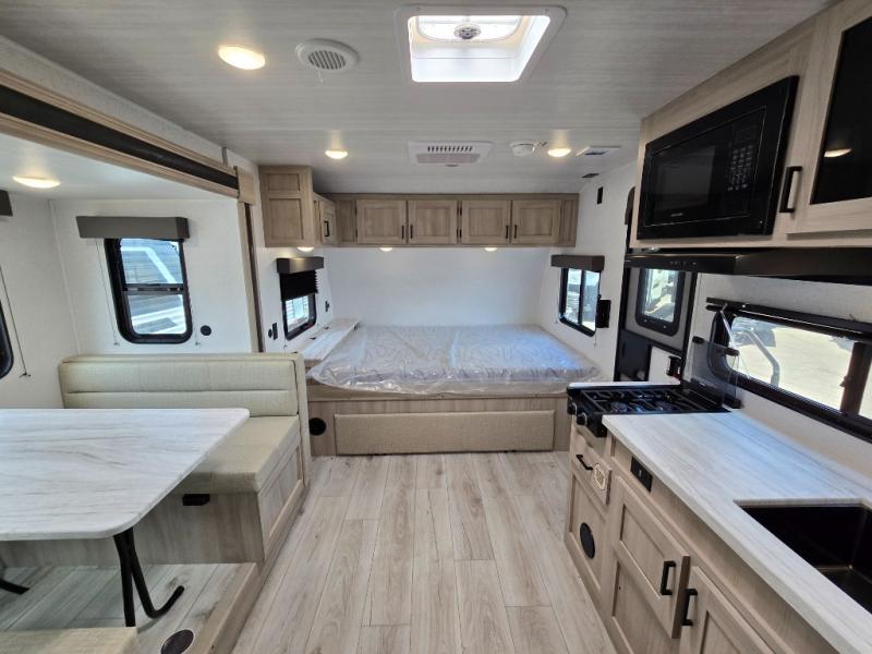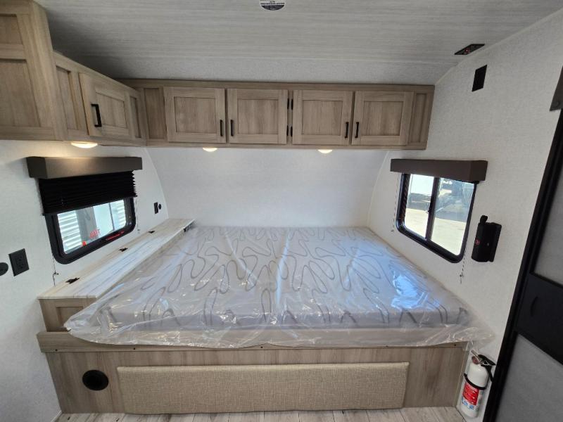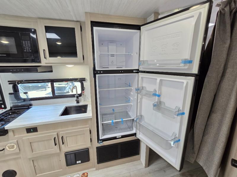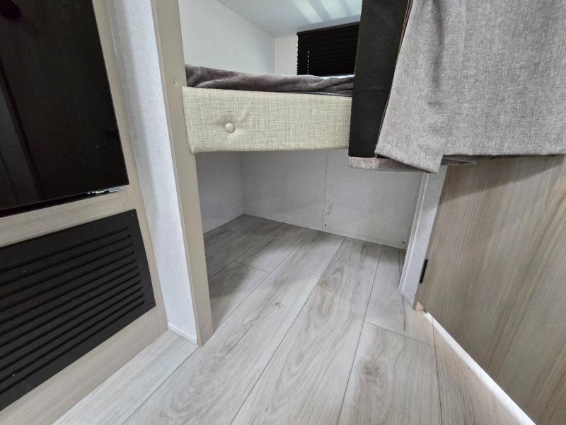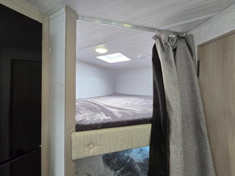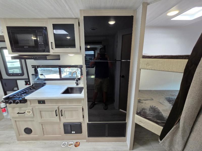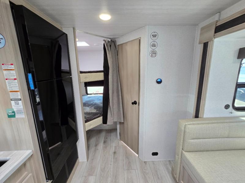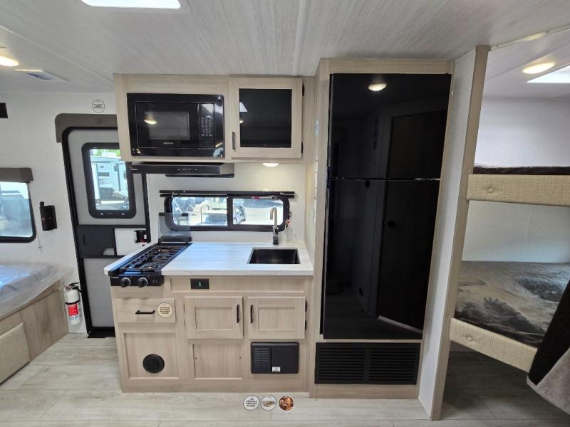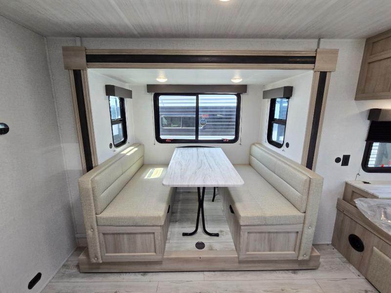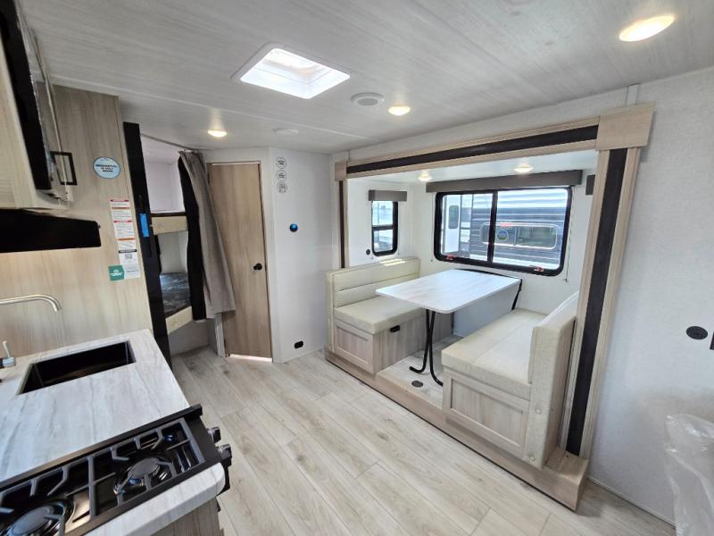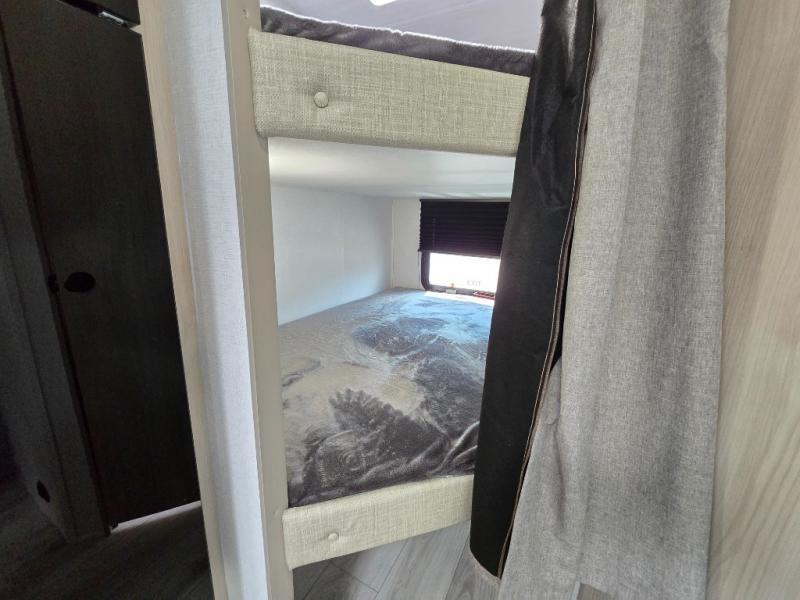 Offering a spacious and functional space for everyone, this travel trailer is perfect for road trips or camping excursions. It features double-sized bunks, providing a cozy sleeping spot for kids and a full bathroom, providing a convenient spot to freshen up after a long day of exploring. The kitchen is equipped with a refrigerator for keeping drinks and snacks fresh, a microwave for quick reheating, and a range with a glass top for preparing meals. Overhead cabinets provide ample storage for cookware and dishes, and the booth dinette provides a comfortable spot for meals and snacks or even an extra sleeping space. More sleeping space is provided by the front bed where you will find a queen-sized bed features a headboard with flip-up storage.