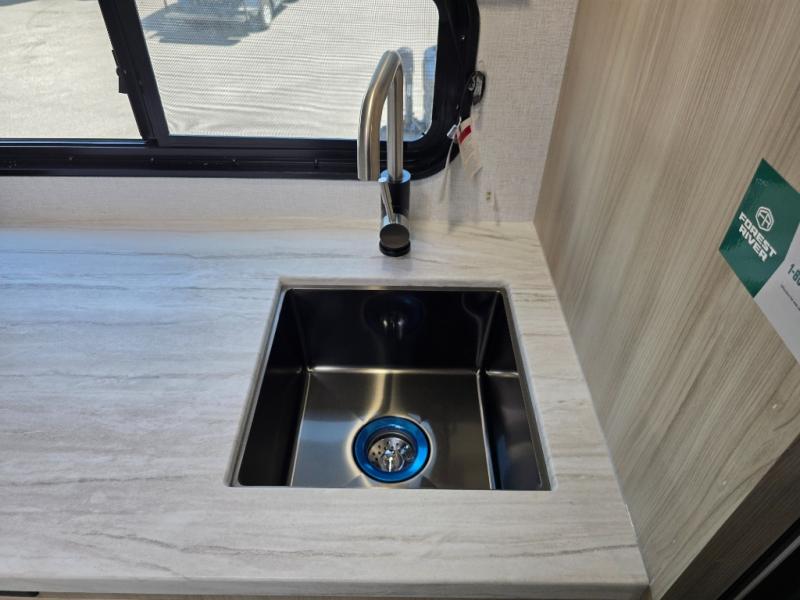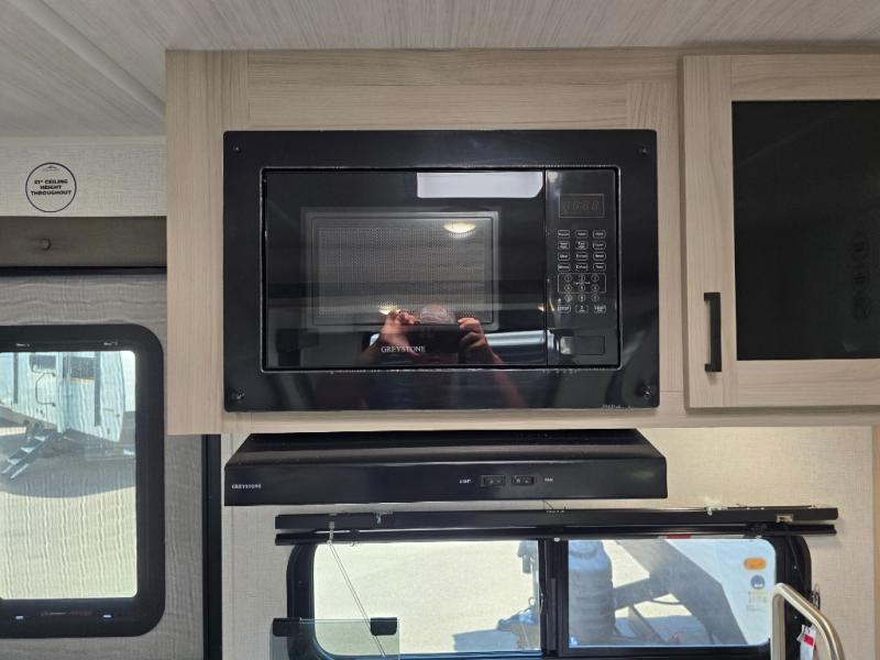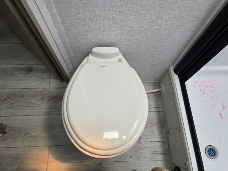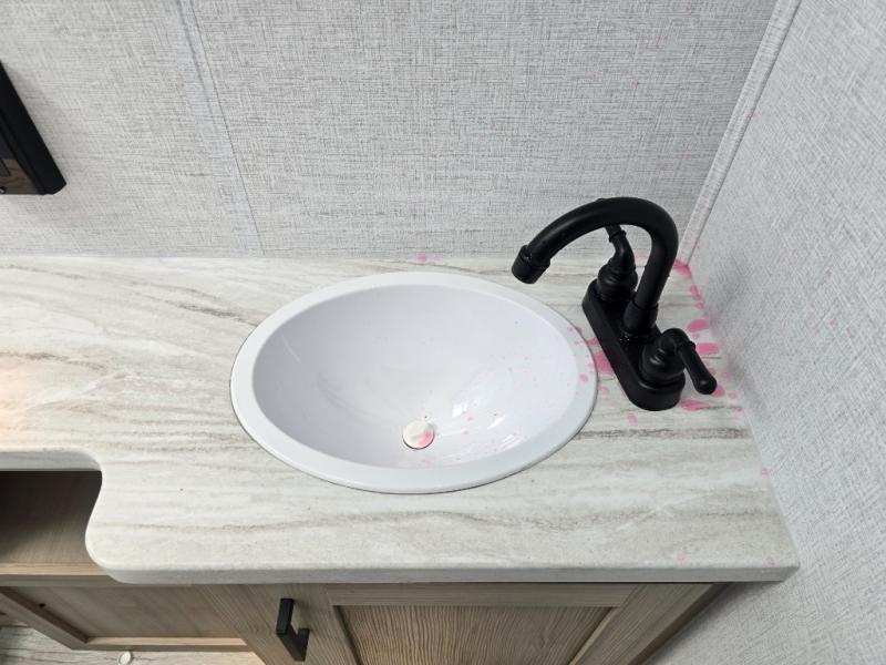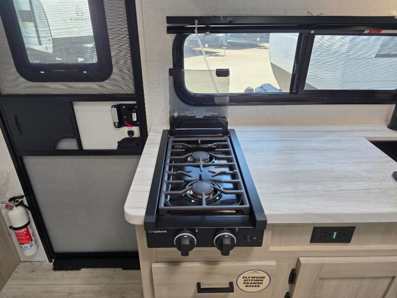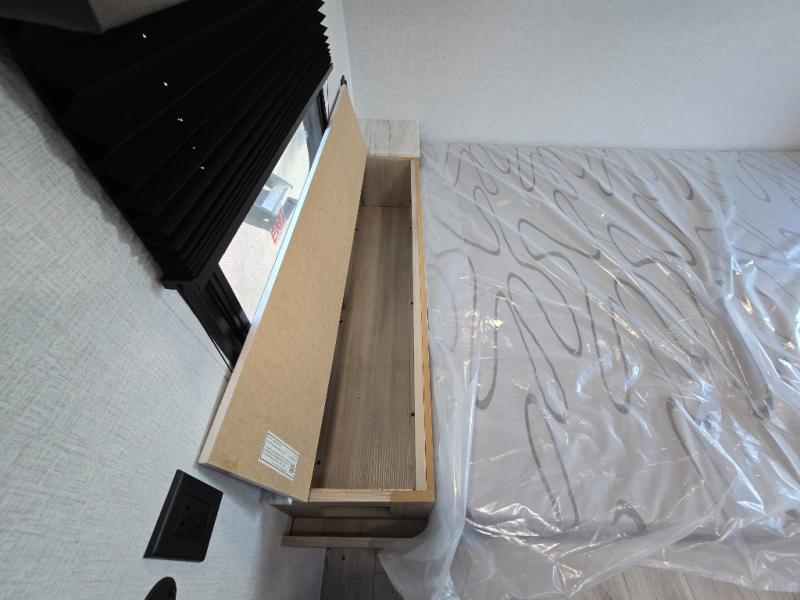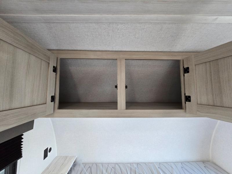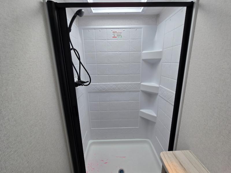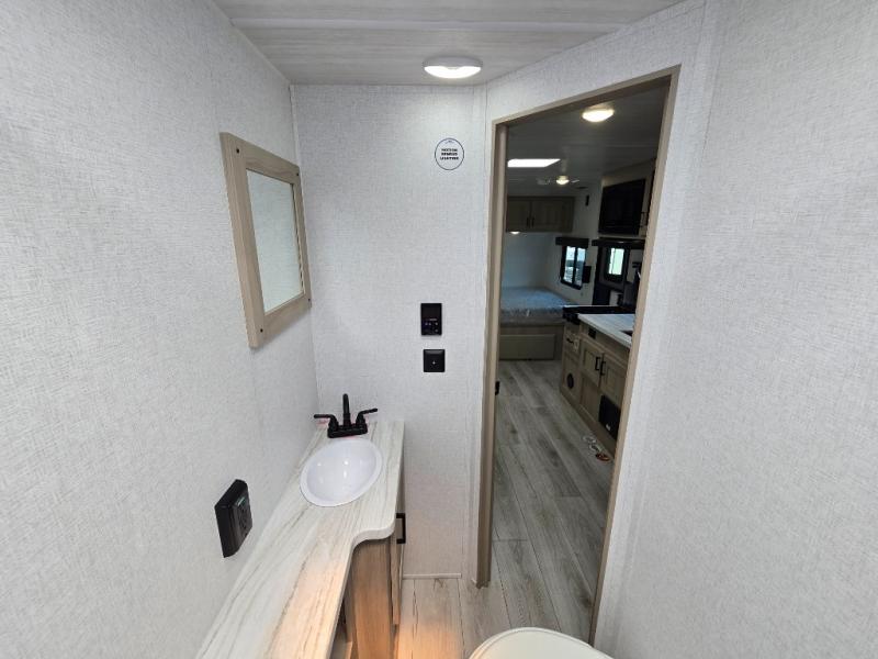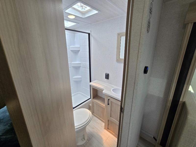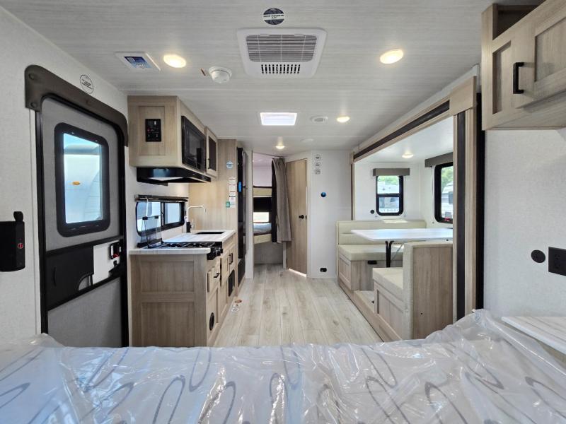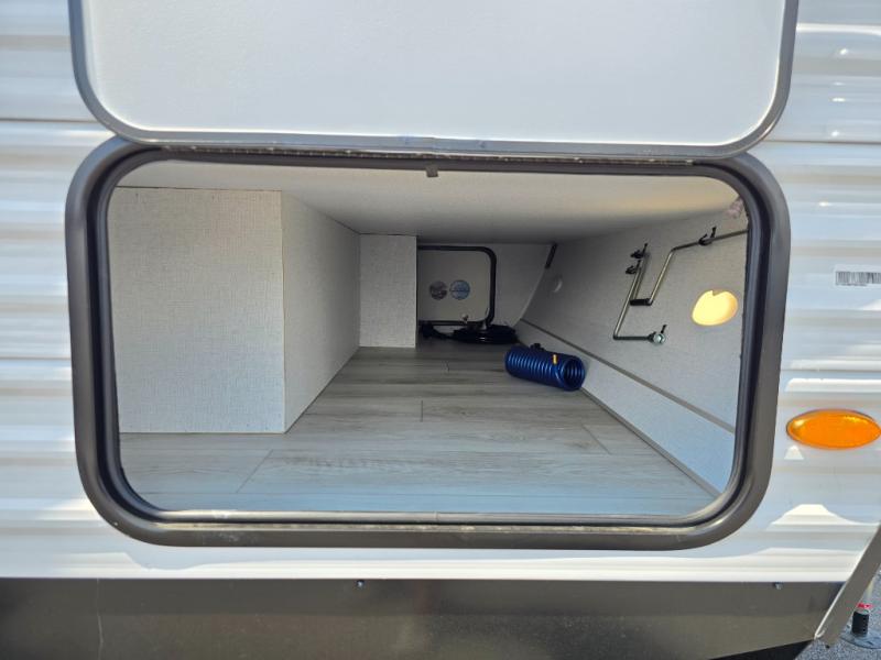 Offering a spacious and functional space for everyone, this travel trailer is perfect for road trips or camping excursions. It features double-sized bunks, providing a cozy sleeping spot for kids and a full bathroom, providing a convenient spot to freshen up after a long day of exploring. The kitchen is equipped with a refrigerator for keeping drinks and snacks fresh, a microwave for quick reheating, and a range with a glass top for preparing meals. Overhead cabinets provide ample storage for cookware and dishes, and the booth dinette provides a comfortable spot for meals and snacks or even an extra sleeping space. More sleeping space is provided by the front bed where you will find a queen-sized bed features a headboard with flip-up storage.