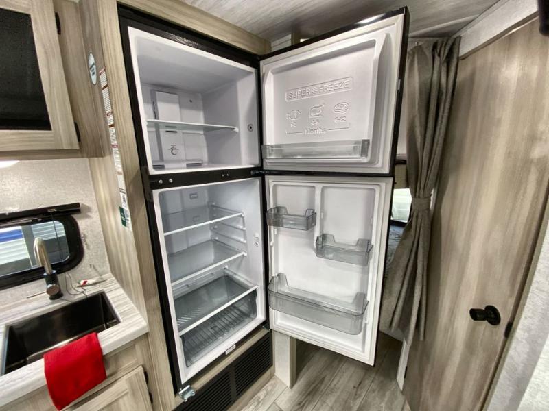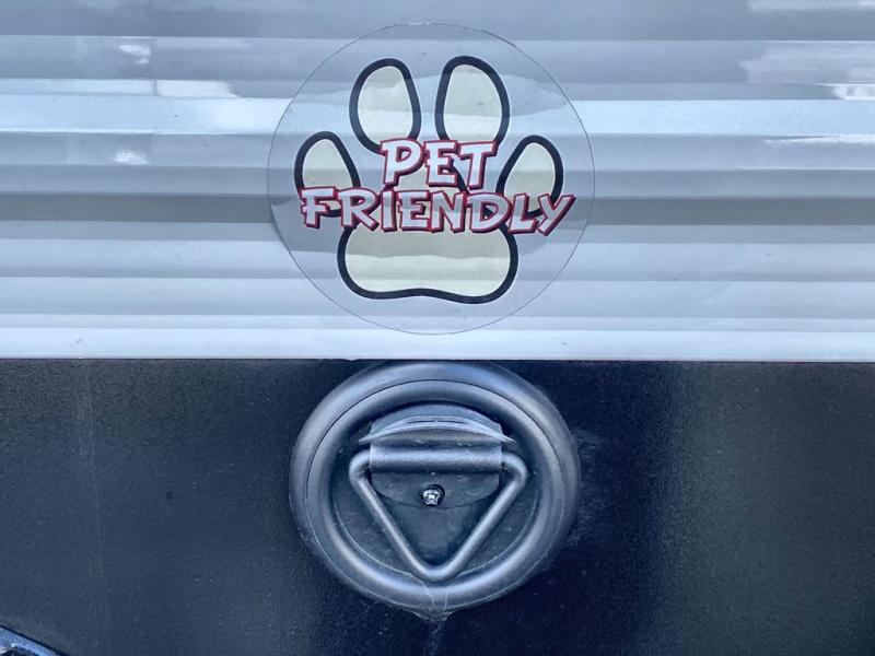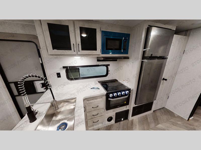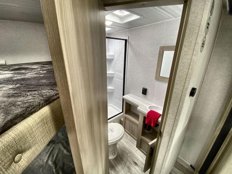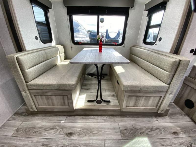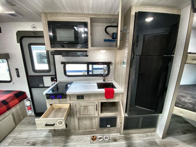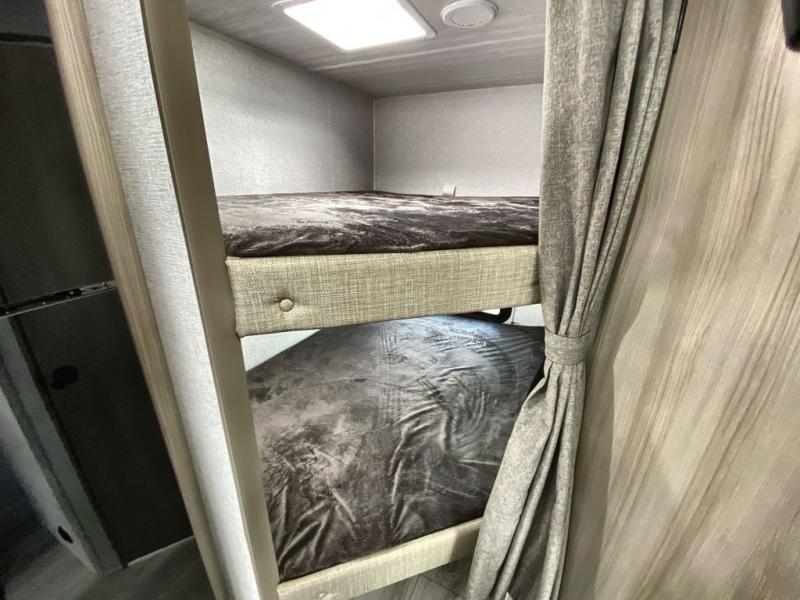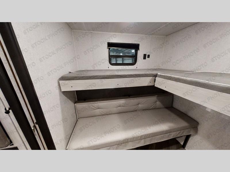 Offering a spacious and functional space for everyone, this travel trailer is perfect for road trips or camping excursions. It features double-sized bunks, providing a cozy sleeping spot for kids and a full bathroom, providing a convenient spot to freshen up after a long day of exploring. The kitchen is equipped with a refrigerator for keeping drinks and snacks fresh, a microwave for quick reheating, and a range with a glass top for preparing meals. Overhead cabinets provide ample storage for cookware and dishes, and the booth dinette provides a comfortable spot for meals and snacks or even an extra sleeping space. More sleeping space is provided by the front bed where you will find a queen-sized bed features a headboard with flip-up storage.
