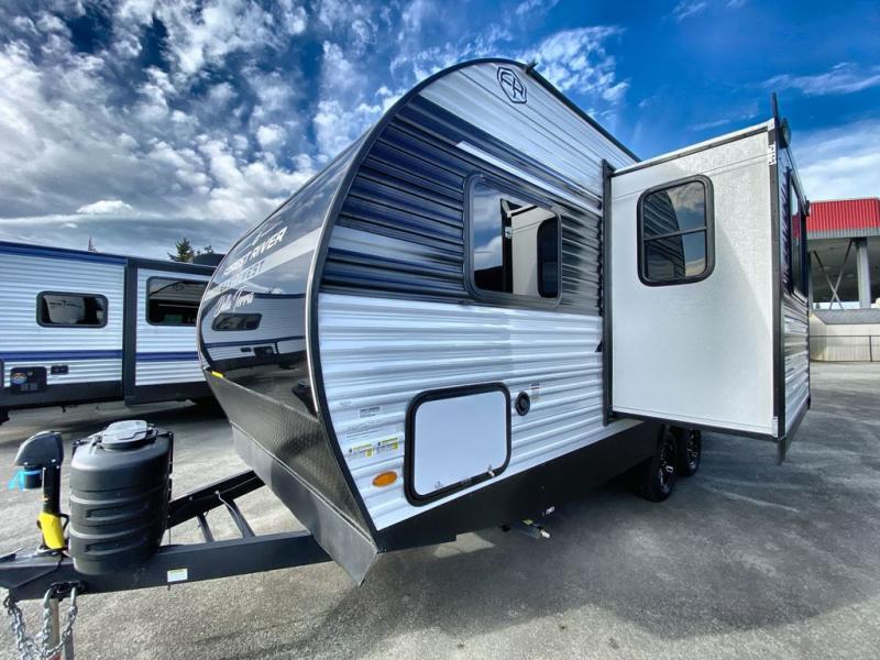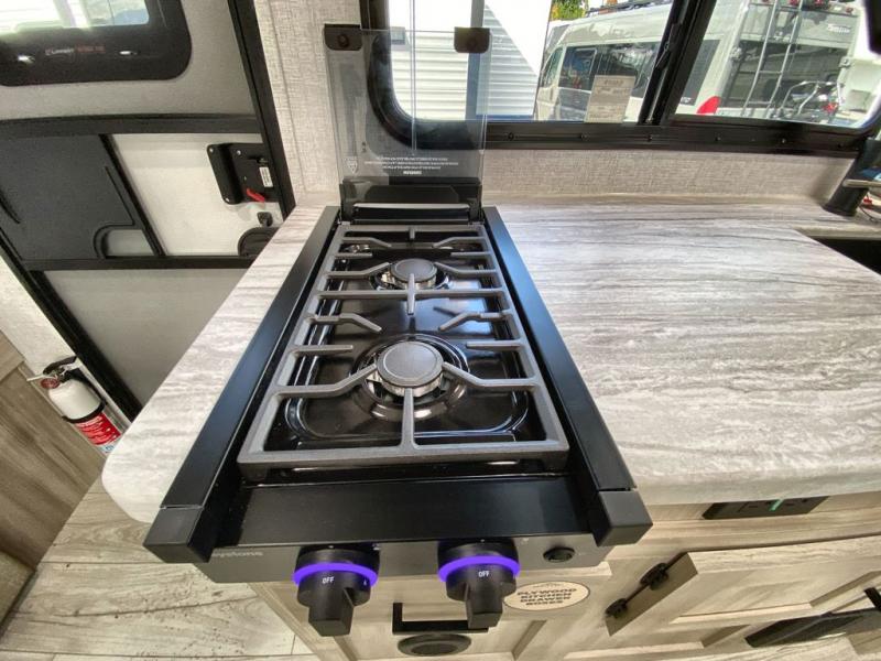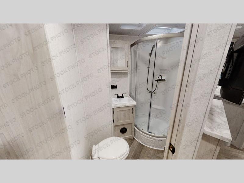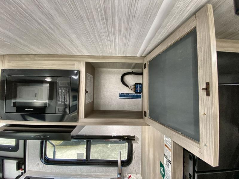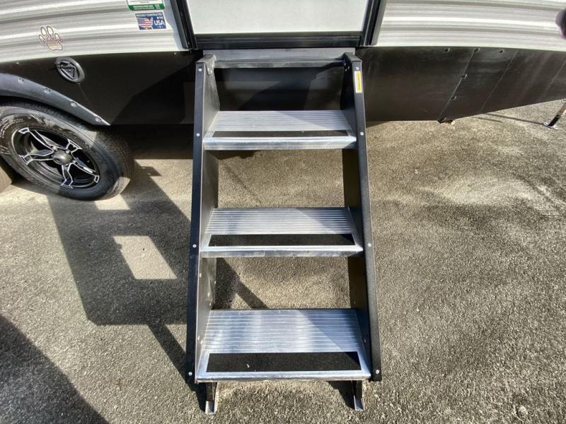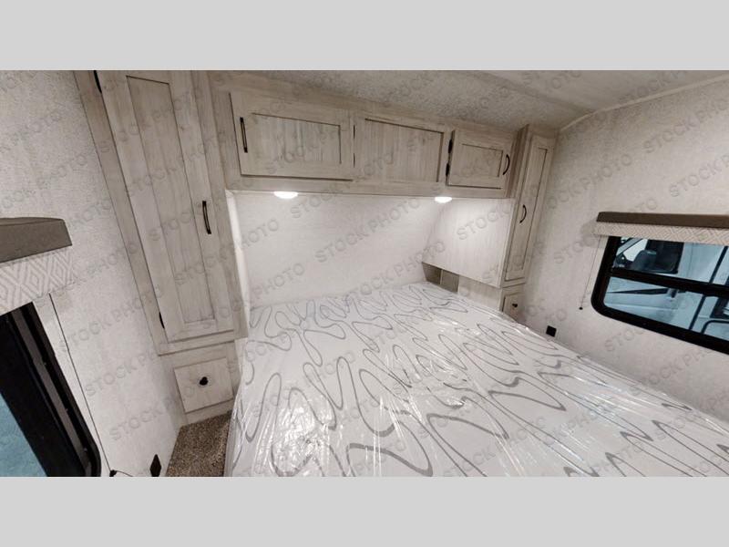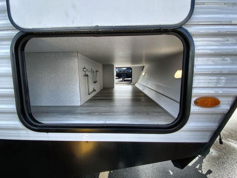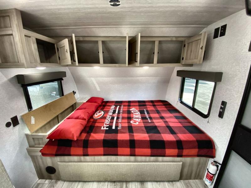 Offering a spacious and functional space for everyone, this travel trailer is perfect for road trips or camping excursions. It features double-sized bunks, providing a cozy sleeping spot for kids and a full bathroom, providing a convenient spot to freshen up after a long day of exploring. The kitchen is equipped with a refrigerator for keeping drinks and snacks fresh, a microwave for quick reheating, and a range with a glass top for preparing meals. Overhead cabinets provide ample storage for cookware and dishes, and the booth dinette provides a comfortable spot for meals and snacks or even an extra sleeping space. More sleeping space is provided by the front bed where you will find a queen-sized bed features a headboard with flip-up storage.
