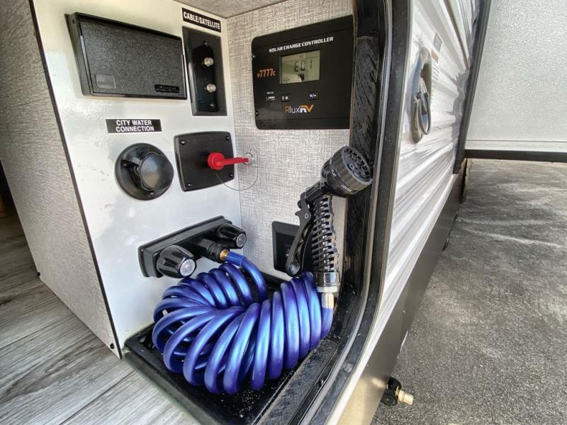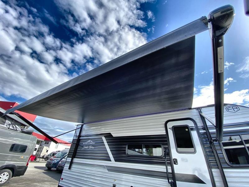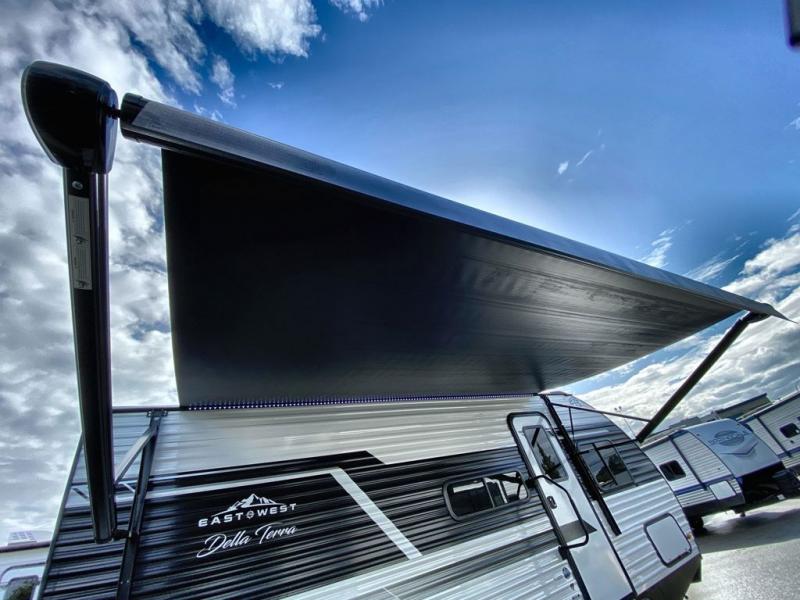 Each Della Terra travel trailer by EAST TO WEST is constructed with an enclosed and heated underbelly and enclosed holding tanks for added protection against the elements. There is also a power tongue jack with an LED light for easy set up and a power awning with LED lights you can rest under after you've unpacked. The Explore Comfort Package comes seamless pressed countertops, kitchen backsplash, window valance package with black night shades, and many more comforts. You will also appreciate the Adventure Outdoor Package with backup camera prep and solar prep, a tankless water heater, an RV grill quick disconnect, and a universal docking station with battery disconnect.