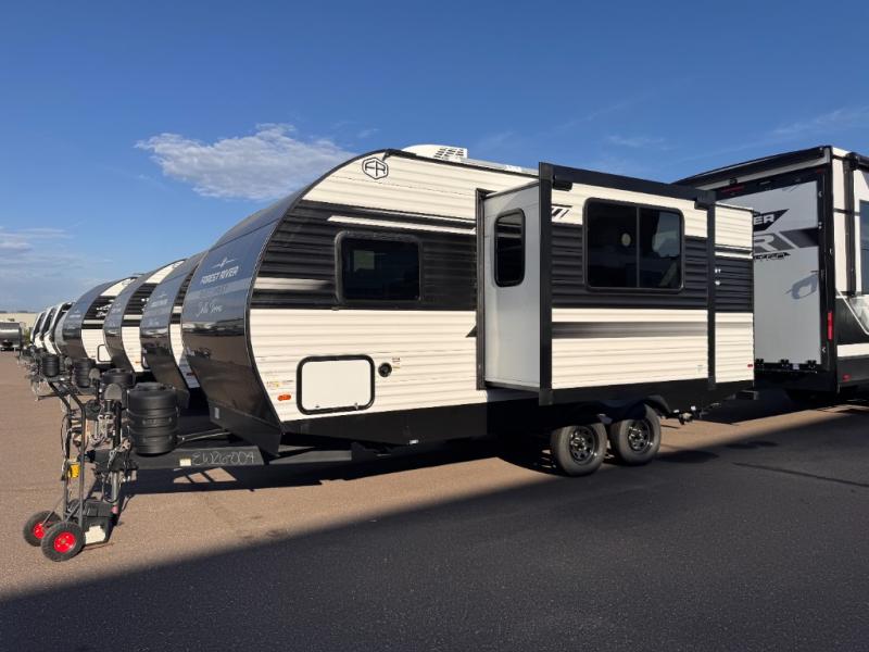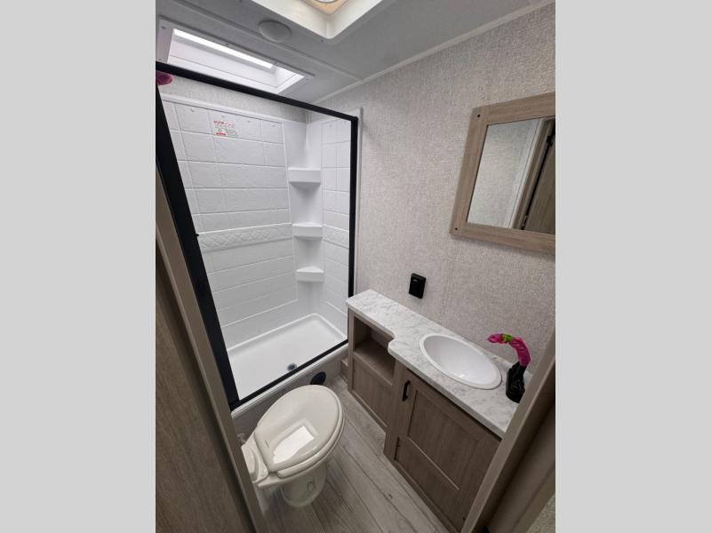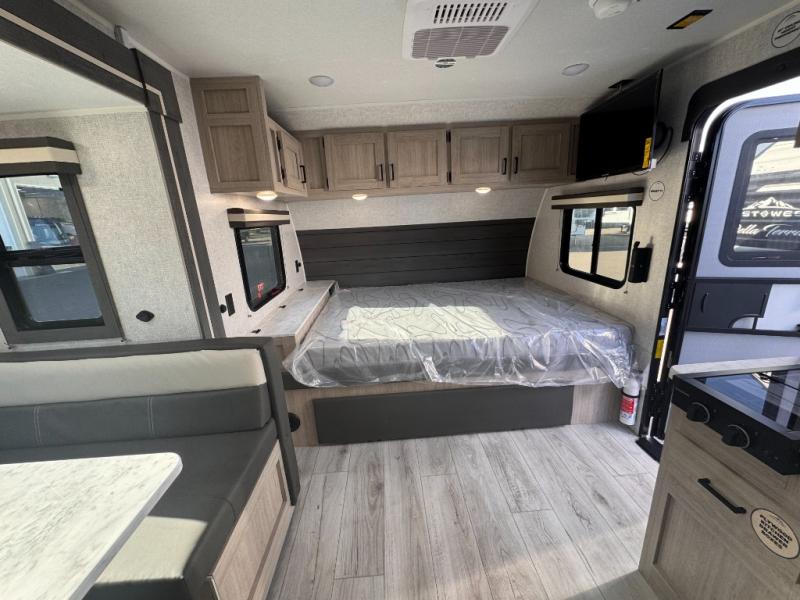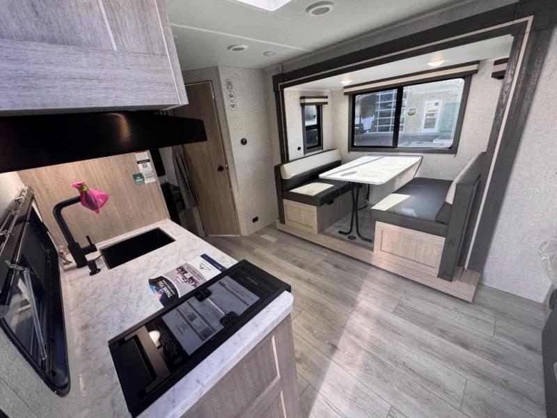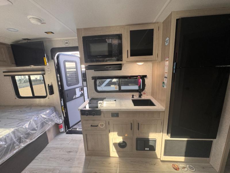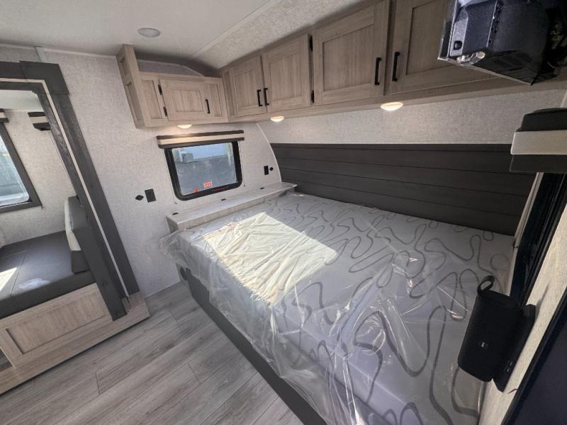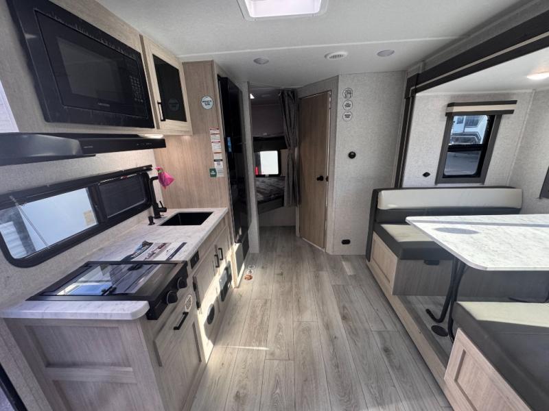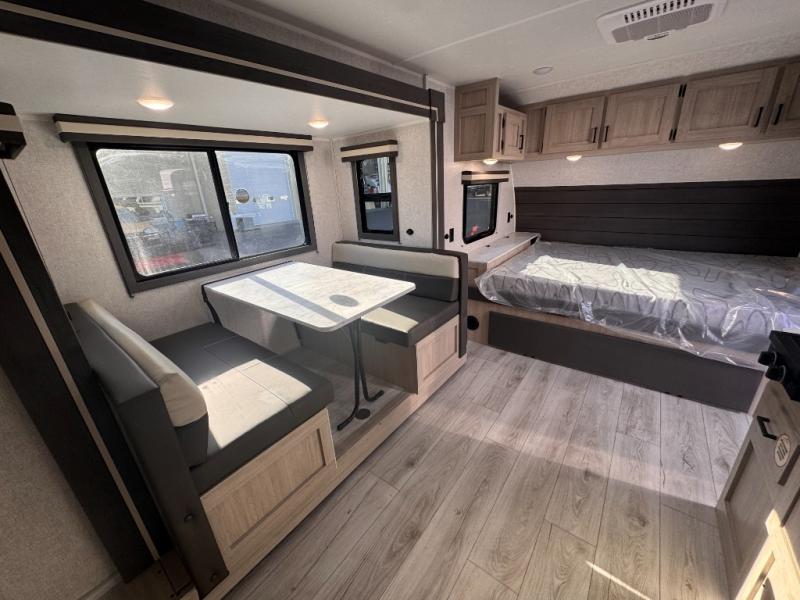 Offering a spacious and functional space for everyone, this travel trailer is perfect for road trips or camping excursions. It features double-sized bunks, providing a cozy sleeping spot for kids and a full bathroom, providing a convenient spot to freshen up after a long day of exploring. The kitchen is equipped with a refrigerator for keeping drinks and snacks fresh, a microwave for quick reheating, and a range with a glass top for preparing meals. Overhead cabinets provide ample storage for cookware and dishes, and the booth dinette provides a comfortable spot for meals and snacks or even an extra sleeping space. More sleeping space is provided by the front bed where you will find a queen-sized bed features a headboard with flip-up storage.