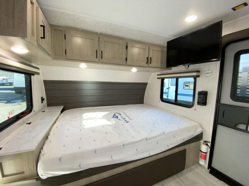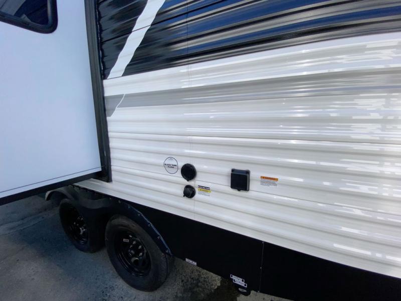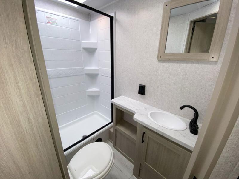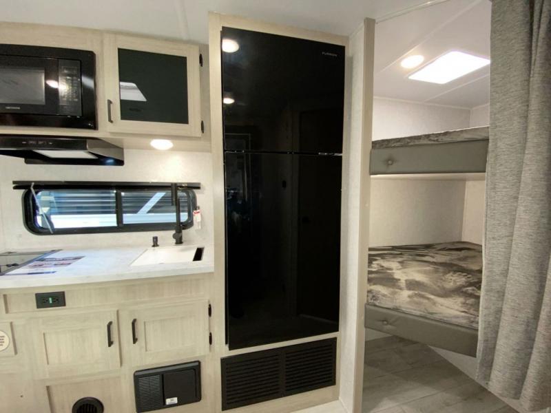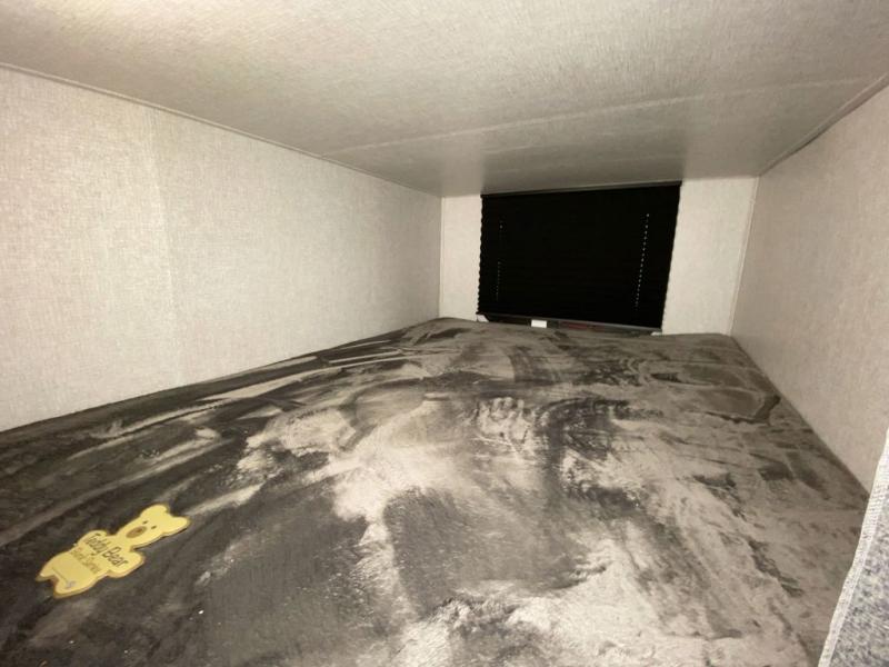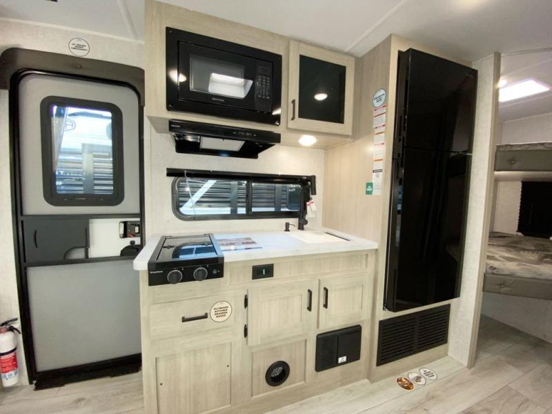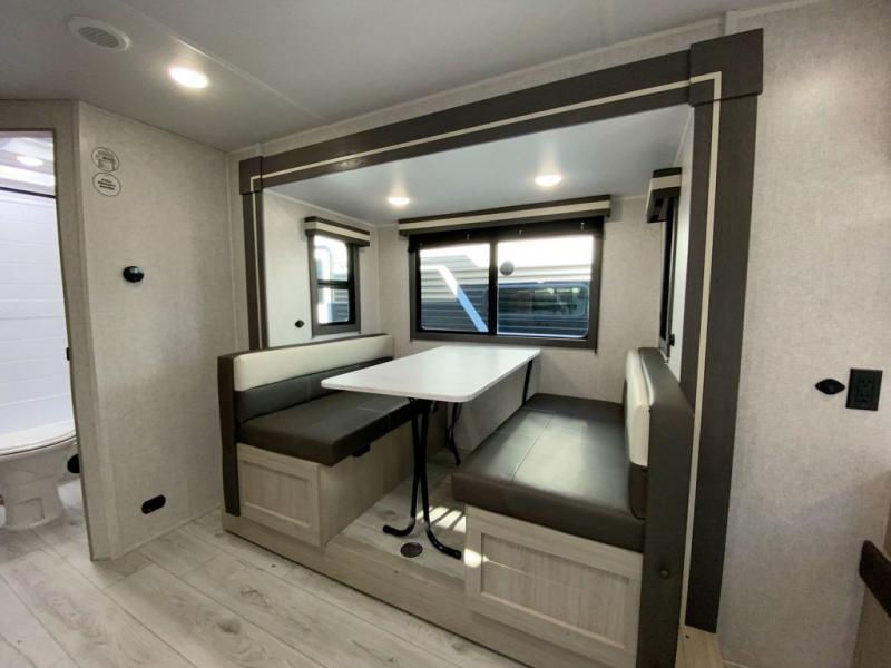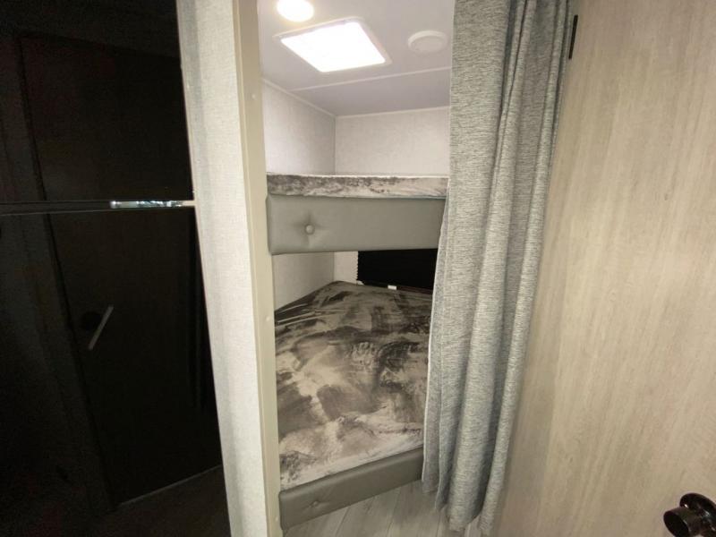 Offering a spacious and functional space for everyone, this travel trailer is perfect for road trips or camping excursions. It features double-sized bunks, providing a cozy sleeping spot for kids and a full bathroom, providing a convenient spot to freshen up after a long day of exploring. The kitchen is equipped with a refrigerator for keeping drinks and snacks fresh, a microwave for quick reheating, and a range with a glass top for preparing meals. Overhead cabinets provide ample storage for cookware and dishes, and the booth dinette provides a comfortable spot for meals and snacks or even an extra sleeping space. More sleeping space is provided by the front bed where you will find a queen-sized bed features a headboard with flip-up storage.
