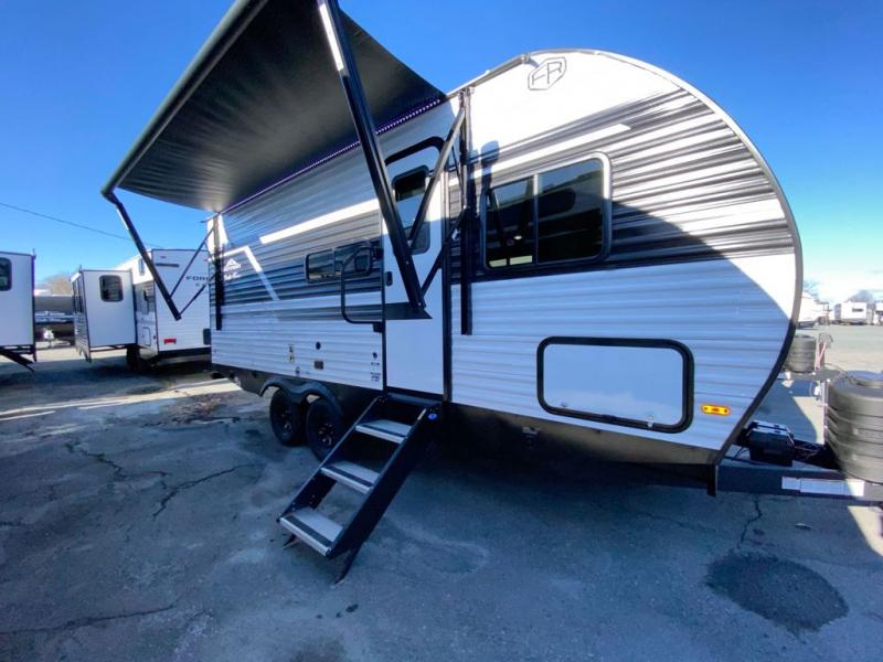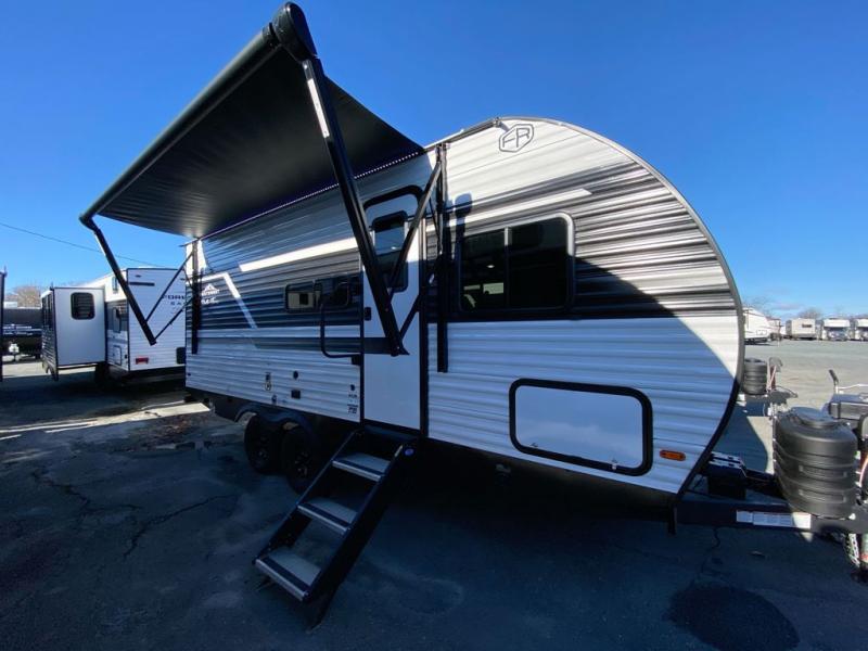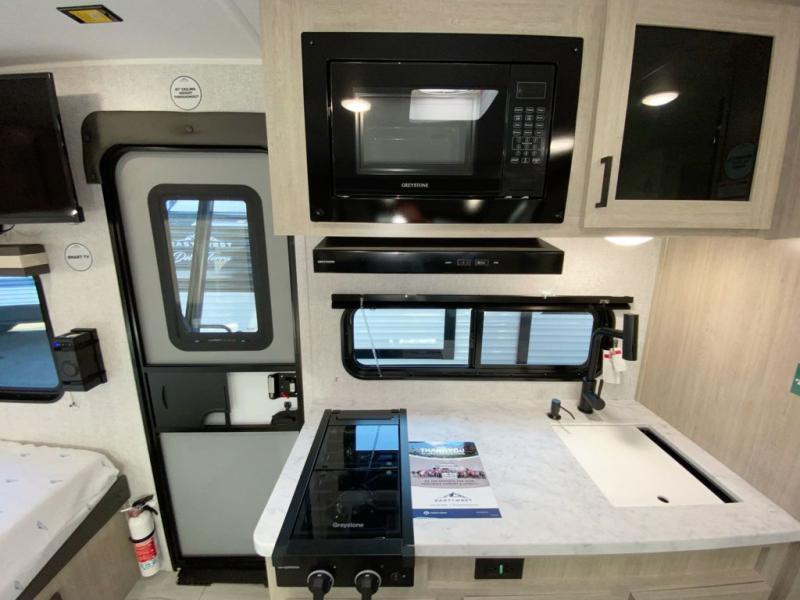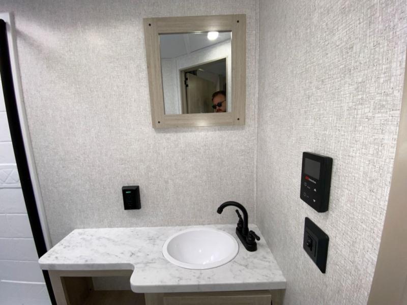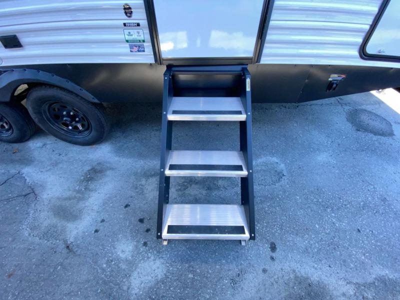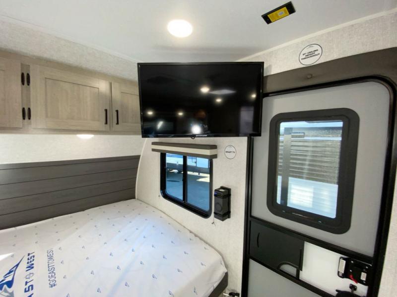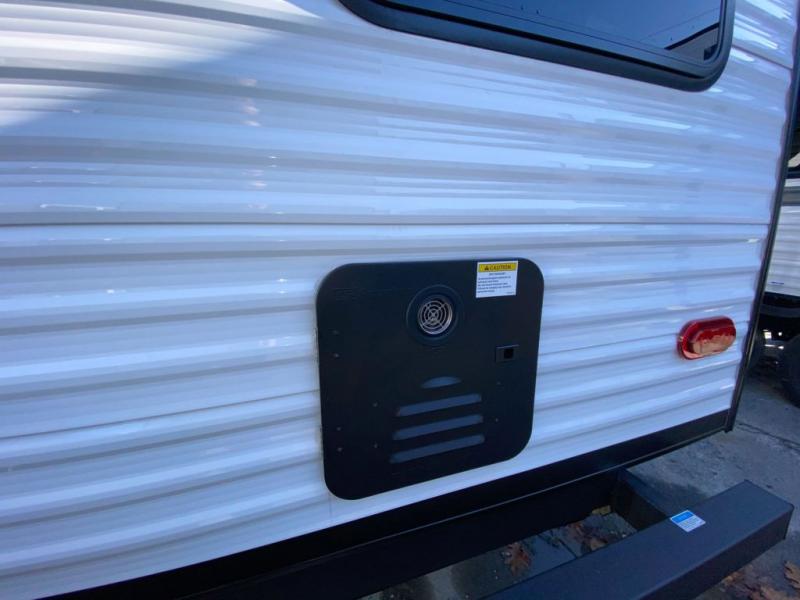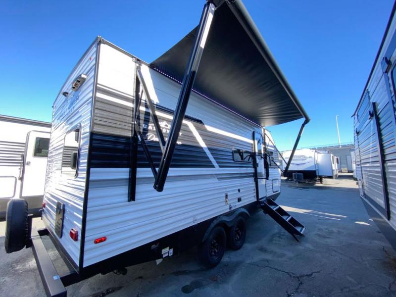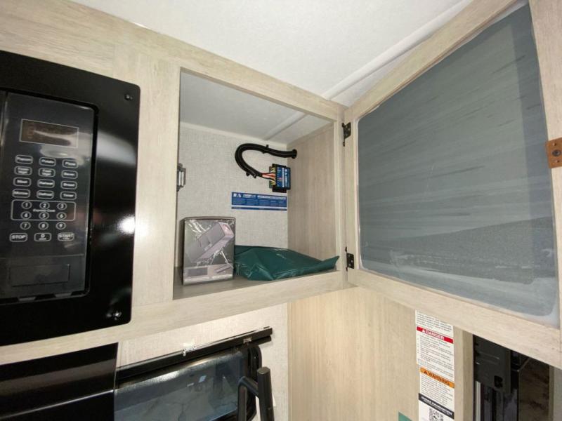 Offering a spacious and functional space for everyone, this travel trailer is perfect for road trips or camping excursions. It features double-sized bunks, providing a cozy sleeping spot for kids and a full bathroom, providing a convenient spot to freshen up after a long day of exploring. The kitchen is equipped with a refrigerator for keeping drinks and snacks fresh, a microwave for quick reheating, and a range with a glass top for preparing meals. Overhead cabinets provide ample storage for cookware and dishes, and the booth dinette provides a comfortable spot for meals and snacks or even an extra sleeping space. More sleeping space is provided by the front bed where you will find a queen-sized bed features a headboard with flip-up storage.