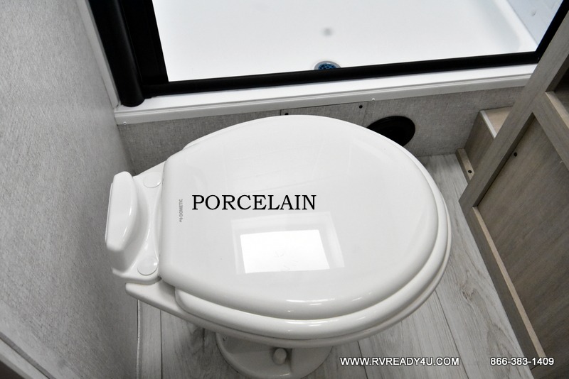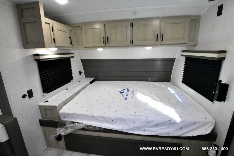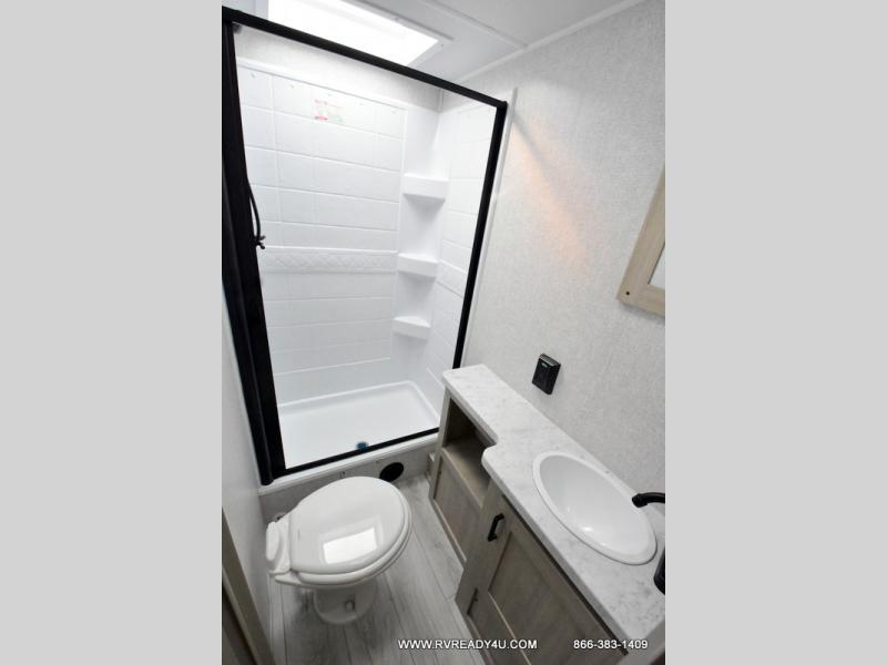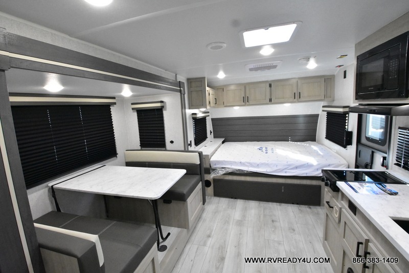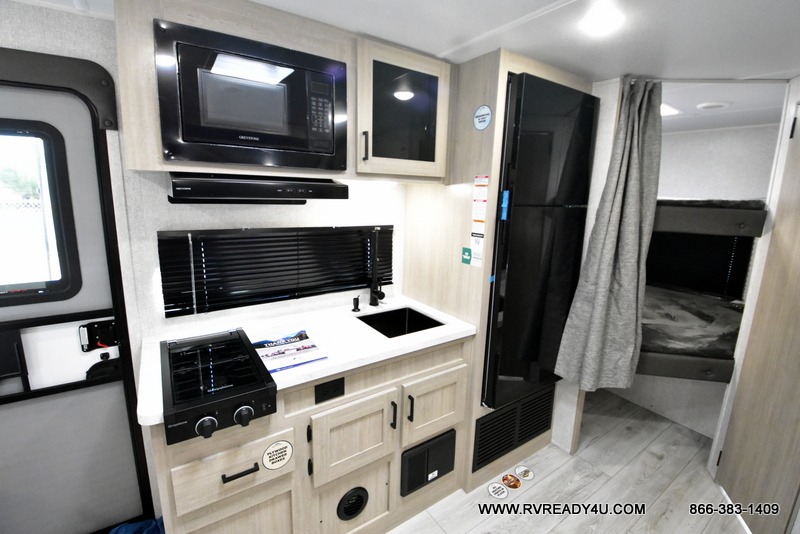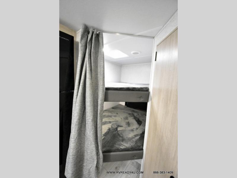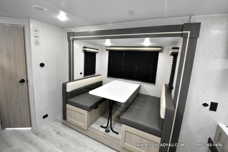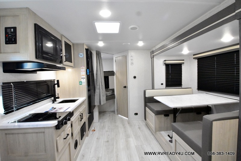 Offering a spacious and functional space for everyone, this travel trailer is perfect for road trips or camping excursions. It features double-sized bunks, providing a cozy sleeping spot for kids and a full bathroom, providing a convenient spot to freshen up after a long day of exploring. The kitchen is equipped with a refrigerator for keeping drinks and snacks fresh, a microwave for quick reheating, and a range with a glass top for preparing meals. Overhead cabinets provide ample storage for cookware and dishes, and the booth dinette provides a comfortable spot for meals and snacks or even an extra sleeping space. More sleeping space is provided by the front bed where you will find a queen-sized bed features a headboard with flip-up storage.