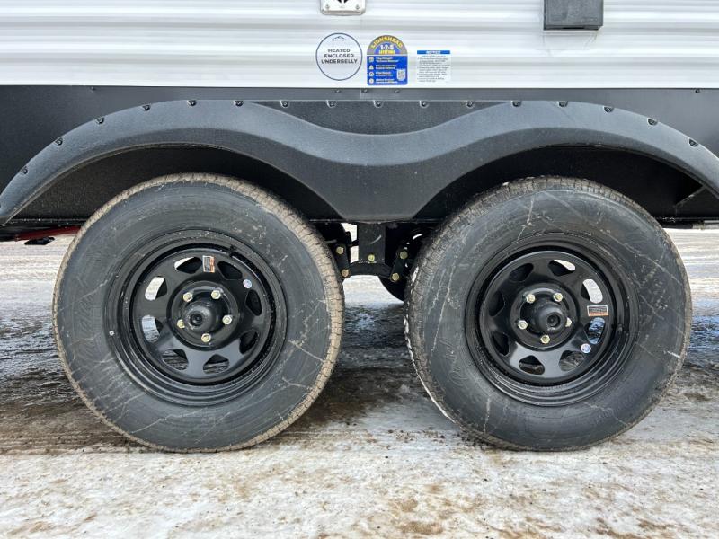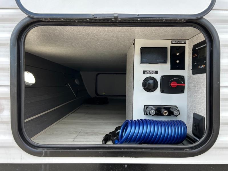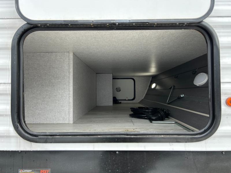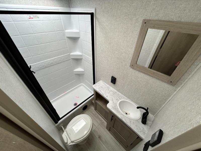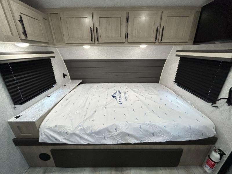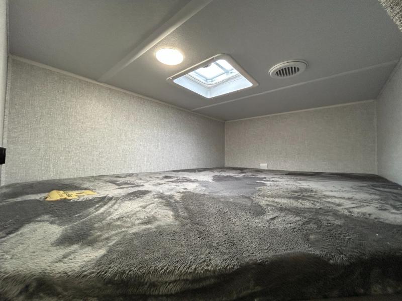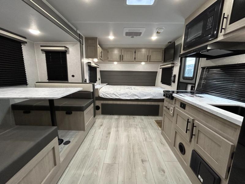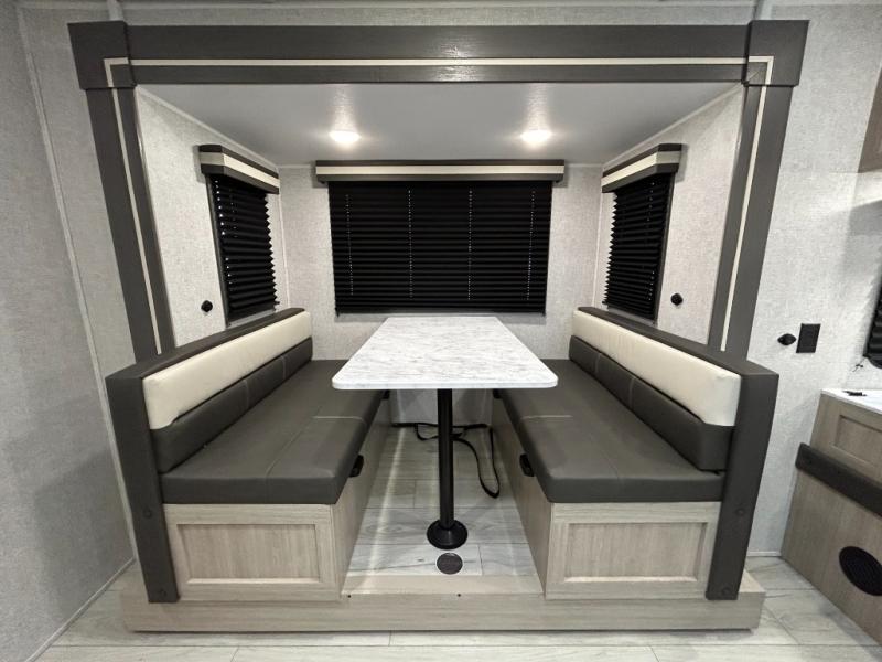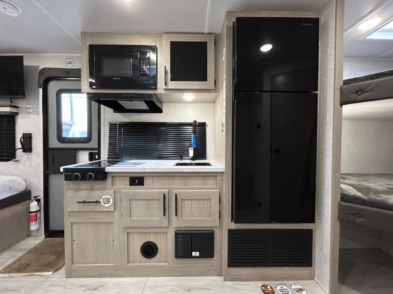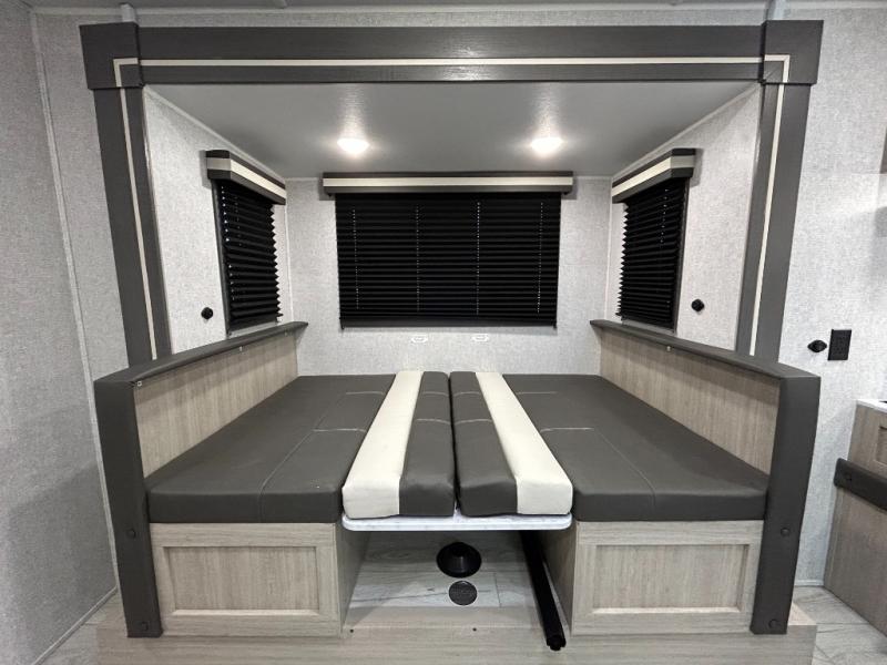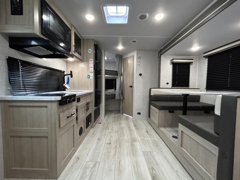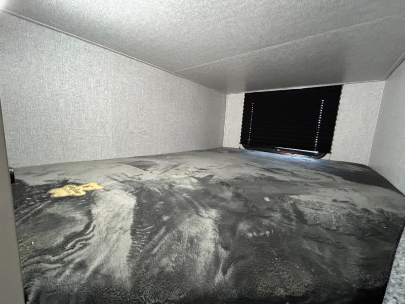 Offering a spacious and functional space for everyone, this travel trailer is perfect for road trips or camping excursions. It features double-sized bunks, providing a cozy sleeping spot for kids and a full bathroom, providing a convenient spot to freshen up after a long day of exploring. The kitchen is equipped with a refrigerator for keeping drinks and snacks fresh, a microwave for quick reheating, and a range with a glass top for preparing meals. Overhead cabinets provide ample storage for cookware and dishes, and the booth dinette provides a comfortable spot for meals and snacks or even an extra sleeping space. More sleeping space is provided by the front bed where you will find a queen-sized bed features a headboard with flip-up storage.