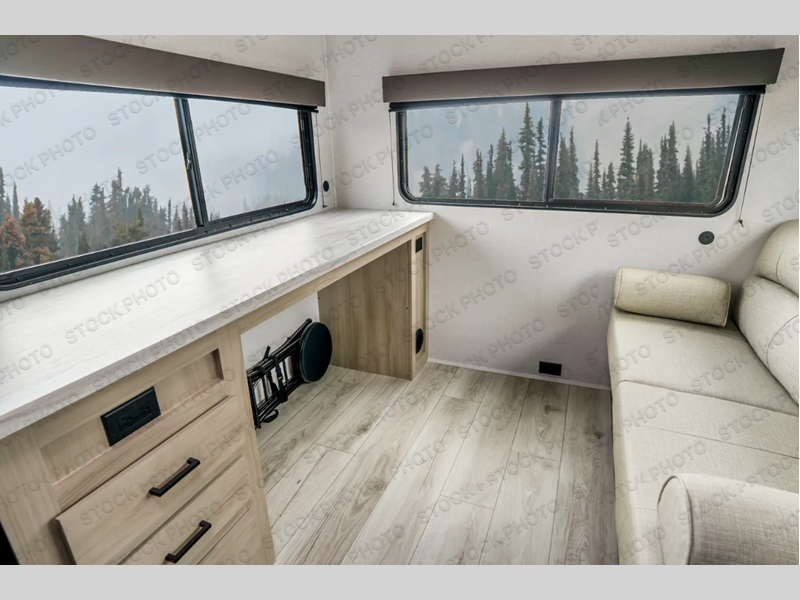 You will feel right at home in this travel trailer! For sleeping, there is a king-size bed with storage on both sides at the very front of this unit giving you privacy from the rest, and wardrobes on either side of the bed for your clothes. You will find storage beneath the bed for larger items or extra blankets, plus a space saving sliding door. The jiffy sofa and bar top with two bar stools offer comfortable seating as well as an extra sleeping space for an overnight guest, and the TV is a nice feature to enjoy on a rainy day. On the outside, an 16' awning provides a large outdoor living area protected from the elements, and the pass-through storage area will house all of your exterior gear like lawn chairs, outdoor games and rugs, plus so much more!